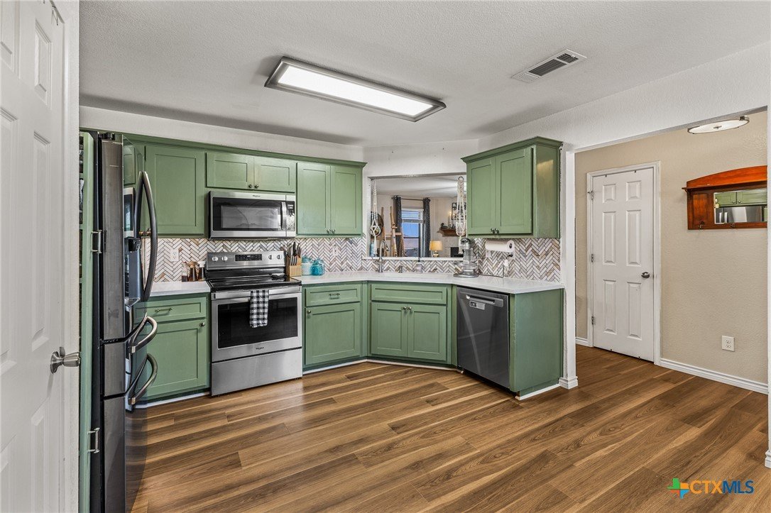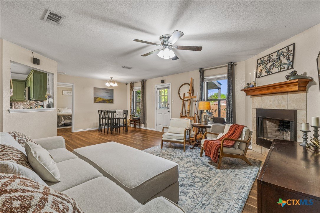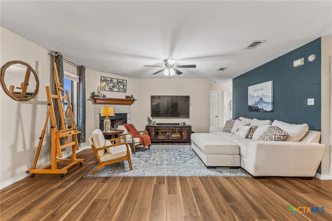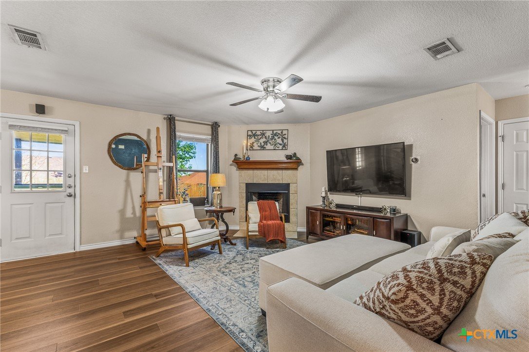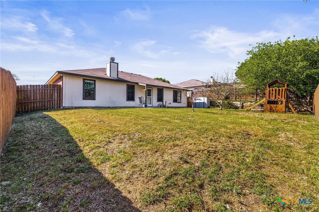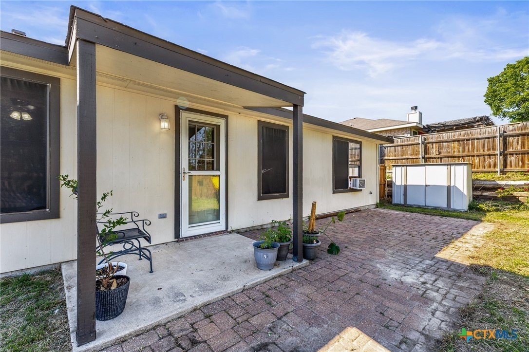 Updated and move-in ready 4 bedroom, 2 bath home with over 1,600 sqft and no carpet—luxury vinyl plank flooring runs throughout for a clean, low-maintenance feel. he living area centers around a cozy fireplace, while the kitchen stands out with quartz countertops, painted cabinetry, updated backsplash, and stainless appliances. Functional layout with good separation between spaces and flexibility for bedrooms, office, or guests. Primary suite includes a walk-in closet, and the additional bedrooms offer plenty of room to spread out. Out back, you’ll find a covered patio, storage shed, and a spacious yard with room to play or entertain. Conveniently located near shopping, dining, and a quick drive to Fort Hood.