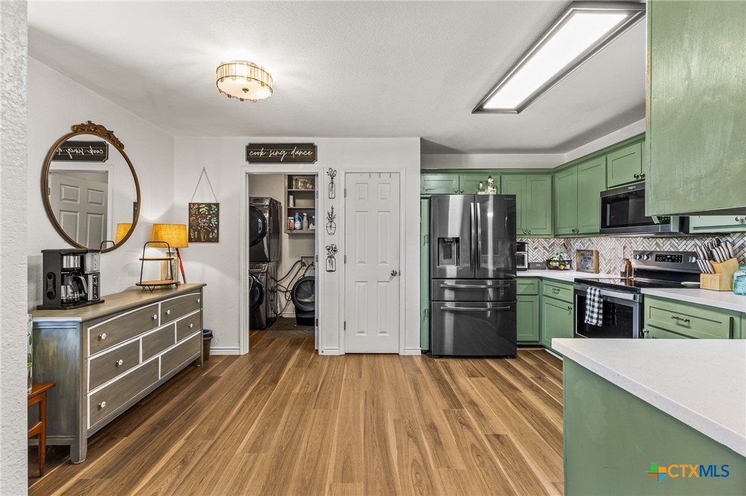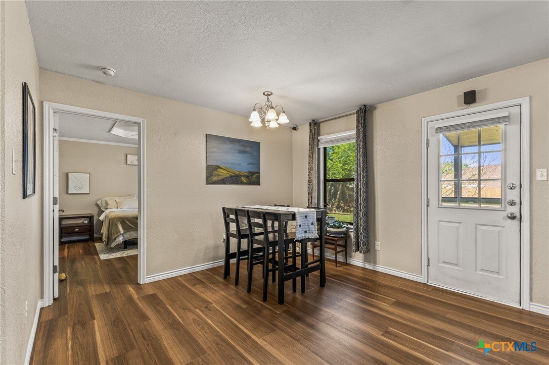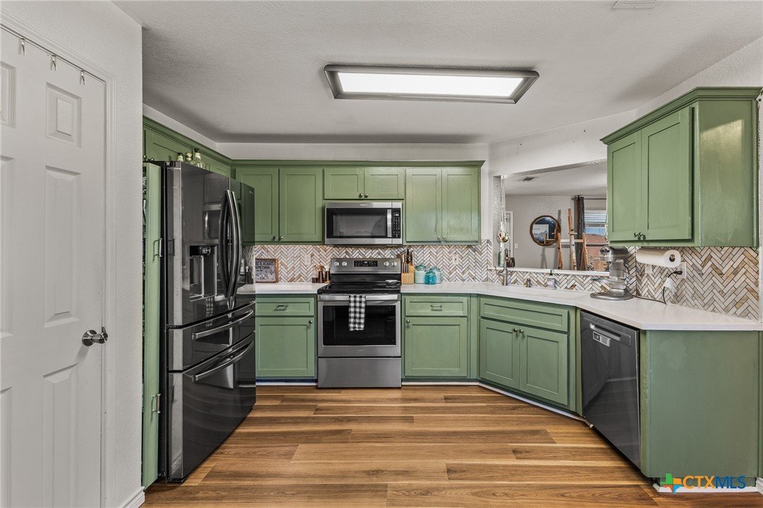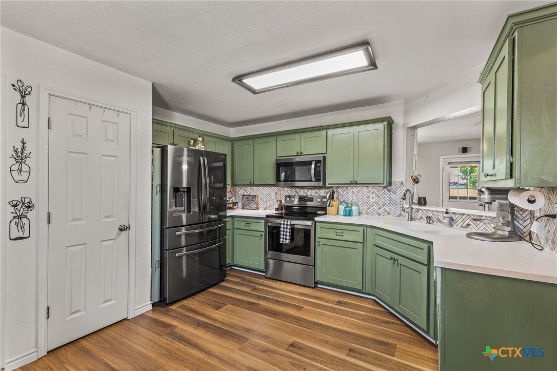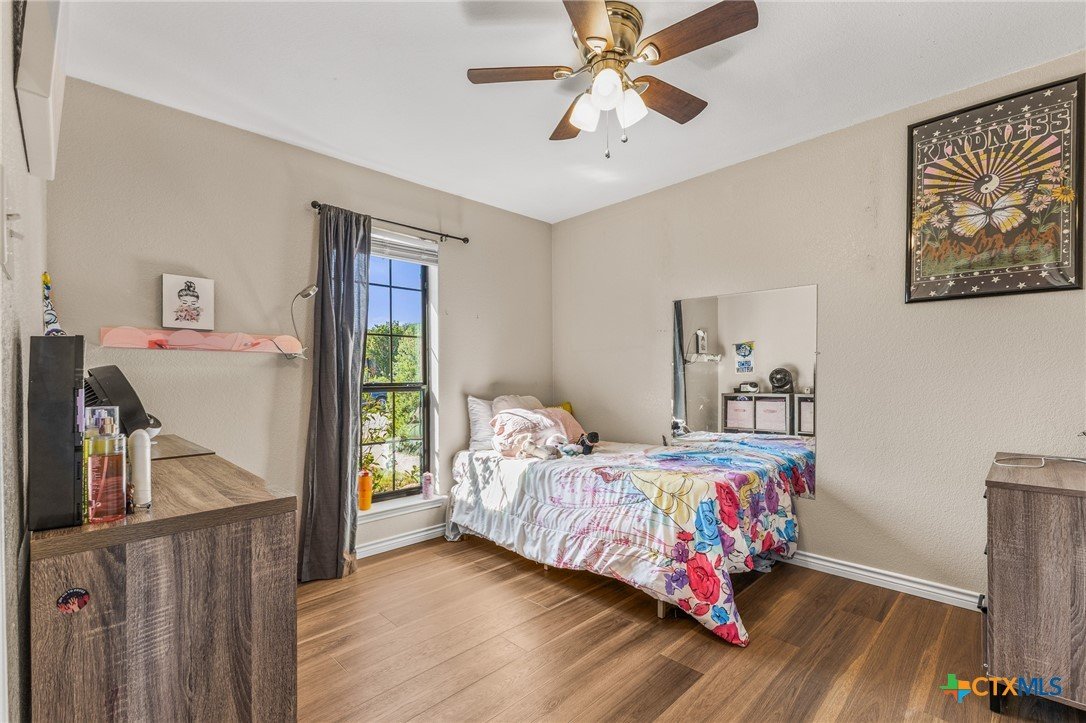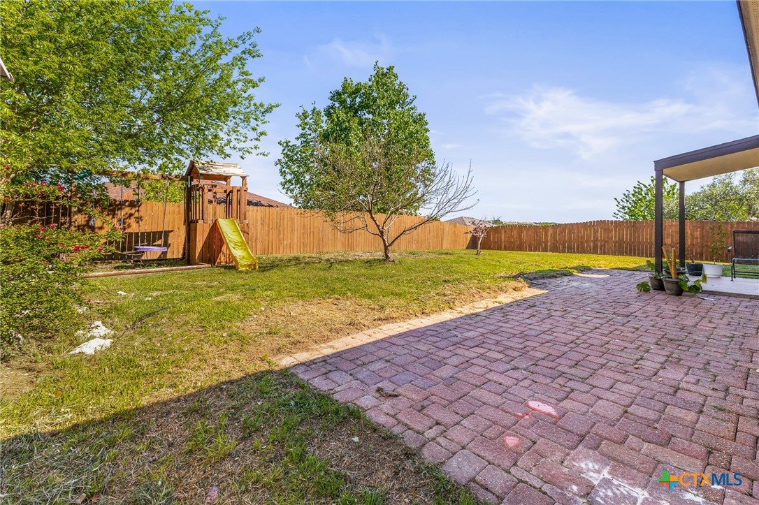 Updated and move-in ready 4 bedroom, 2 bath home with over 1,600 sqft and no carpet—luxury vinyl plank flooring runs throughout for a clean, low-maintenance feel. he living area centers around a cozy fireplace, while the kitchen stands out with quartz countertops, painted cabinetry, updated backsplash, and stainless appliances. Functional layout with good separation between spaces and flexibility for bedrooms, office, or guests. Primary suite includes a walk-in closet, and the additional bedrooms offer plenty of room to spread out. Out back, you’ll find a covered patio, storage shed, and a spacious yard with room to play or entertain. Conveniently located near shopping, dining, and a quick drive to Fort Hood.