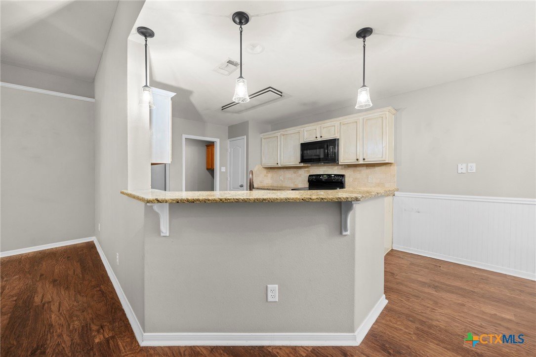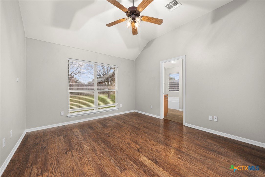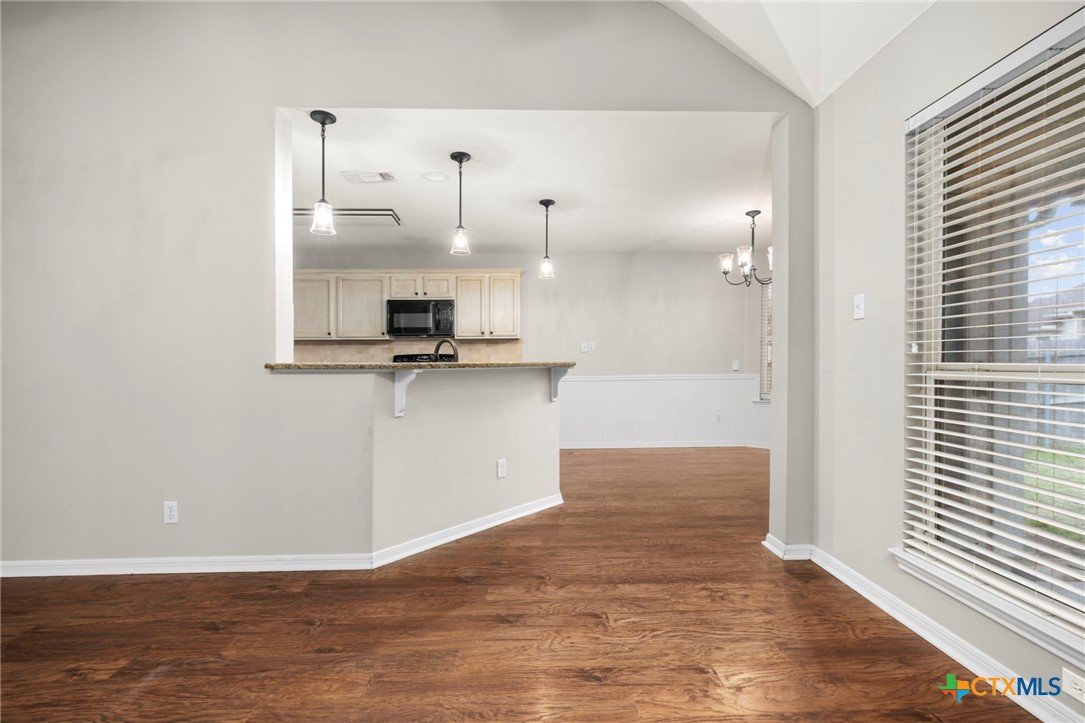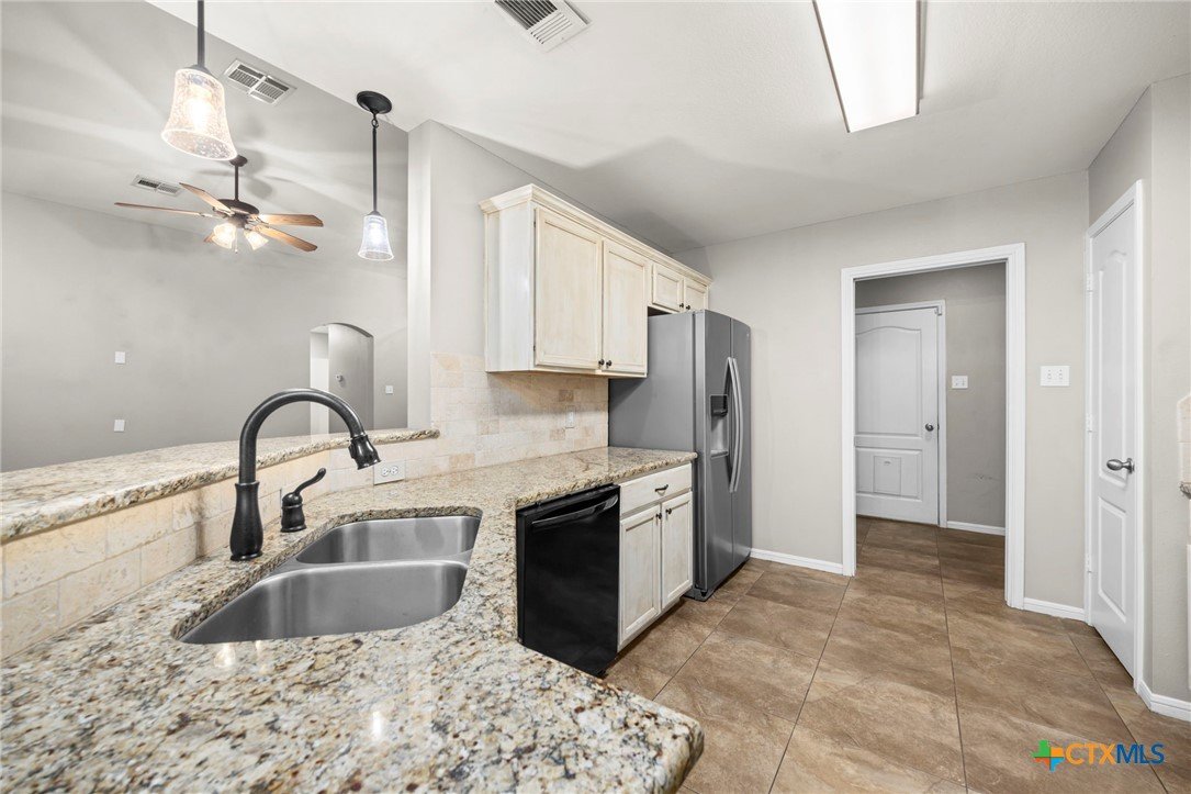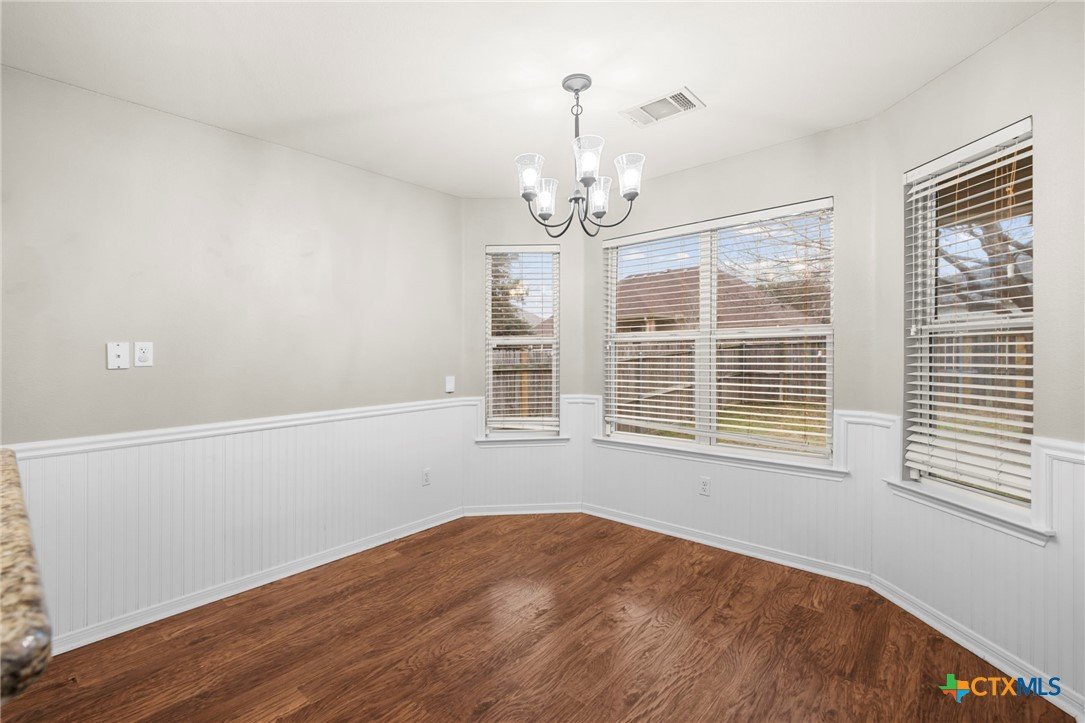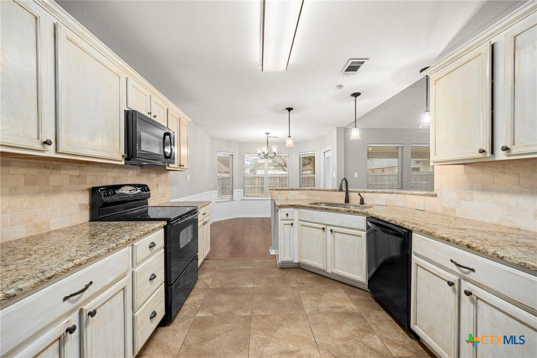 Single-story 3-bedroom, 2-bath home in Temple, zoned to Belton ISD, featuring a functional layout and well-maintained interior spaces. The main living area offers vaulted ceilings, wood-look flooring, and a fireplace, with natural light from multiple windows overlooking the backyard. The kitchen includes granite countertops, ample cabinet storage, and opening to the dining area for easy everyday use. A breakfast nook with bay-style windows provides additional dining space with backyard views. The primary bedroom includes an en-suite bath with dual vanities, soaking tub, separate shower, and walk-in closet. Secondary bedrooms are similarly finished with matching flooring and ceiling fans, offering flexibility for guest rooms, office space, or additional living needs. A covered back patio extends the living space outdoors, overlooking a fenced yard with room for pets, play, or outdoor projects. The home is located in an established neighborhood with community amenities and convenient access to schools, shopping, and major routes throughout Temple and the surrounding area.