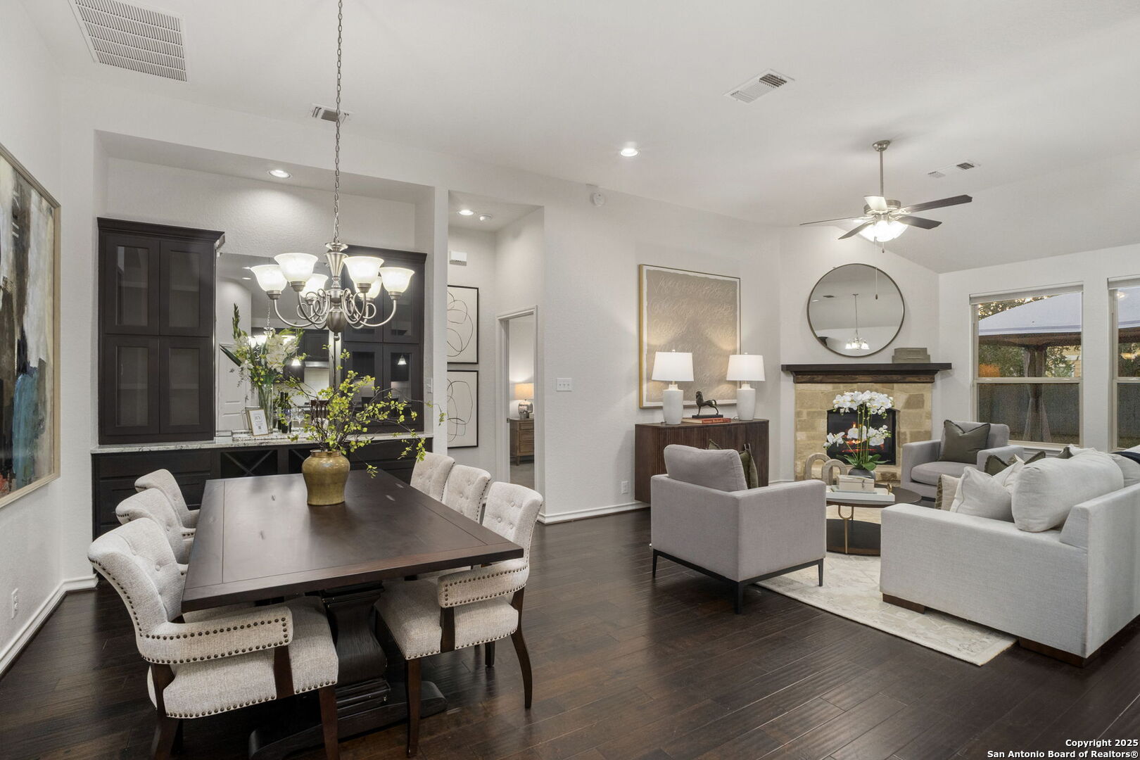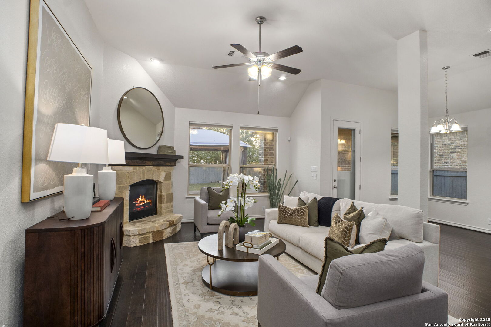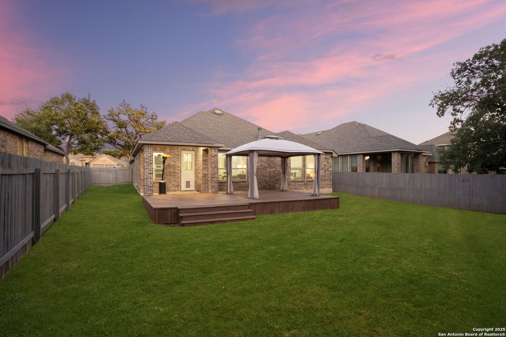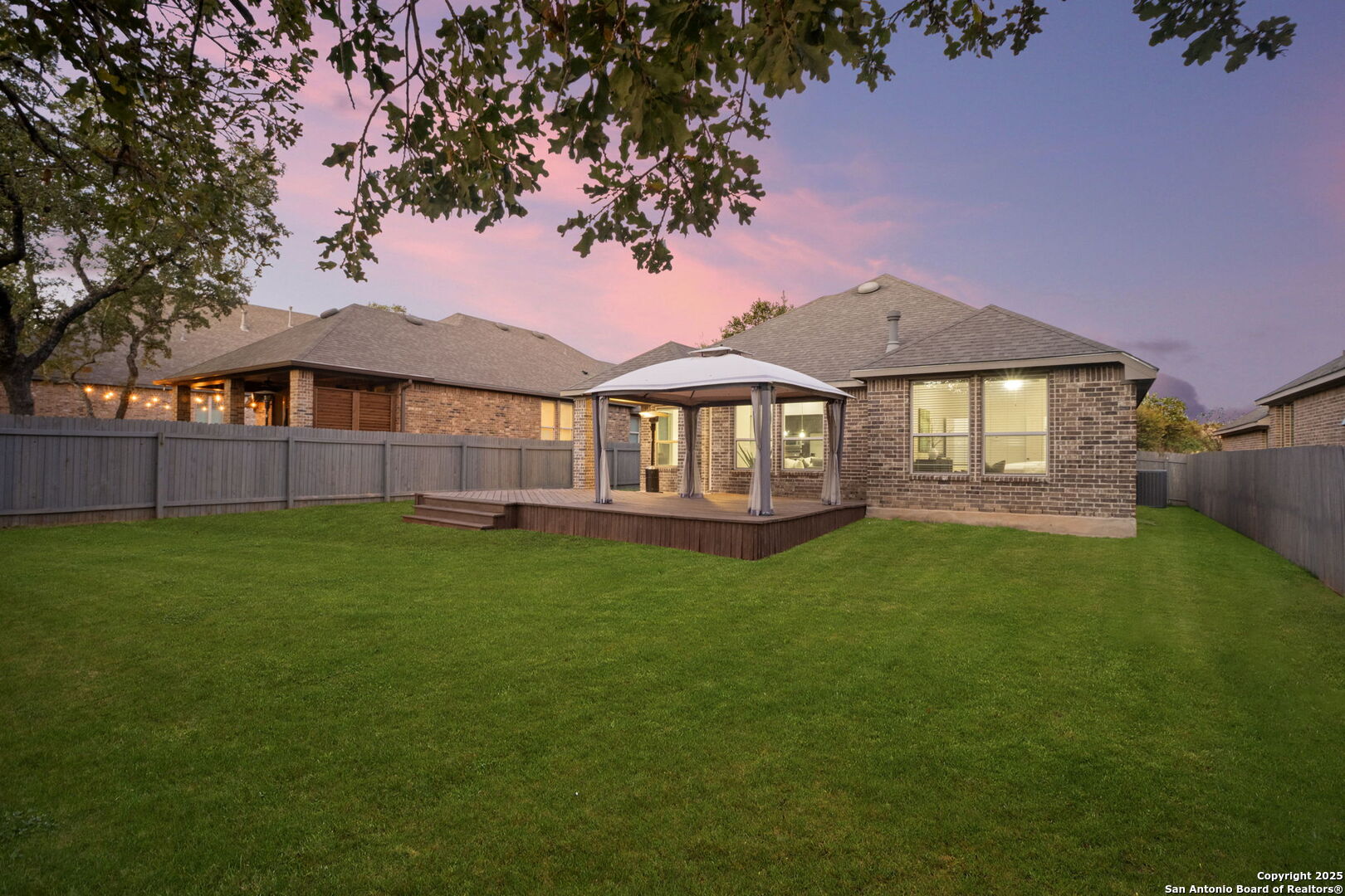 Move-in ready and located in the gated community of Ranches at Creekside, this beautifully maintained 4-bedroom, 3-bathroom home offers 2,442 square feet of thoughtfully designed living space. The open-concept floor plan features a spacious living room with a cozy fireplace, a dedicated office, and a formal dining room with custom built-in cabinetry and buffet. The updated kitchen is a chef's dream with gas cooking, stylish finishes, and seamless flow into the main living area-perfect for entertaining family and friends. The master suite provides a peaceful retreat with a spa-inspired bathroom that includes double vanities, a makeup counter, a soaking tub, and a separate shower. Enjoy outdoor living on the covered patio and expansive deck with a shaded sitting area, ideal for relaxing or hosting gatherings. Freshly painted with professionally cleaned carpets, this home is truly move-in ready. Residents of Ranches at Creekside enjoy exclusive access to a community pool, playground, and a welcoming neighborhood atmosphere. Conveniently located just minutes from downtown Boerne, this property offers easy access to top-rated Boerne ISD schools, local shopping, dining, and all the charm of the Texas Hill Country.