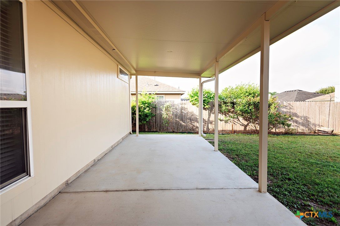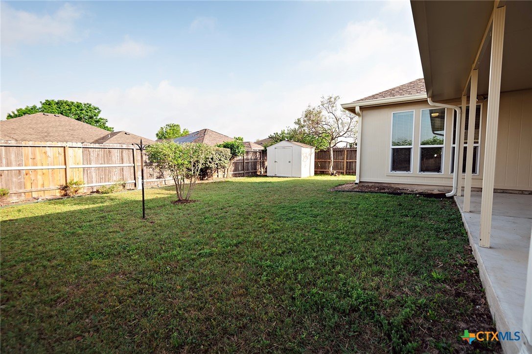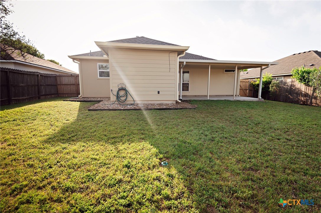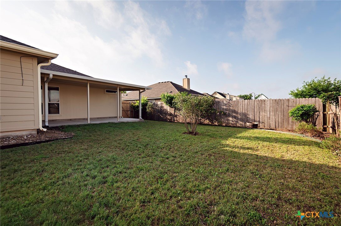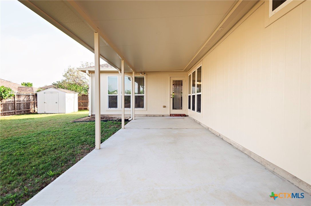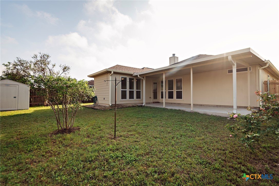 Charming and move-in ready, this 4-bedroom, 2-bath home with a 2-car garage offers 1,541 square feet of comfortable living space in a great neighborhood with convenient access to IH-35. Perfect for first-time buyers or those looking to downsize, this home features a smart layout with maximized living spaces and an additional kickout area ideal for extra dining, a home office, crafting space, or cozy sitting area. Fresh interior and exterior paint, along with all newly installed carpeting, give the home a clean and updated feel. The spacious primary suite includes a private bath with double sinks and a relaxing garden tub. Step outside to enjoy the large covered patio and fenced backyard, complete with a storage building for added convenience. A wonderful opportunity to own a versatile and well-maintained home in a prime location!