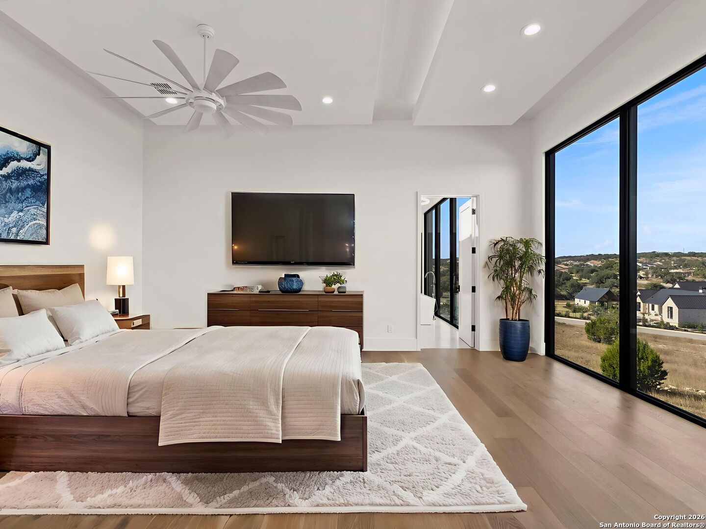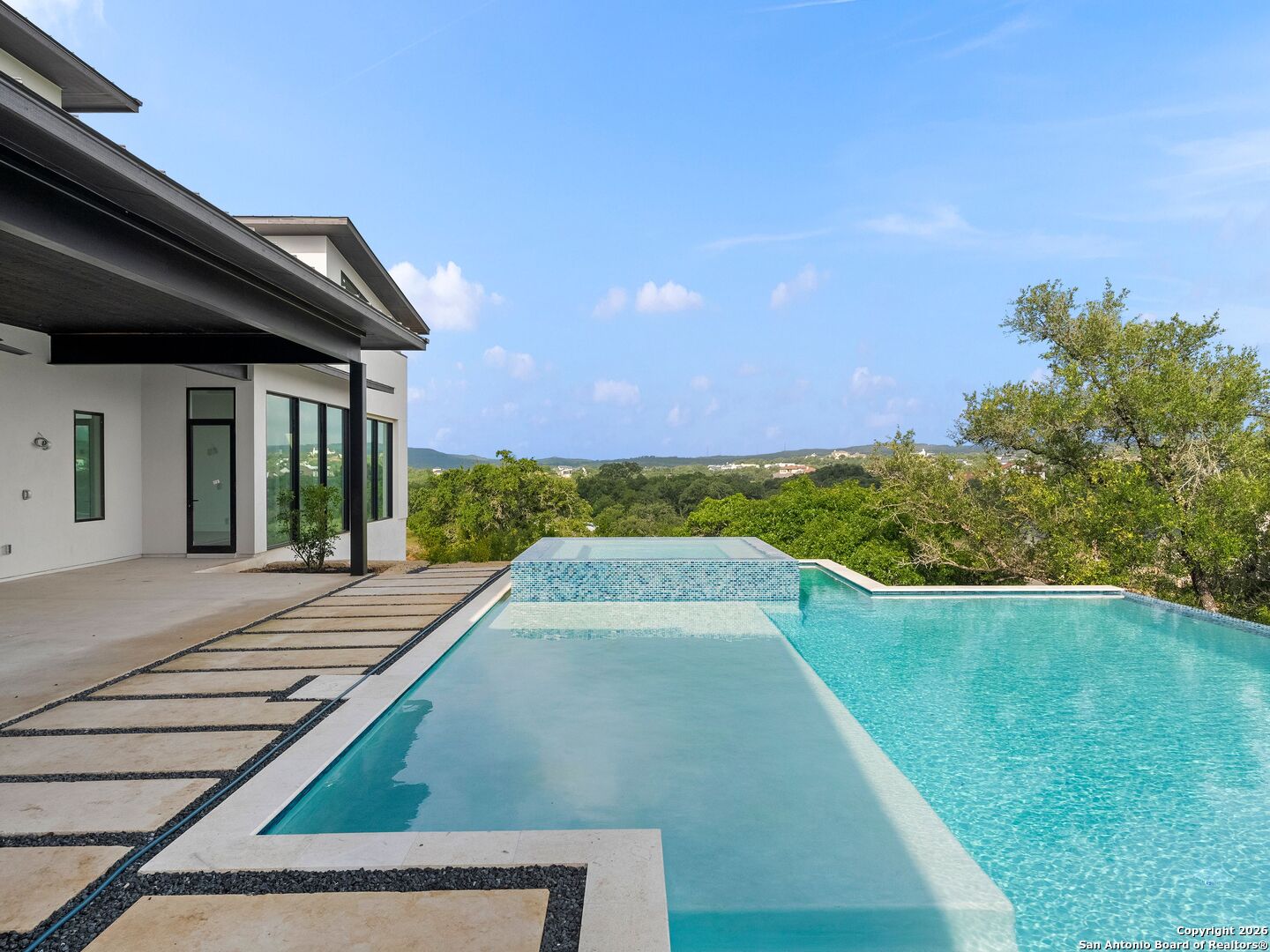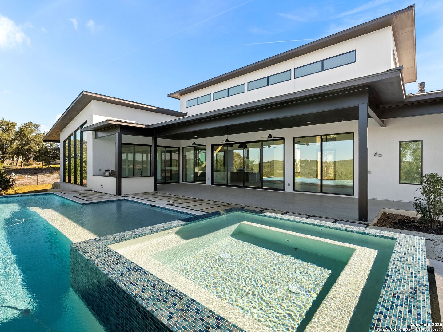 Open House Sunday, Jan 11th! Set on a Hill Country site in Boerne's Pecan Springs, this expansive single-story estate pairs striking architectural design with everyday livability. Designed by Oscar E. Flores and built by Pulliam Custom Homes, the home features steel construction and walls of floor-to-ceiling glass that flood the interiors with natural light and create a seamless indoor-outdoor flow. The open living area is anchored by soaring ceilings and generous, connected spaces. The kitchen features an oversized island, top-of-the-line Thermador appliances, gas cooking with pot filler, double ovens, Naica quartzite countertops, a spacious walk-in pantry, and extensive custom cabinetry. It opens to a glass-wrapped living room with sweeping Hill Country views. A retractable glass wall connects to the outdoor living area with pool, spa, covered dining space, gas grill, and professionally landscaped grounds. All four bedrooms are privately positioned with en-suite baths. The primary suite offers two custom closets, dual water closets, and private outdoor access. Designed for entertaining, the game room includes dual wine refrigerators, prep sink, custom cabinetry, and a dedicated powder bath. Flexible spaces include a defined office and an exercise room with a full bath and cold plunge. Additional highlights include an oversized utility room, built-in mudroom, ample storage, foam insulation, energy-efficient Daikin HVAC systems, and whole-home wiring for audio and security. The four-car garage features epoxy floors, high ceilings, LED lighting, and a dedicated storage room - an ideal garage for vehicles and recreational gear alike. Refined finishes, a thoughtful layout, and panoramic Hill Country views complete this impressive estate.