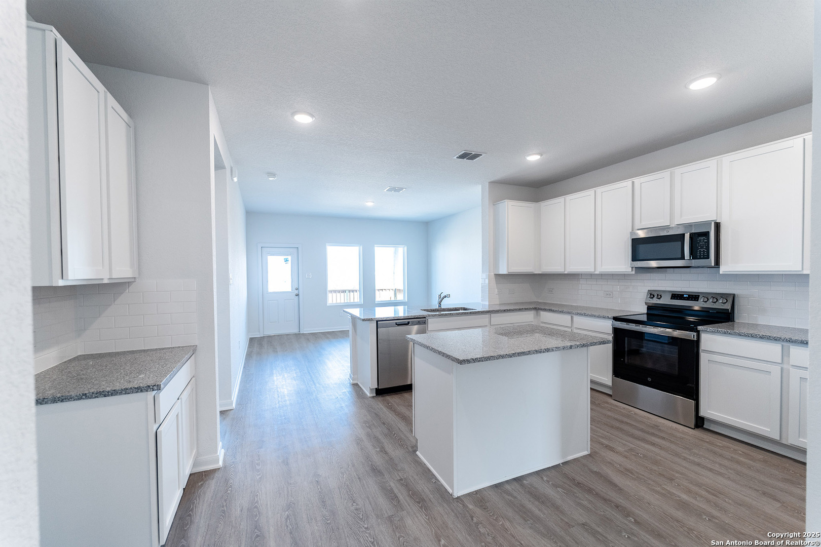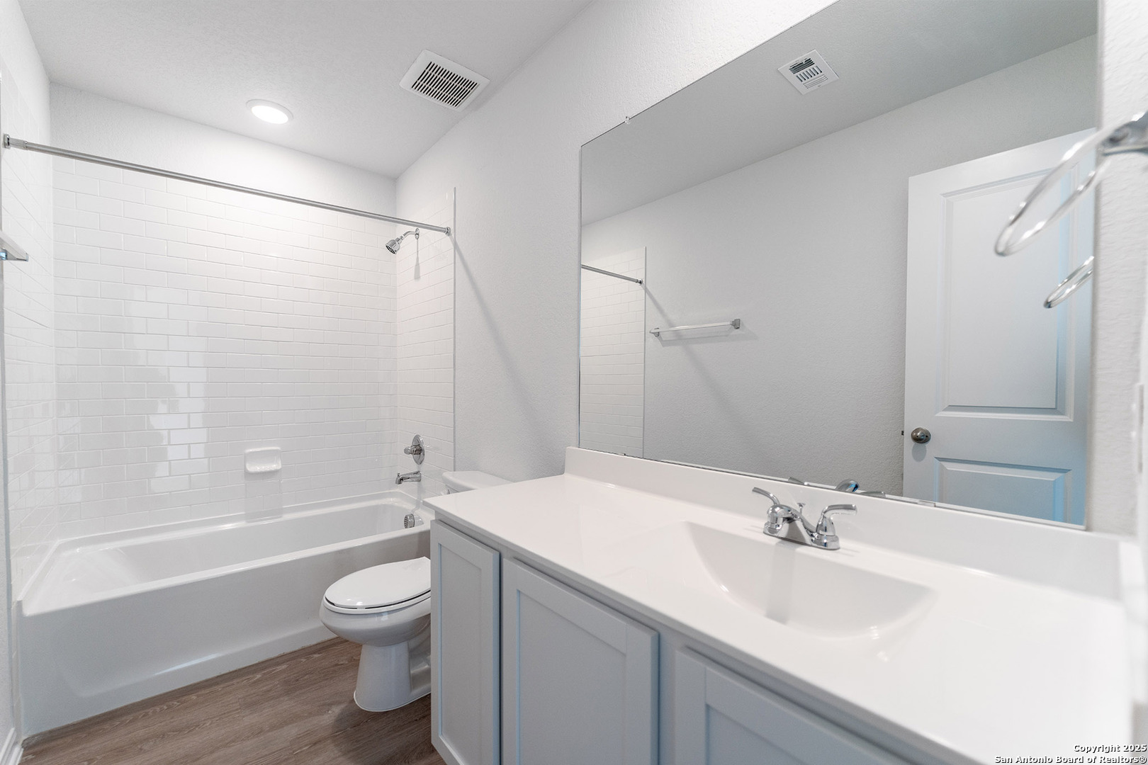 The delightful Ash floor plan is a sprawling, two-story design that is full of character. The exterior of the home is just as beautiful as the interior since the home will have a two-tone paint selection, and an exclusive landscaping package including shrubs, a caliper oak tree, and a yard that is fully sodded. Entering from your front porch, you are greeted by an elegant foyer with vinyl plank flooring that your two-car garage lies beside. Across the foyer is your convenient powder bathroom featuring a white pedestal sink and decorative mirror that flows right into your open-concept family room. The massive family room is perfect for entertaining guests and is boasting with ample amount of space. The smell of fresh cookies baking can be experienced from the family room, since the kitchen is opened up facing the living area. The expansive kitchen area is completed with granite countertops, beautiful flat-panel birch cabinets, designer light fixtures, and industry-leading appliances. You will love having the ability to install a kitchen island in the center of the kitchen, if you are needing more counter space. Speaking of more space, your oversized walk-in pantry will come in handy when you need to store all your food, spices, and dog treats. Integrating with your kitchen is your welcoming formal dining space with entry to your backyard in the corner of the room. Giving your backyard added value, you have the option of including a sizable covered patio! Adjacent to your formal dining room is the large Master Bedroom. Leading off the bedroom is your gorgeous master bathroom complete with cabinetry that matches your kitchen selections, cultured marble bath countertops, LED down lighting, and a super shower. Up the stairs, you will come across a large gameroom that is ideal for family game nights, as well as three additional bedrooms, and a secondary full bathroom. The Ash floor plan is sure to fit most any family lifestyle.