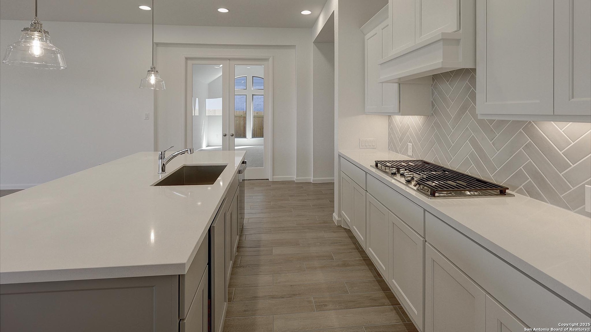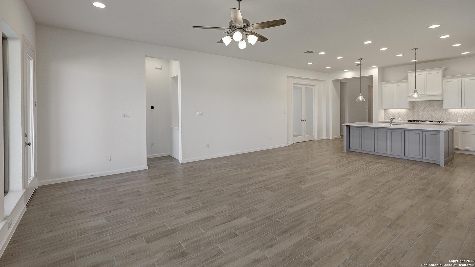 Entry with 13-foot ceilings framed by game room with French doors. Extended entry flows to the kitchen and dining area. Island kitchen with built-in seating space, 5-burner gas cooktop and a corner walk-in pantry. Family room with a wall of windows. Secluded primary suite. Primary bath offers dual vanities, garden tub, separate glass enclosed shower and two walk-in closets. Guest suite with a full bathroom and a walk-in closet. Secondary bedrooms and a utility room complete this one-story design. Covered backyard patio. Mud room just off the three-car garage.
