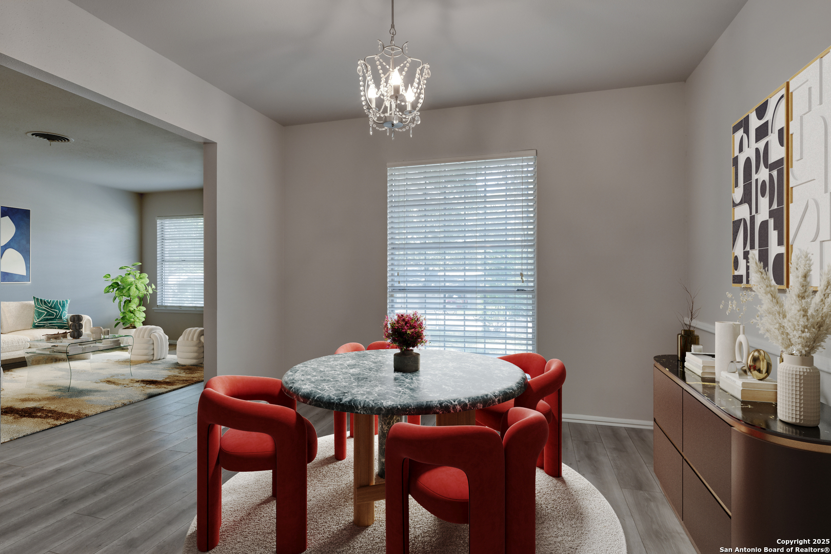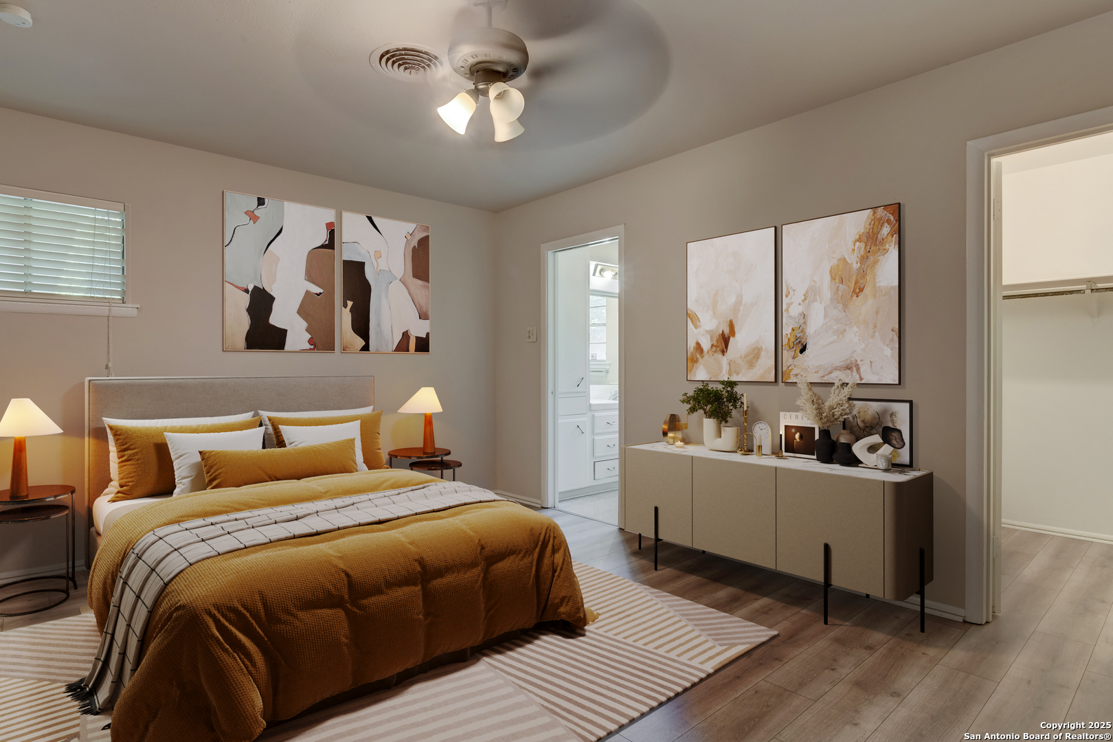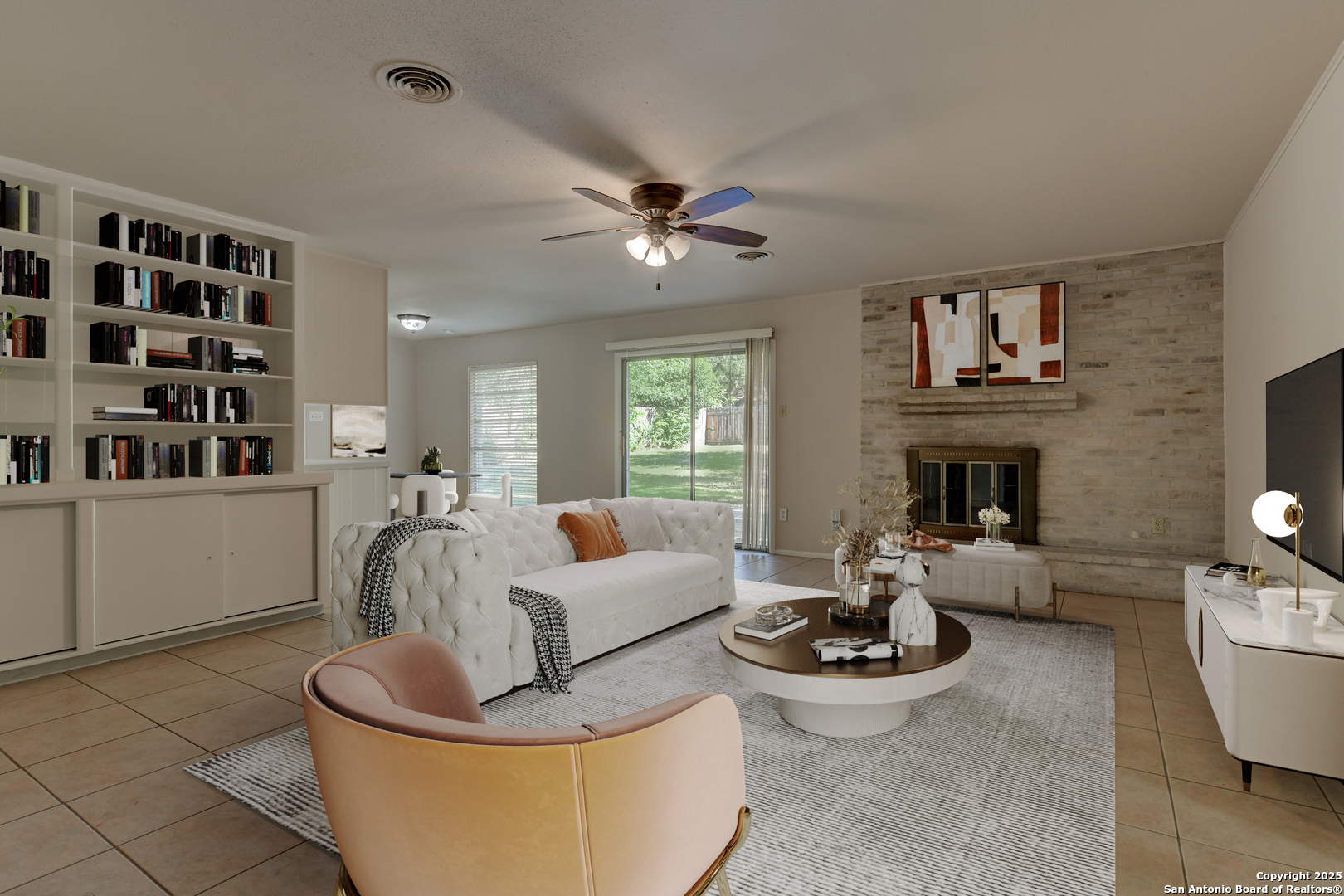 Shaded by mature oak trees and set back from the street, this charming single-story brick home offers a warm welcome with a traditional facade and inviting curb appeal. A two-car garage, large front yard, and covered entry porch provide a practical and comfortable introduction to the property. Step inside to discover a layout that balances function and comfort. To the left of the entry, you'll find the first living area, with the formal dining room beyond that, boasting chair rail molding and a formal chandelier. The spacious main living area at the back of the floorplan features a fireplace, tile flooring, and natural light to brighten the room. A sliding door leads to the backyard, offering a great indoor-outdoor connection. Just off the living space is the breakfast nook, which flows effortlessly into the kitchen. With crisp white cabinetry, a generous layout, a built-in oven, and a separate cooktop, the kitchen is both timeless and practical. The bedrooms are privately situated along a hallway, including a roomy primary suite with an en-suite bath and ample closet space. Secondary bedrooms share a full bath and provide flexibility for guest rooms, home offices, or hobby spaces. All bedrooms have newly replaced laminate wood flooring. Step into the backyard and enjoy a peaceful, tree-filled setting with plenty of space to play, garden, or relax. A spacious patio shaded by large oaks provides the perfect spot for outdoor dining or simply enjoying the breeze. The generous yard is fully fenced, offering both privacy and space to spread out. Located near the airport, you'll have easy access to all that San Antonio has to offer and beyond. "Please be aware some photos have been virtually staged."