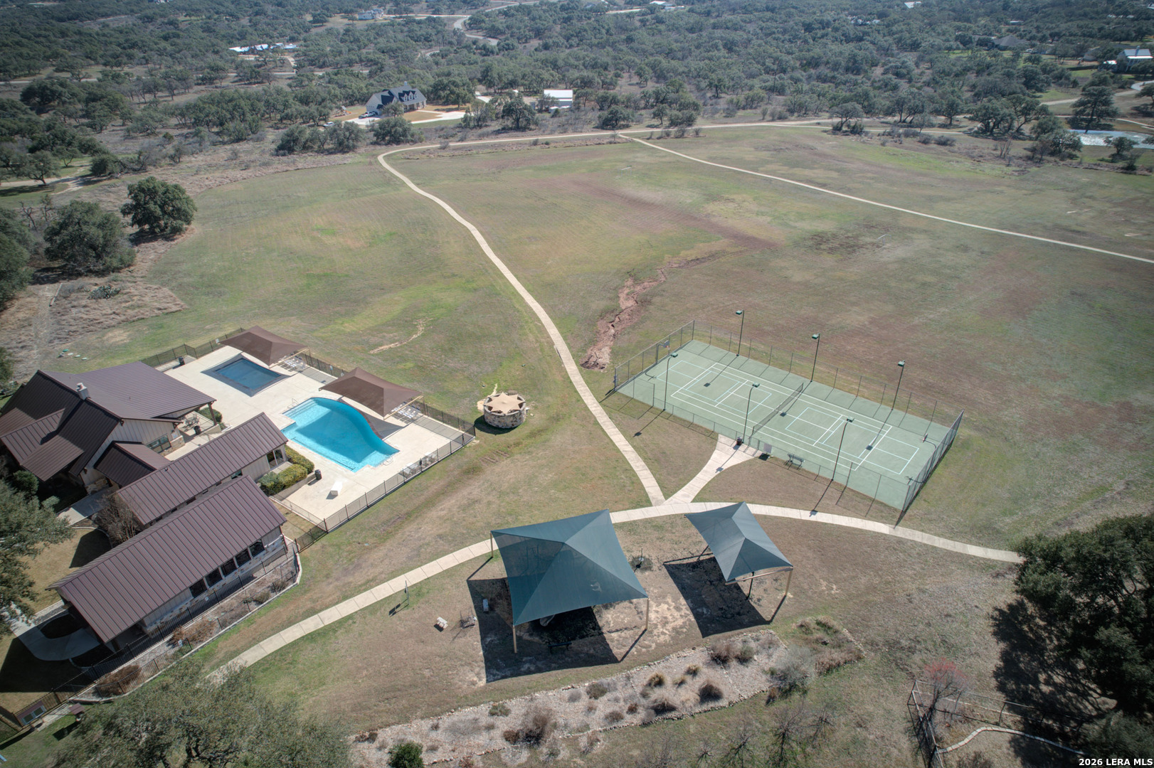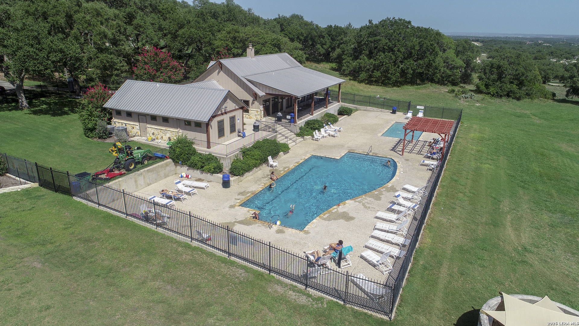 Tucked away on a quiet cul-de-sac in the highly sought-after River Chase community, 112 Westin Hills blends the charm of a stately Virginia manor with relaxed Texas Hill Country style. Set on 1.24 scenic acres, this 4-bedroom, 4.5-bath home offers the perfect balance of space, comfort, and functionality-inside and out. From the moment you arrive, you'll notice the inviting double front porches and mature oak trees that frame the property. Out back, an oversized screened-in porch with a gas fireplace and outdoor kitchen creates the ultimate space for entertaining or simply soaking in those Hill Country views year-round. Inside, engineered hardwood floors run throughout the first floor, adding warmth and durability. The main level features a spacious primary suite plus a secondary bedroom with its own en suite bath-ideal for guests or multigenerational living. Need flex space? The studio with a full bath and built-in office is perfect for a photographer, fitness enthusiast, homeschool setup, or private workspace. The gourmet kitchen is designed to impress with double ovens, gas cooking, a walk-in pantry, and a beautiful mix of marble and butcher block countertops. Upstairs, you'll find two additional bedrooms, two extra storage closets, a cozy office space, and a standout game room complete with built-in bunk beds-sleepovers and movie nights just got an upgrade! Storage won't be an issue here, with multiple oversized interior closets plus a 12x16 outdoor storage building. Don't forget about the amazing River Chase amenities: 58-acre private river park with hiking trails and a 32-acre neighborhood park that includes a clubhouse, swimming pools, pickleball/tennis court, walking trails, and a fishing pond. Whether you're hosting gatherings for friends and family or enjoying a peaceful weekend at home, 112 Westin Hills offers the space, setting, and style to truly live the Hill Country lifestyle. **This home has a VA assumable loan at 2.75%**