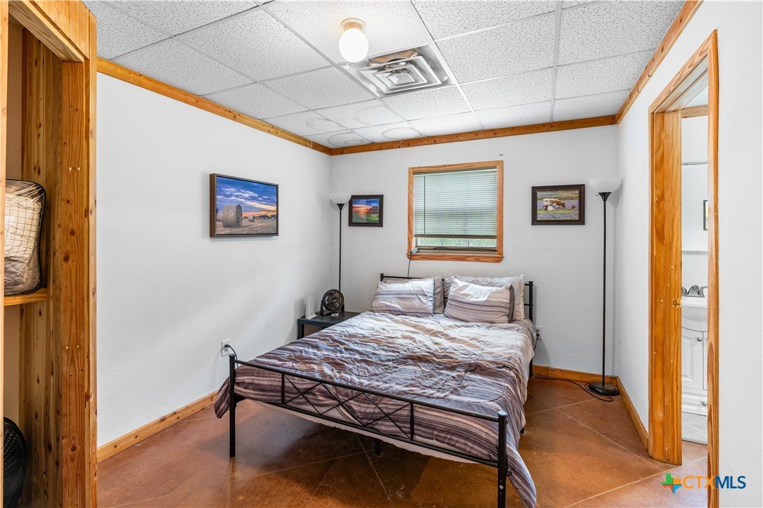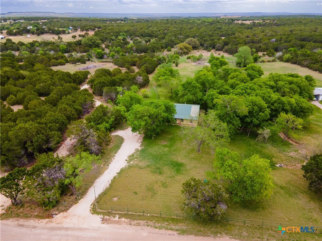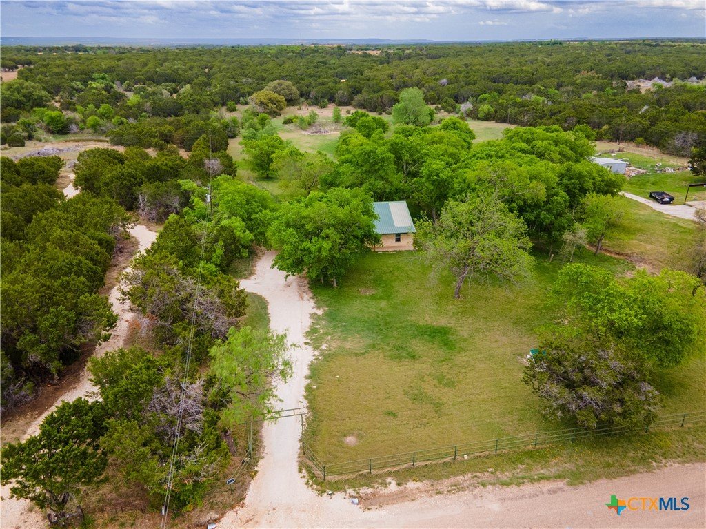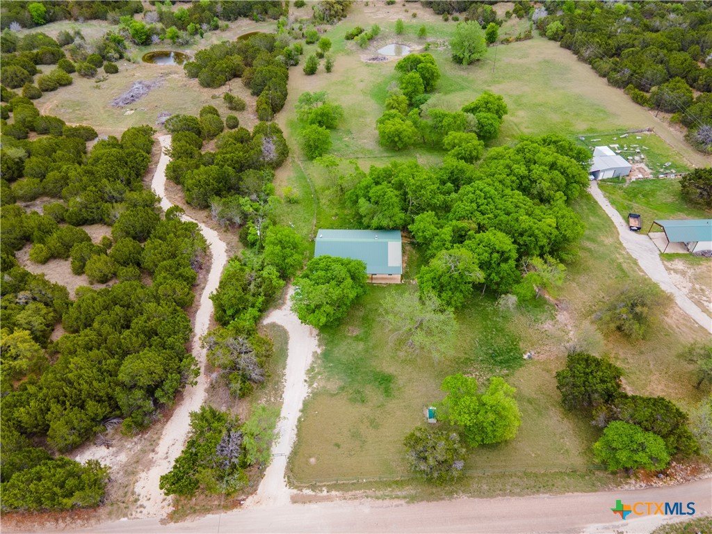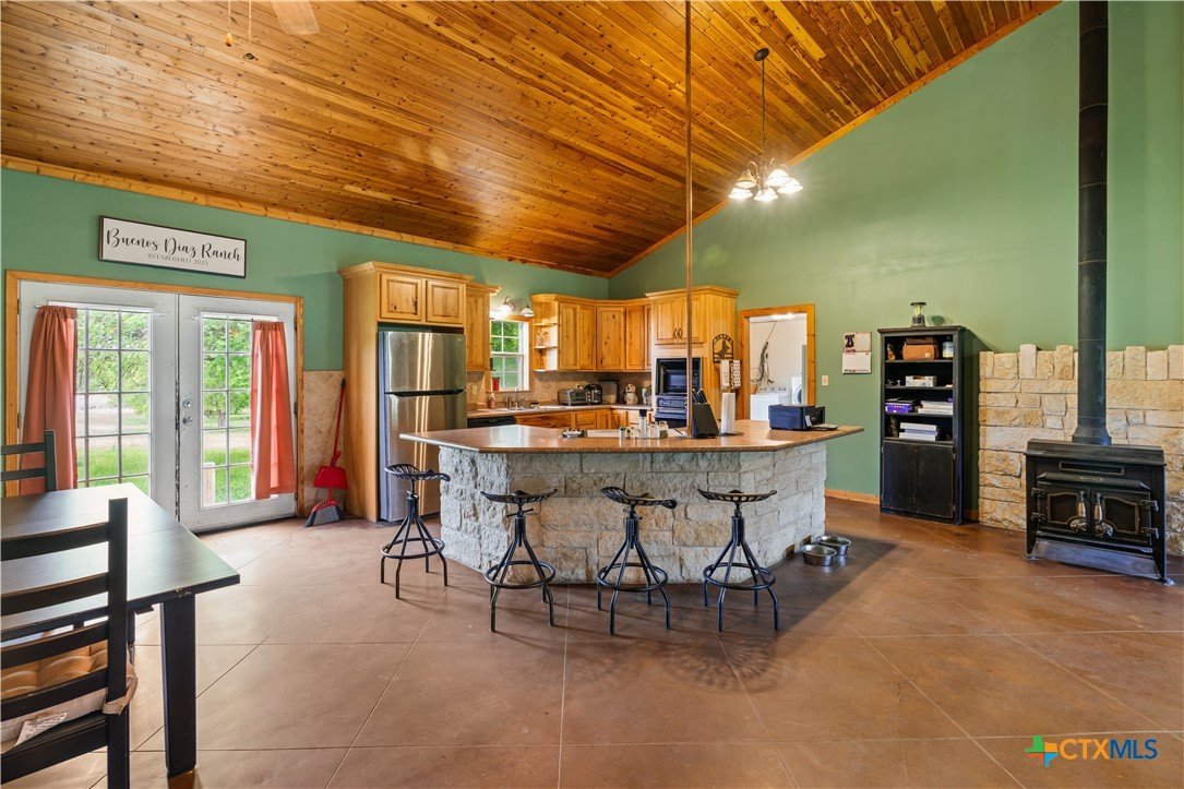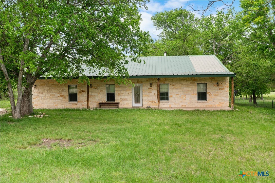 Enjoy peaceful country living on 14.7 beautiful acres with this spacious 5-bedroom, 3-bath Austin stone ranch. The heart of the home features a large open-concept living, dining, and kitchen area with soaring vaulted wood ceilings. Stained concrete floors run throughout, offering both durability and style. The kitchen is equipped with warm pine cabinetry, a large island, and a dining space that easily accommodates an oversized table—perfect for gatherings. The split floor plan provides privacy, with four bedrooms, a flex room, and two bathrooms on one side, while the spacious primary suite features vaulted ceilings, dual closets, and an ensuite bath with separate vanities, a walk-in shower, and a relaxing garden tub. Mature trees create a shaded yard, while the back of the property is heavily wooded for added privacy. A stock tank sits near the center of the property, along with a seasonal tank that has been used as a shooting range during low water levels. Additional improvements include a 25x50 workshop with extra concrete workspace and a full bathroom with its own septic system, as well as a 20x20 barn with a carport on one side and two stalls on the other. The property is serviced by a well, with co-op water available at the property line. This versatile property offers space, functionality, and the perfect blend of comfort, country charm and scenic views!
