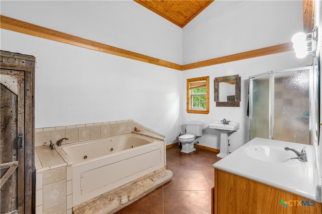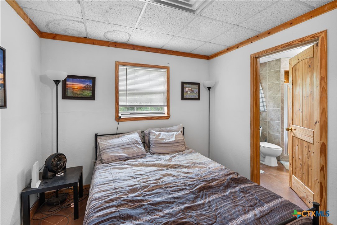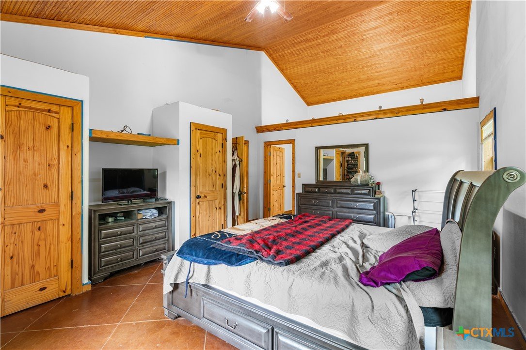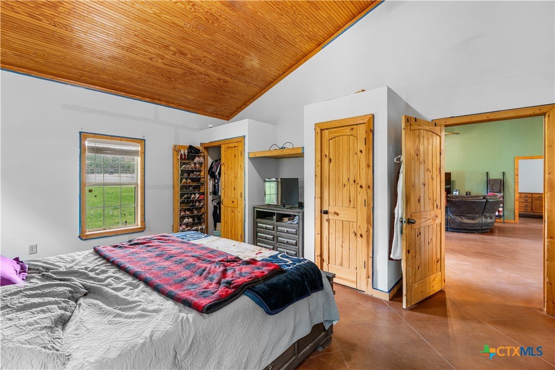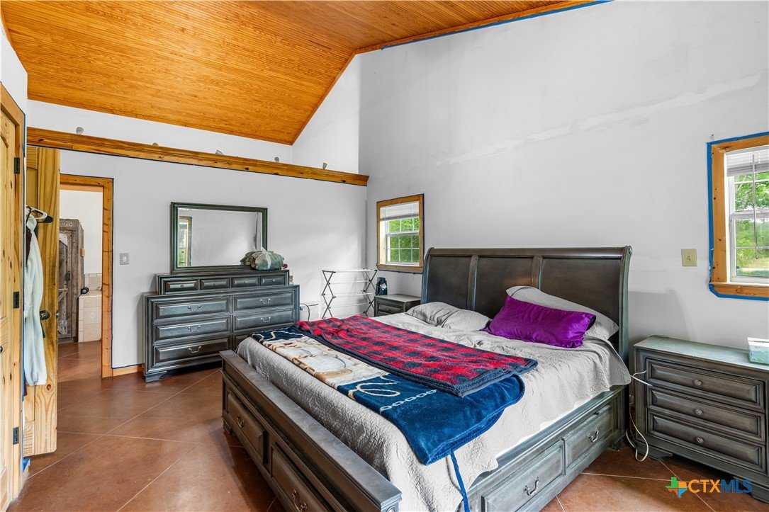 Enjoy peaceful country living on 14.7 beautiful acres with this spacious 5-bedroom, 3-bath Austin stone ranch. The heart of the home features a large open-concept living, dining, and kitchen area with soaring vaulted wood ceilings. Stained concrete floors run throughout, offering both durability and style. The kitchen is equipped with warm pine cabinetry, a large island, and a dining space that easily accommodates an oversized table—perfect for gatherings. The split floor plan provides privacy, with four bedrooms, a flex room, and two bathrooms on one side, while the spacious primary suite features vaulted ceilings, dual closets, and an ensuite bath with separate vanities, a walk-in shower, and a relaxing garden tub. Mature trees create a shaded yard, while the back of the property is heavily wooded for added privacy. A stock tank sits near the center of the property, along with a seasonal tank that has been used as a shooting range during low water levels. Additional improvements include a 25x50 workshop with extra concrete workspace and a full bathroom with its own septic system, as well as a 20x20 barn with a carport on one side and two stalls on the other. The property is serviced by a well, with co-op water available at the property line. This versatile property offers space, functionality, and the perfect blend of comfort, country charm and scenic views!