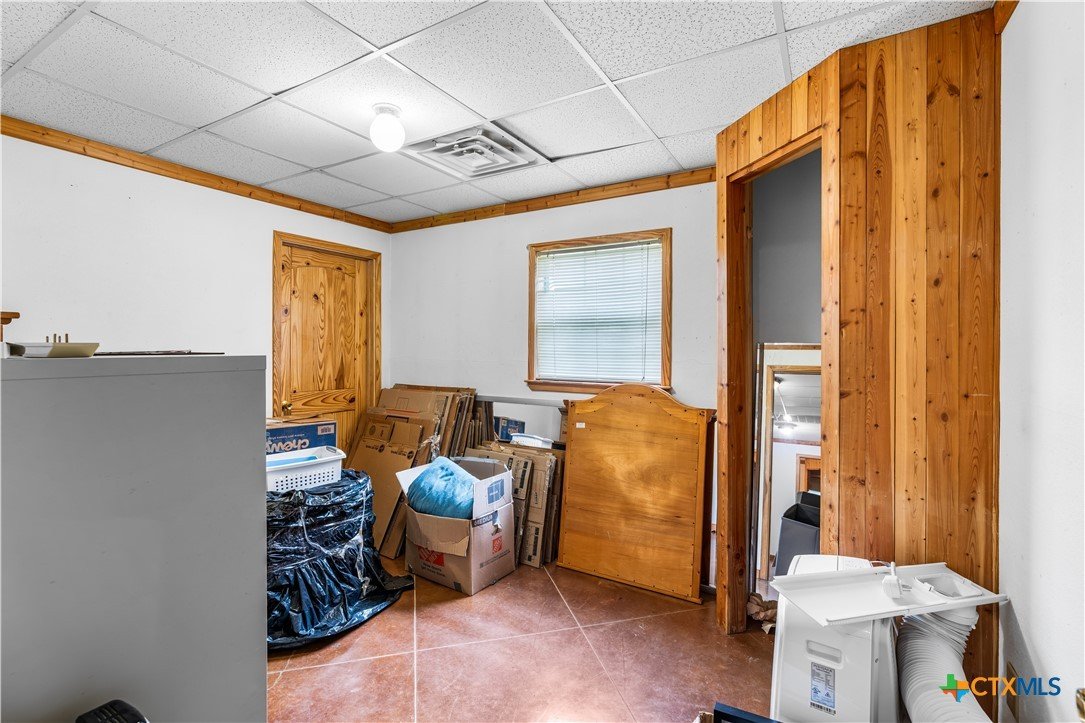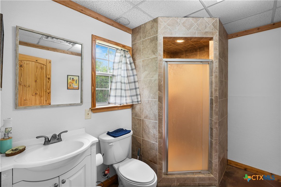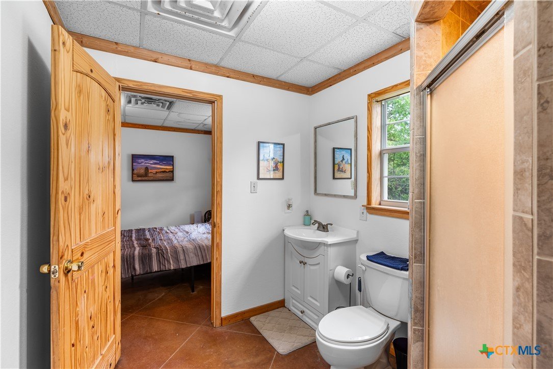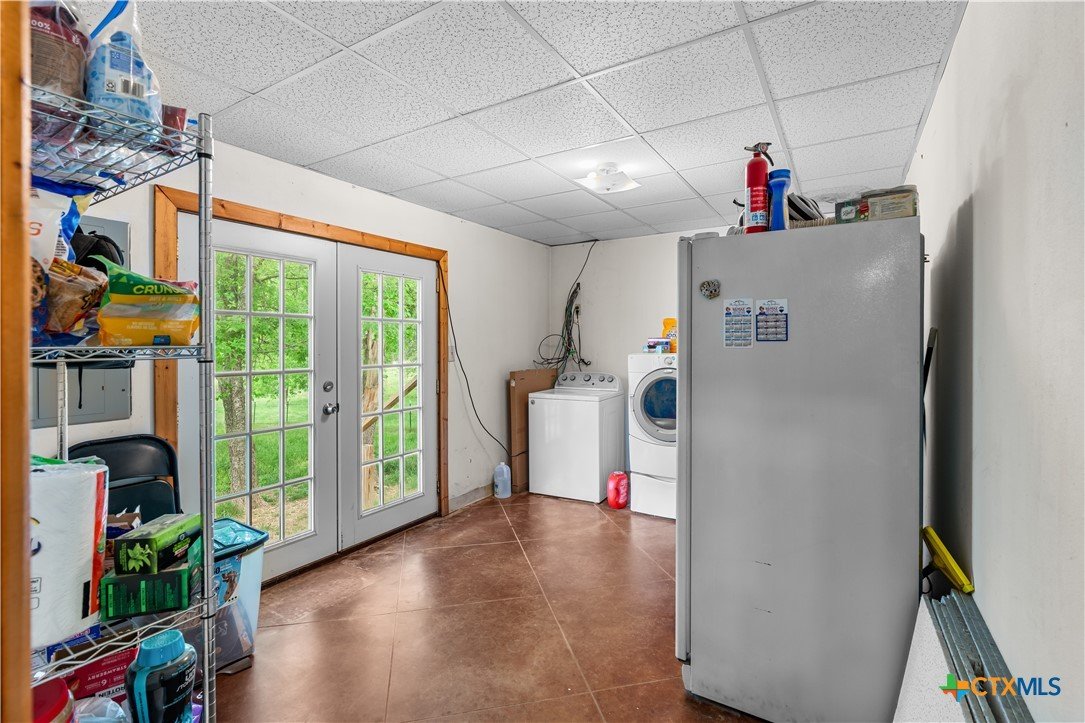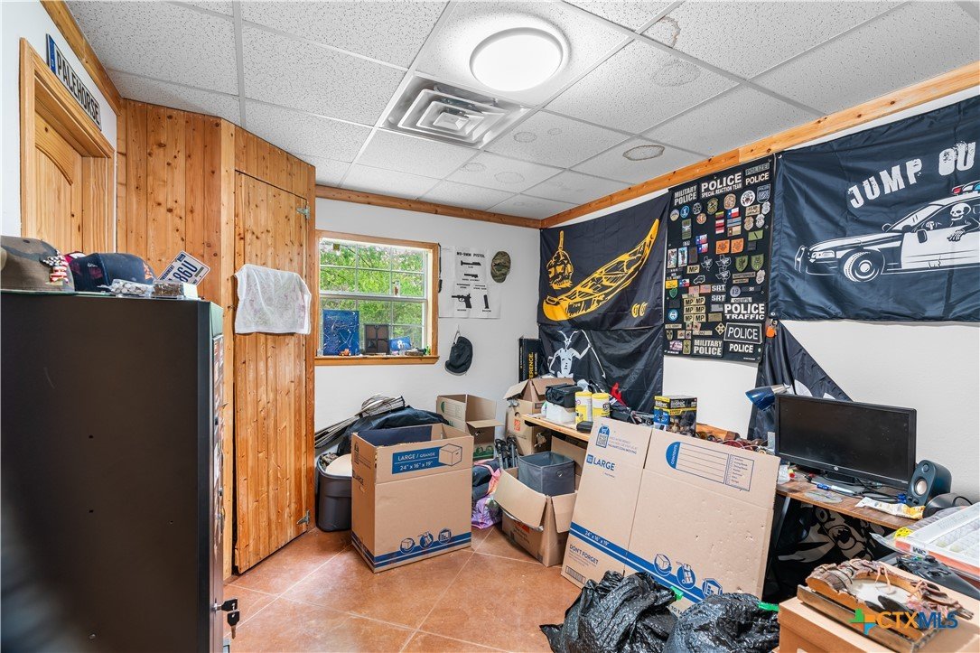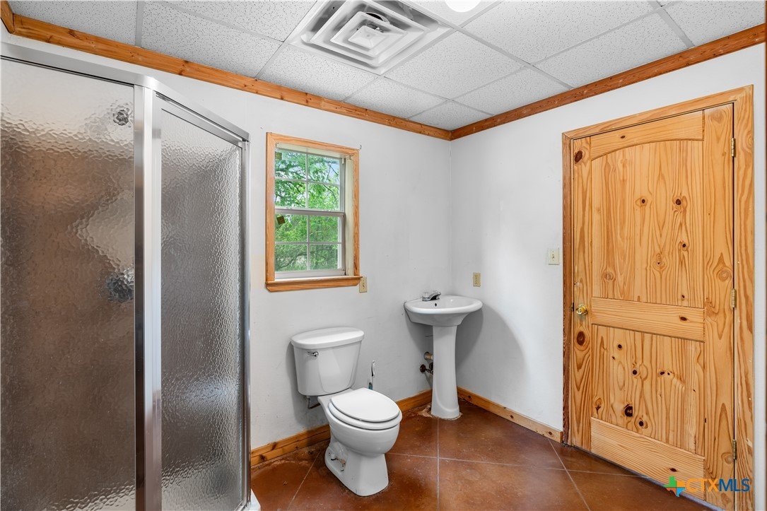 Enjoy peaceful country living on 14.7 beautiful acres with this spacious 5-bedroom, 3-bath Austin stone ranch. The heart of the home features a large open-concept living, dining, and kitchen area with soaring vaulted wood ceilings. Stained concrete floors run throughout, offering both durability and style. The kitchen is equipped with warm pine cabinetry, a large island, and a dining space that easily accommodates an oversized table—perfect for gatherings. The split floor plan provides privacy, with four bedrooms, a flex room, and two bathrooms on one side, while the spacious primary suite features vaulted ceilings, dual closets, and an ensuite bath with separate vanities, a walk-in shower, and a relaxing garden tub. Mature trees create a shaded yard, while the back of the property is heavily wooded for added privacy. A stock tank sits near the center of the property, along with a seasonal tank that has been used as a shooting range during low water levels. Additional improvements include a 25x50 workshop with extra concrete workspace and a full bathroom with its own septic system, as well as a 20x20 barn with a carport on one side and two stalls on the other. The property is serviced by a well, with co-op water available at the property line. This versatile property offers space, functionality, and the perfect blend of comfort, country charm and scenic views!