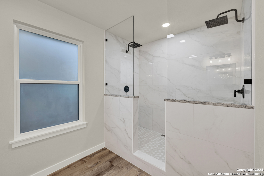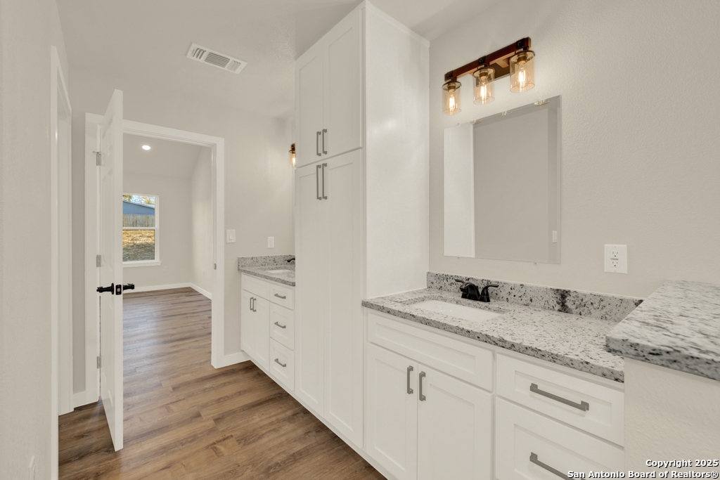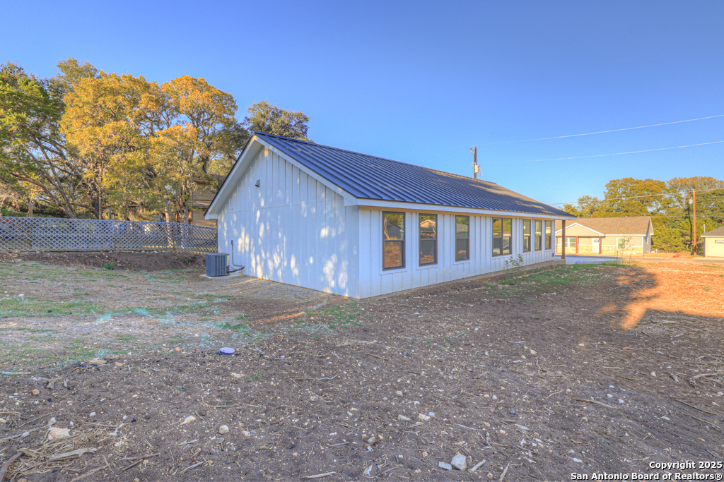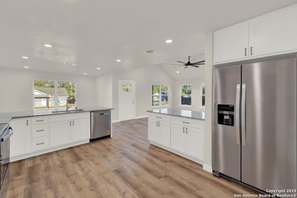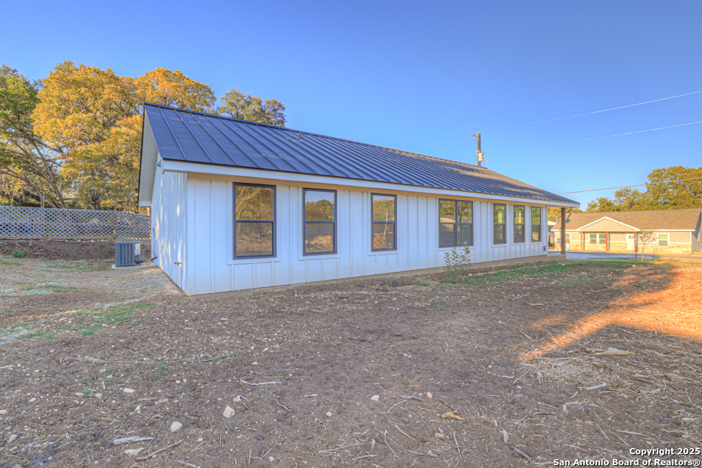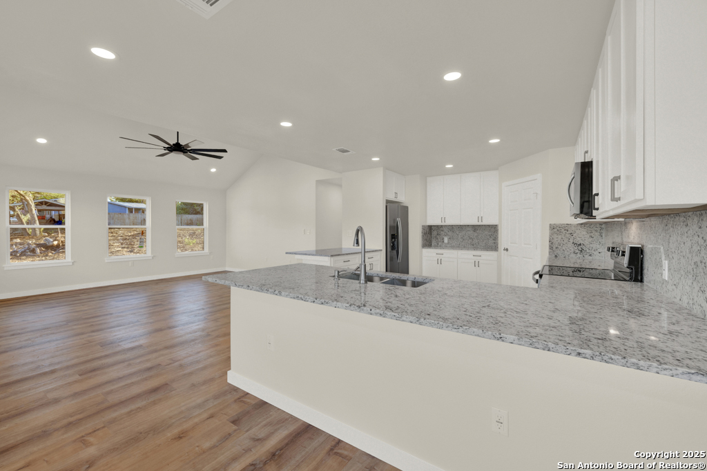 This thoughtfully crafted new construction blends modern design with timeless Hill Country charm. Featuring three spacious bedrooms and two elegant baths, every detail of this home was designed with comfort and quality in mind. The open-concept floor plan creates an effortless flow, perfect for entertaining. The kitchen is a true centerpiece, showcasing double peninsula granite countertops, abundant cabinetry with soft-close features, and a dedicated dining area ideal for family gatherings. Durable luxury vinyl flooring runs throughout the main living and wet areas, providing style and ease of maintenance - with no carpet in sight. The primary suite offers a serene retreat with dual granite vanities and an oversized walk-in shower featuring dual shower heads. Step outside to the inviting front porch, where you can unwind and take in the peaceful Hill Country views and gentle visits from neighborhood deer. Constructed with superior craftsmanship, the home boasts 2x6 exterior framing on the east and west walls for enhanced insulation, OSB sheathing, spray foam throughout the perimeter and ceiling, and a seamless metal roof - ensuring lasting energy efficiency and peace of mind. Ideally located just minutes from Canyon Lake, and within walking distance of the community pool, playground, and tennis courts, this home offers the perfect balance of relaxation and recreation.