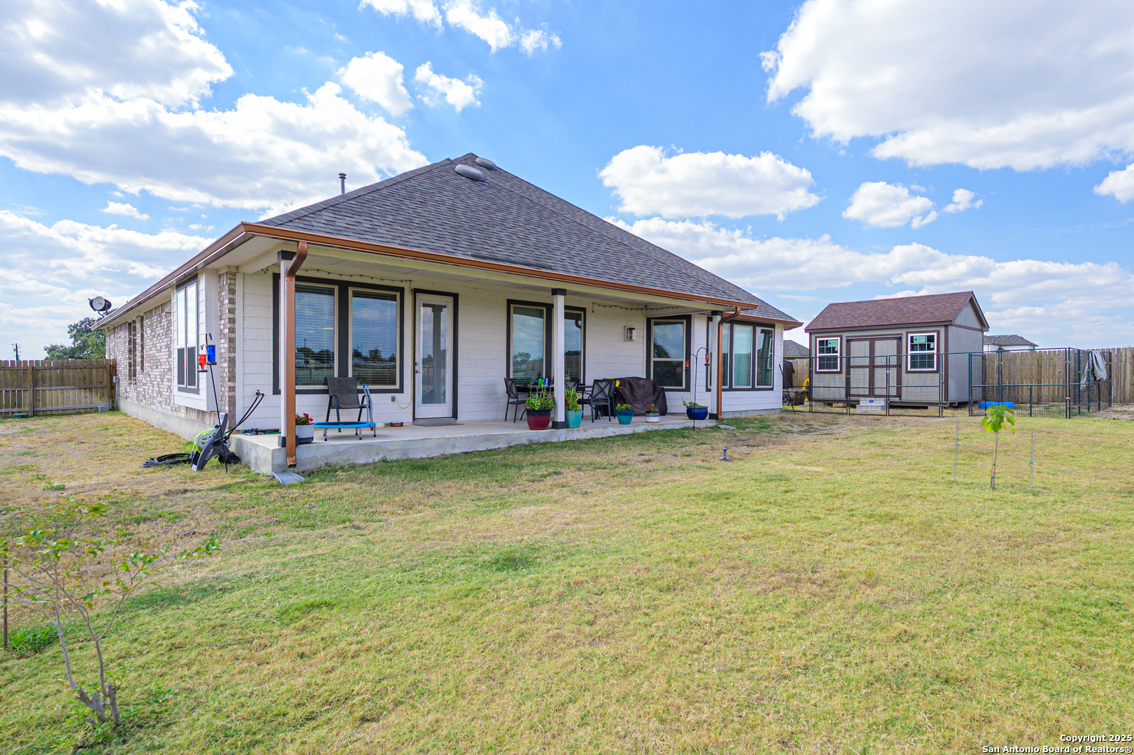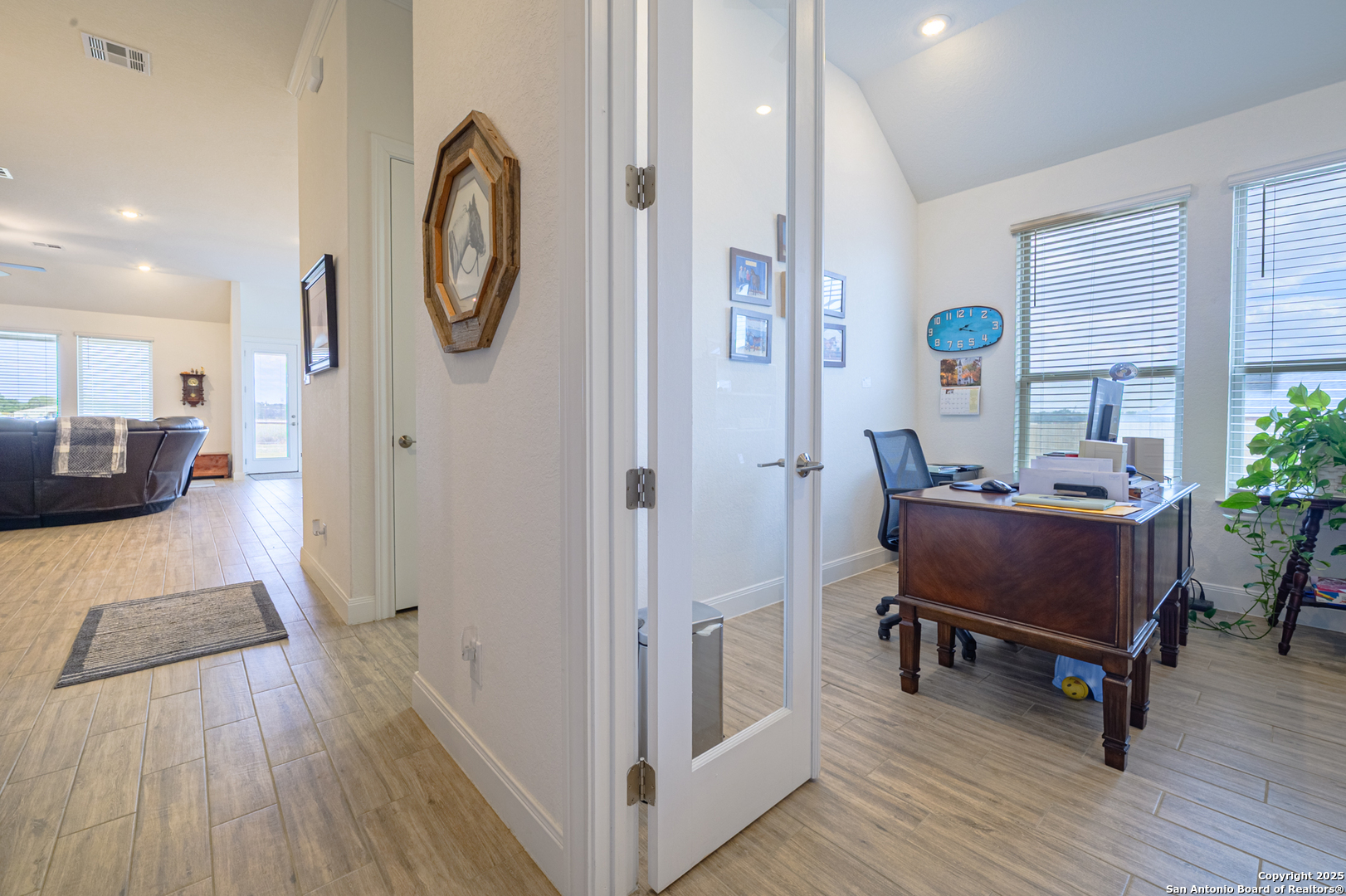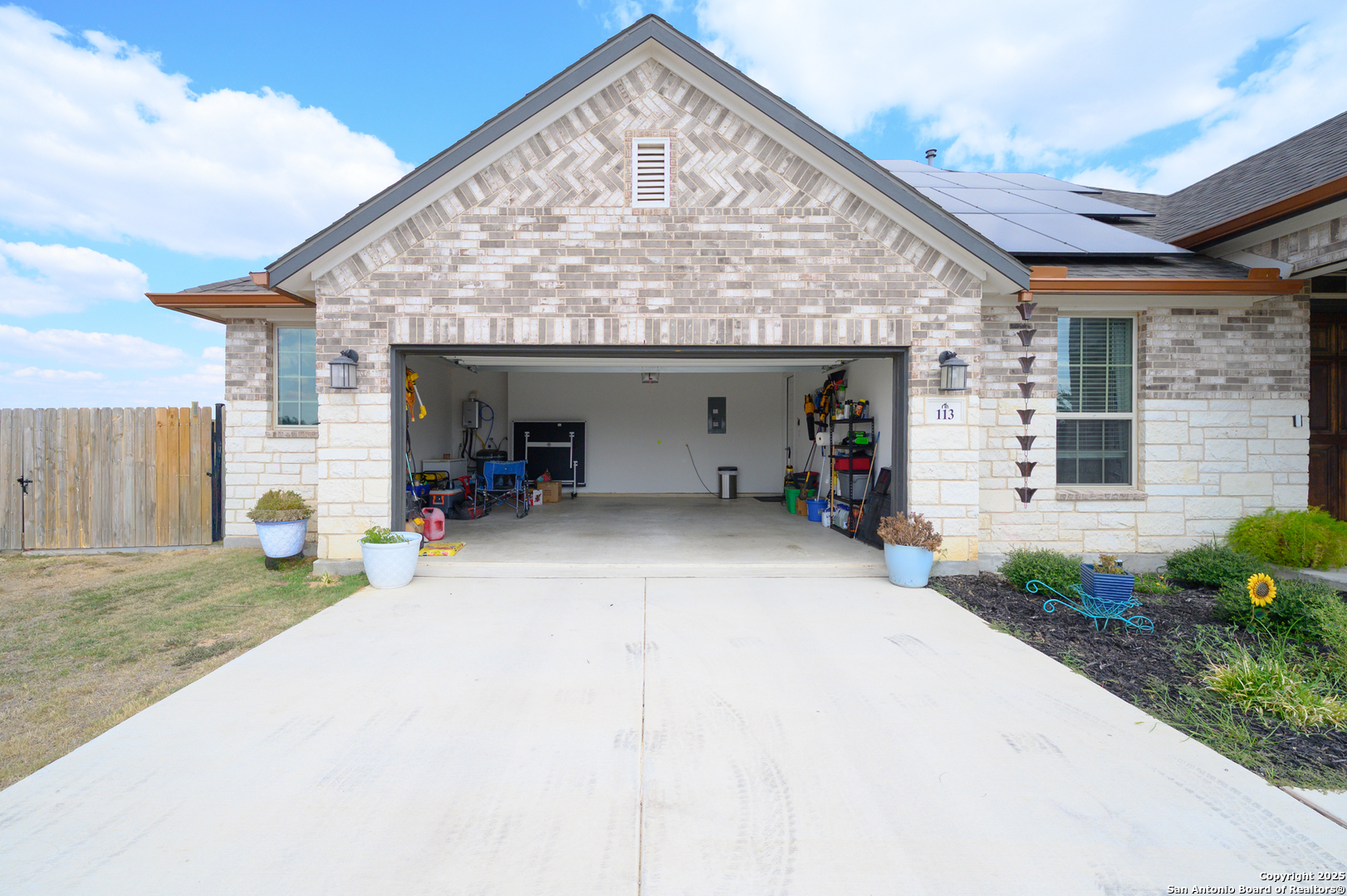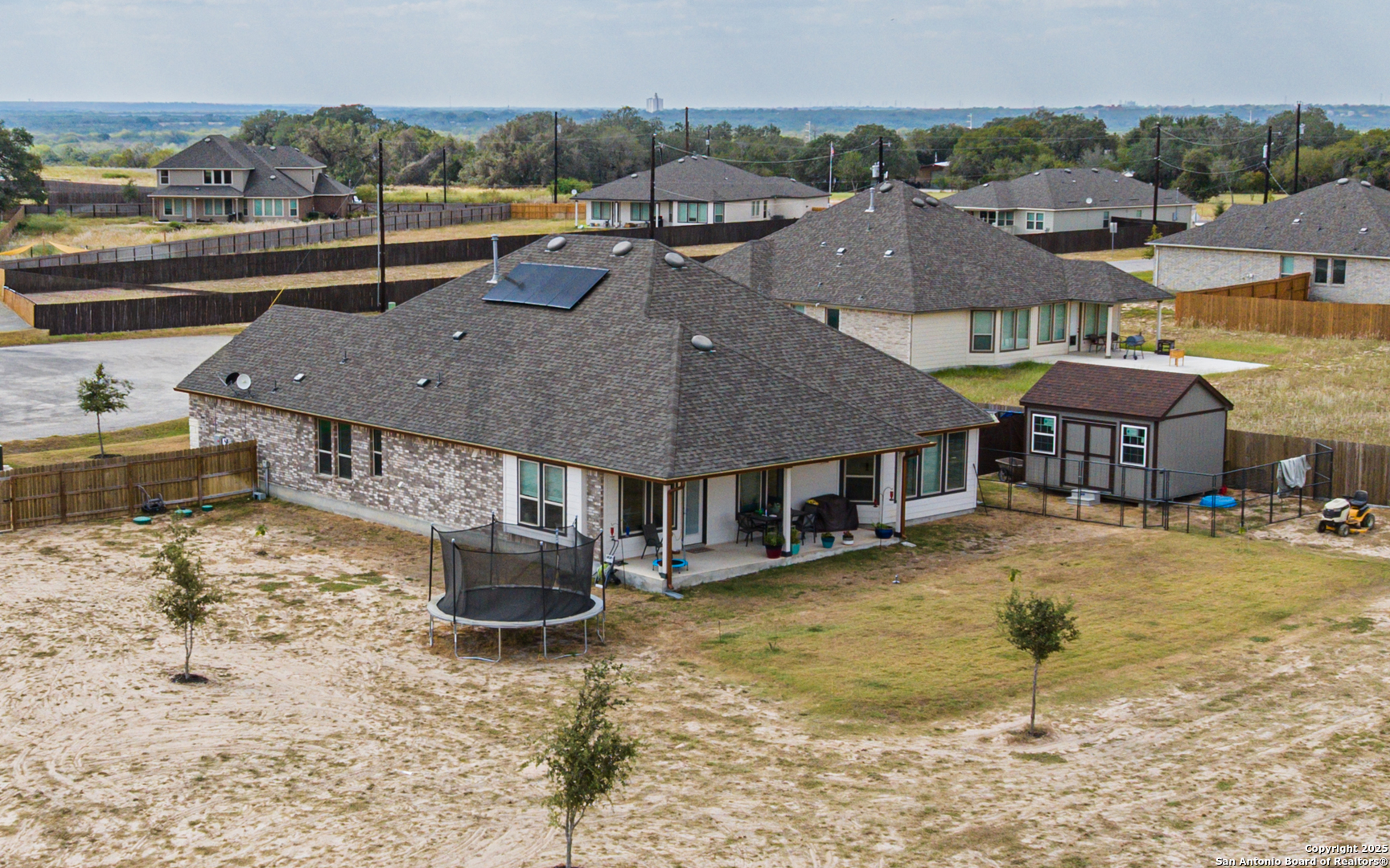 Solar Panels , water softener , tankless water heater and gas appliances are some of the great extras that are provided with this immaculate home. A dramatic oversized hallway passes by the designated office and leads to the sunlit great room where the kitchen , dining, breakfast and living area are located and the ceilings soar to 11'. The white cabinetry is topped with white quartz. Enjoy the Smart French Door Refrigerator with Craft Ice & Full-Conversion Drawer, the gas range and 9' island . This great room is graced with 2 dining areas, stone faced gas fireplace with glass insert ,access to primary suite and back yard. The primary wing features bay windows and a glorious bath with garden tub , sparkling shower, 11' vanity and walk in closet. Bedroom 2 has ensuite with zero entry shower, Bedroom 3 & 4 share a full bath with double vanities. All bedrooms have walk in closets. Oversized garage holds the tankless water heater, whole house water softener and pull down stairs. A storage building is already set up in the back yard and is easily accessed from the covered porch. Numerous Oak trees have been planted.