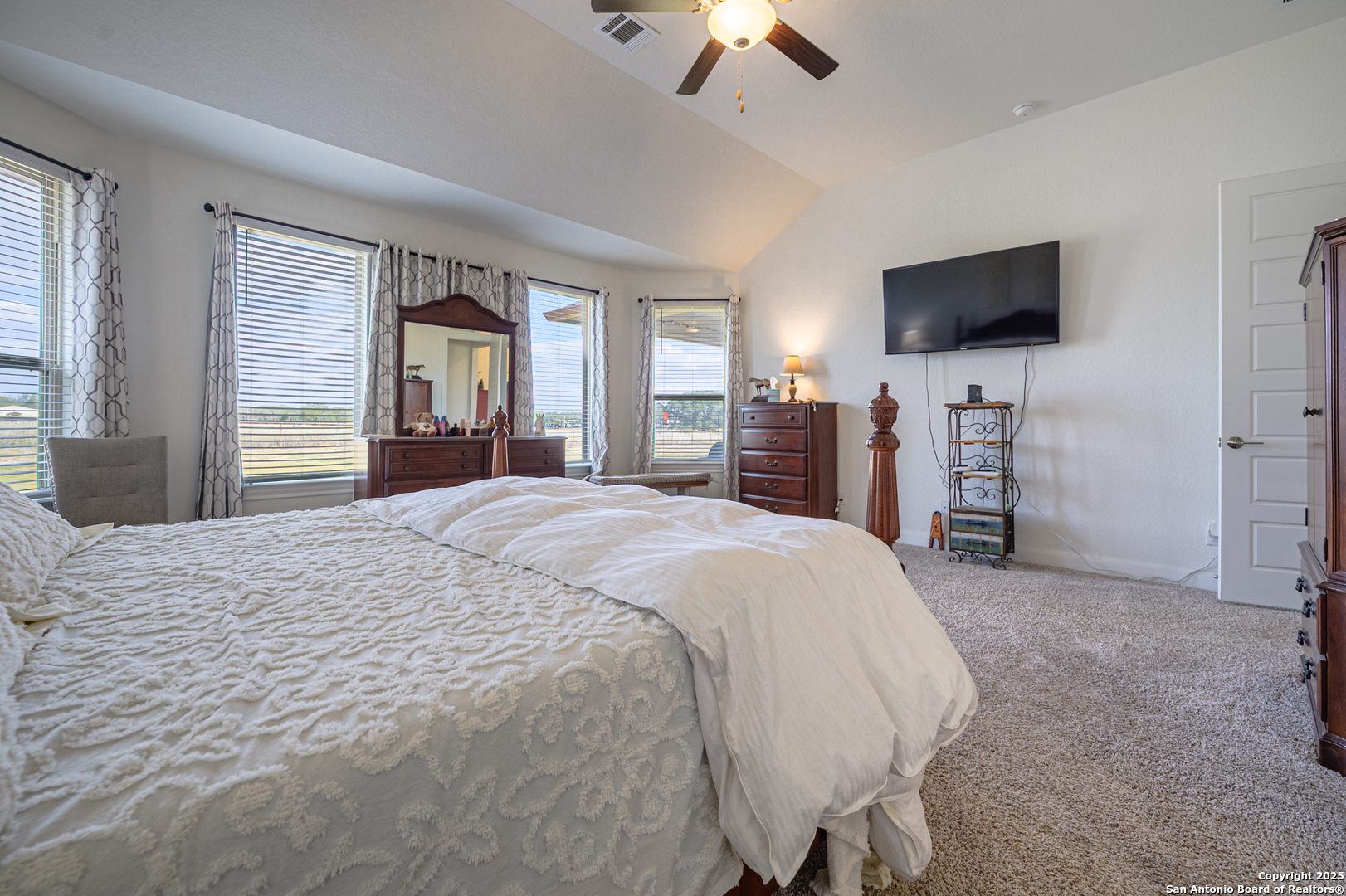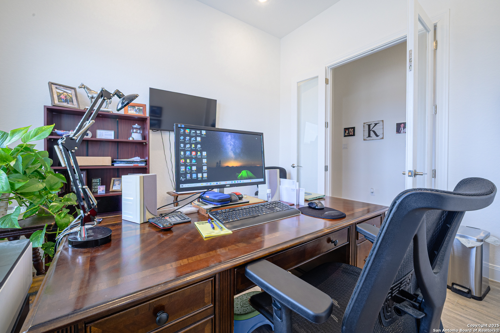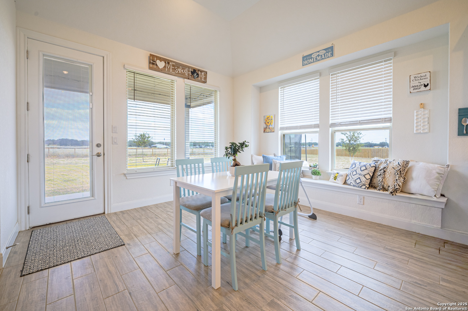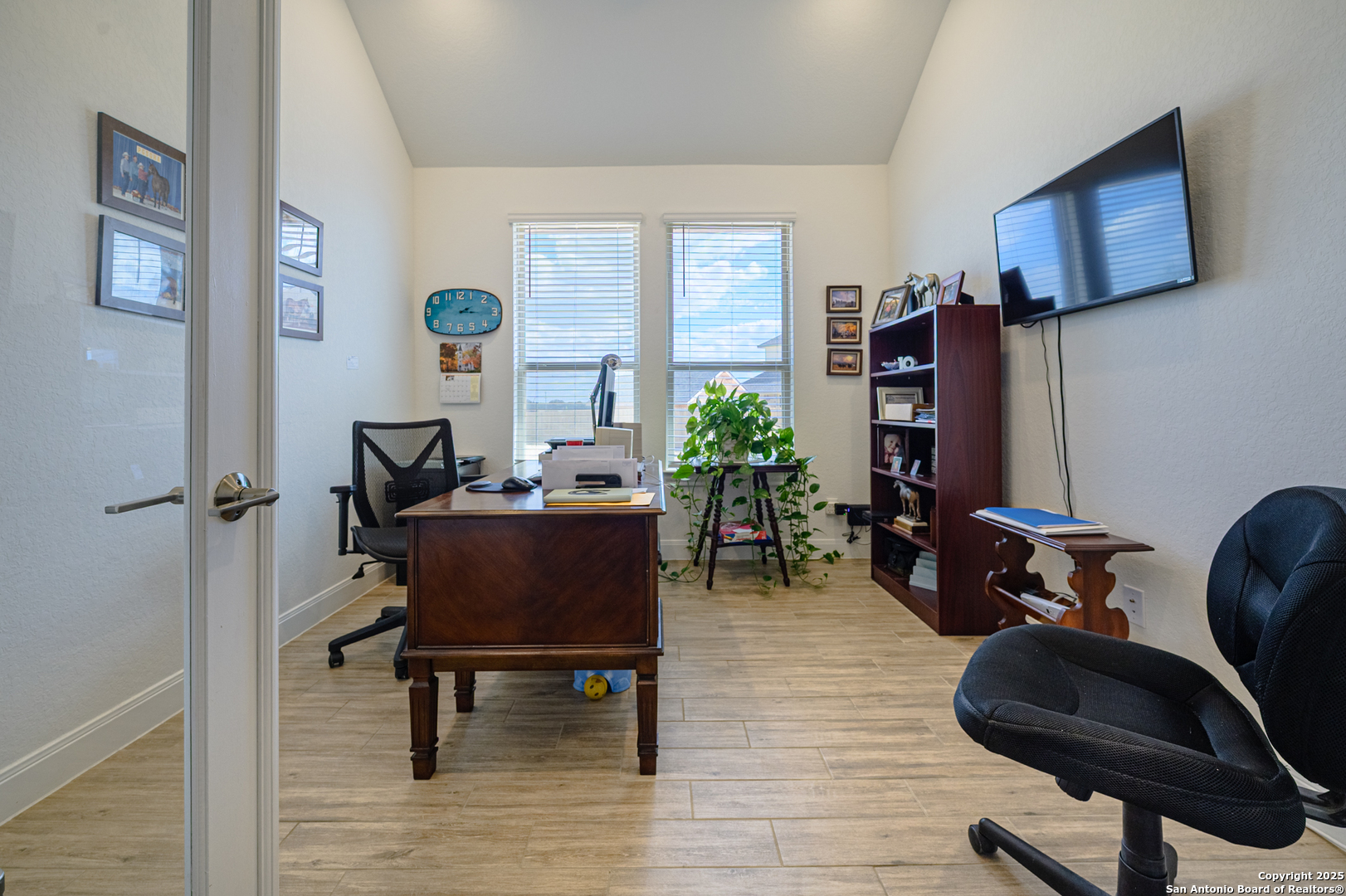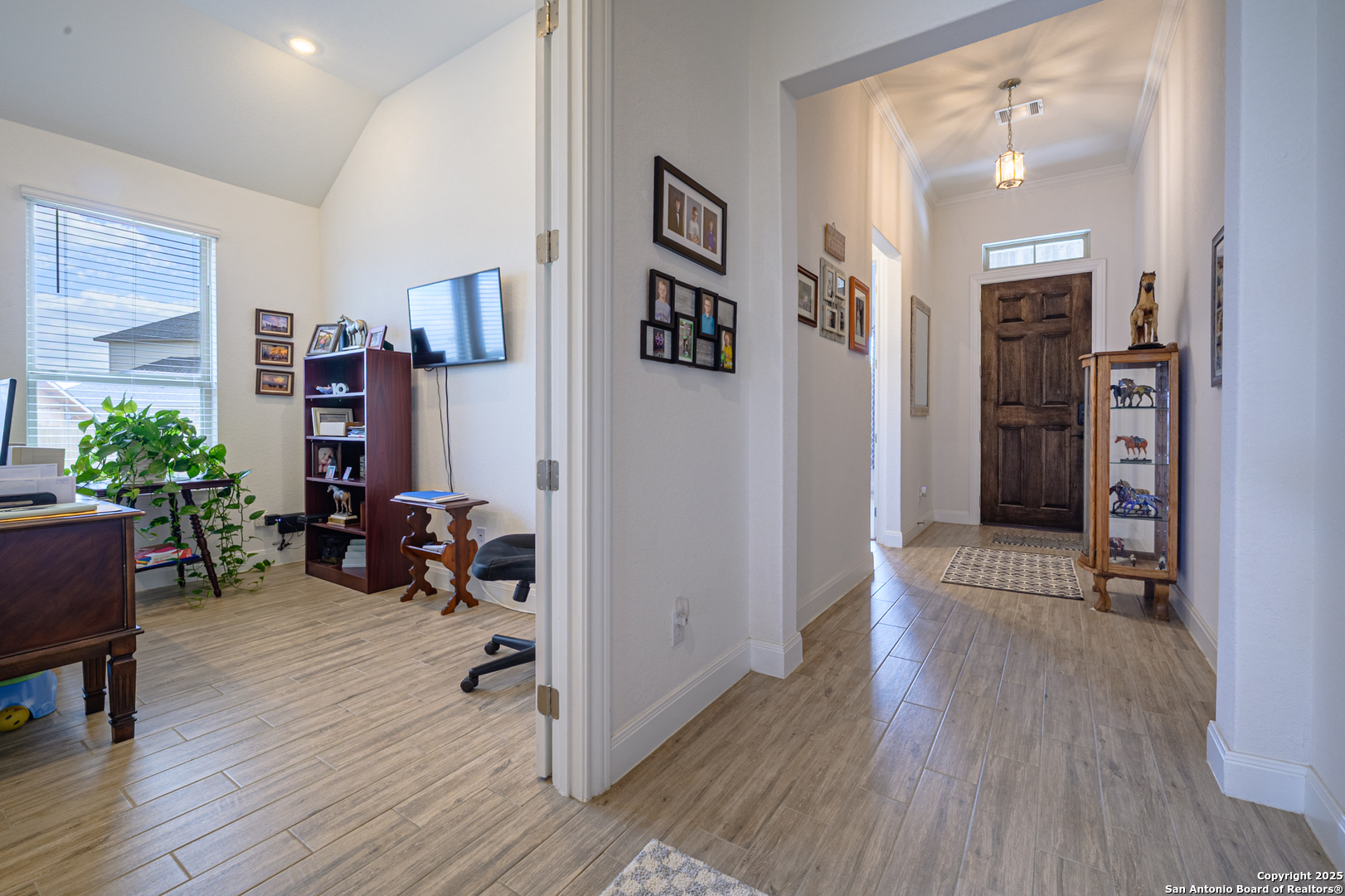 Solar Panels , water softener , tankless water heater and gas appliances are some of the great extras that are provided with this immaculate home. A dramatic oversized hallway passes by the designated office and leads to the sunlit great room where the kitchen , dining, breakfast and living area are located and the ceilings soar to 11'. The white cabinetry is topped with white quartz. Enjoy the Smart French Door Refrigerator with Craft Ice & Full-Conversion Drawer, the gas range and 9' island . This great room is graced with 2 dining areas, stone faced gas fireplace with glass insert ,access to primary suite and back yard. The primary wing features bay windows and a glorious bath with garden tub , sparkling shower, 11' vanity and walk in closet. Bedroom 2 has ensuite with zero entry shower, Bedroom 3 & 4 share a full bath with double vanities. All bedrooms have walk in closets. Oversized garage holds the tankless water heater, whole house water softener and pull down stairs. A storage building is already set up in the back yard and is easily accessed from the covered porch. Numerous Oak trees have been planted.
