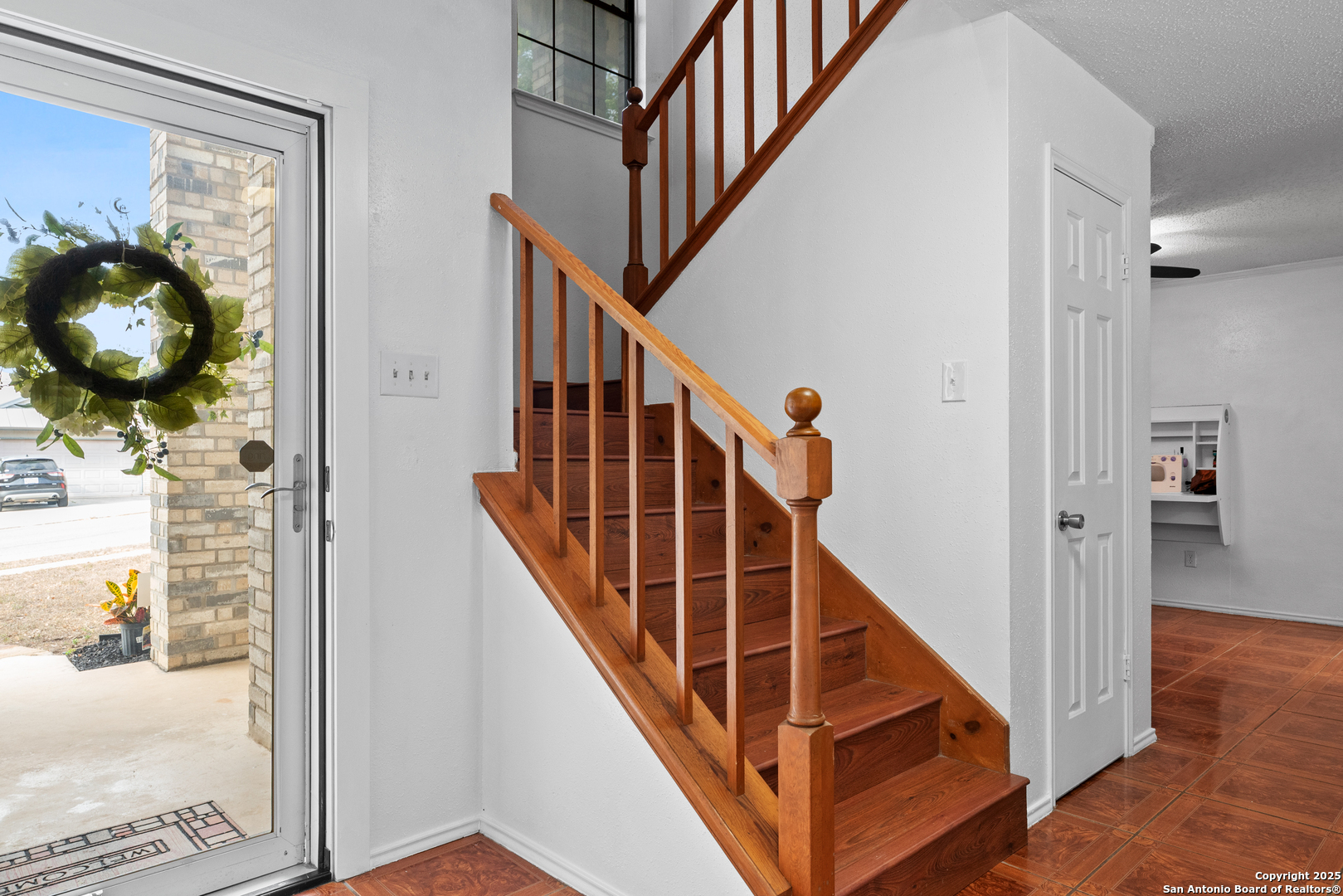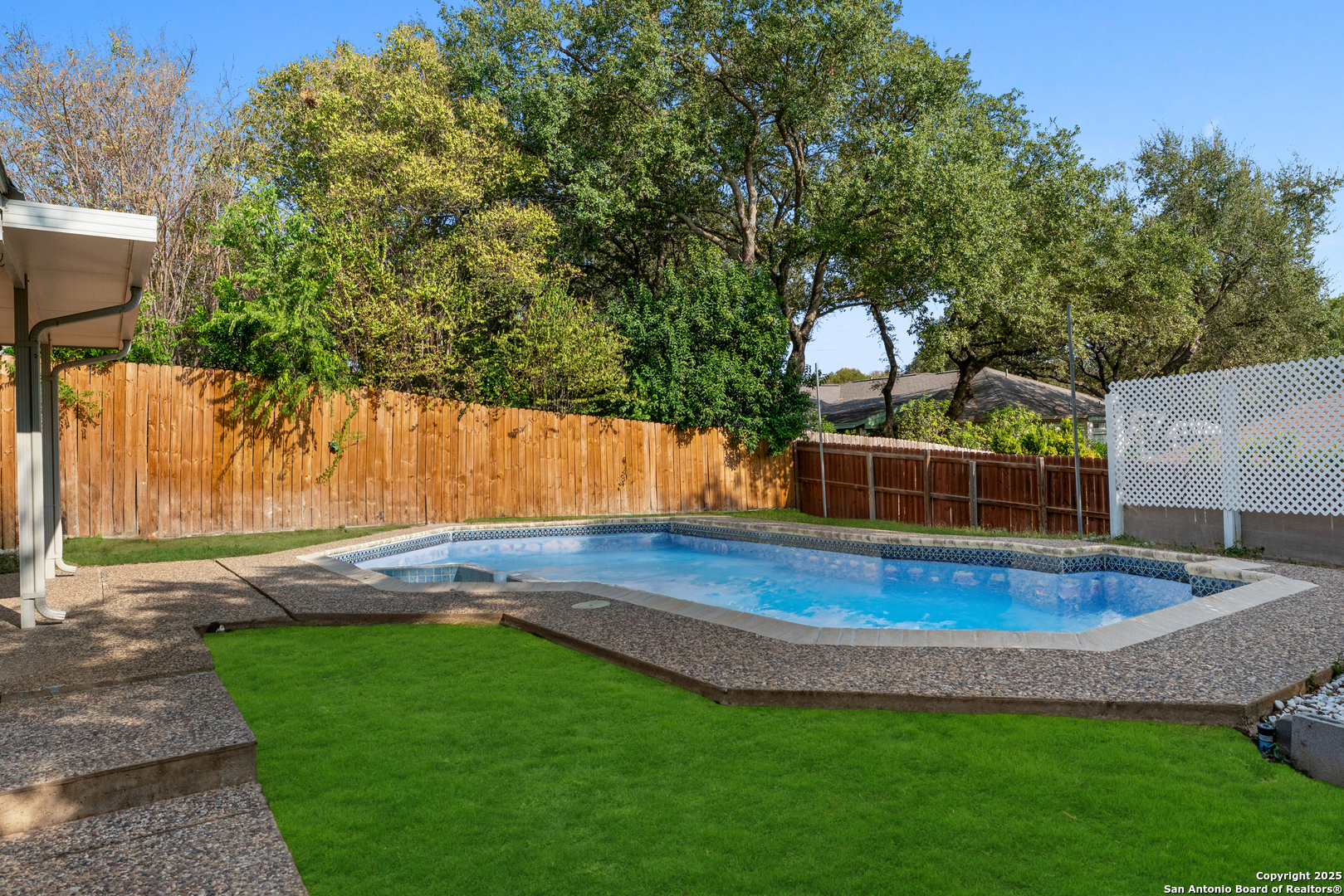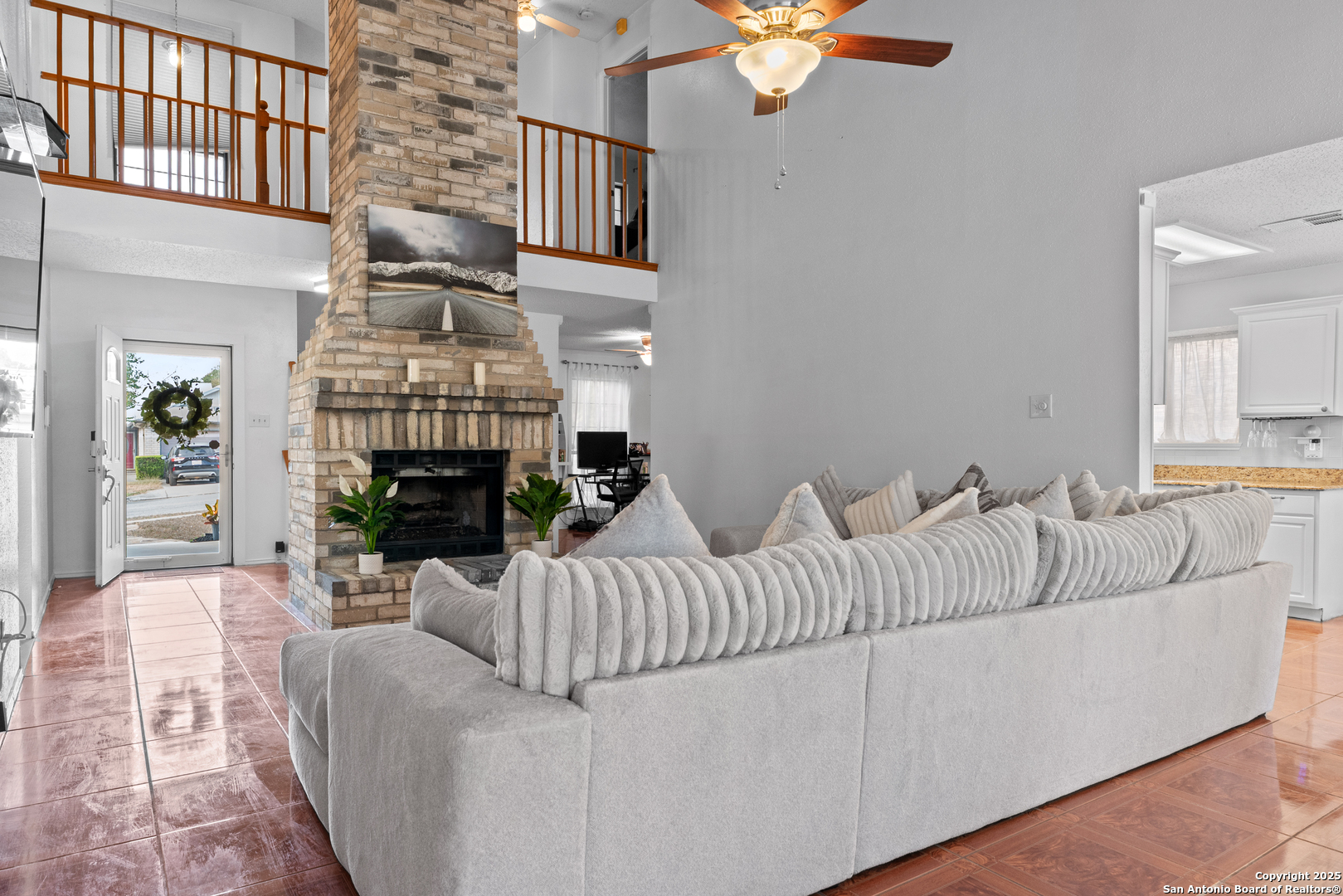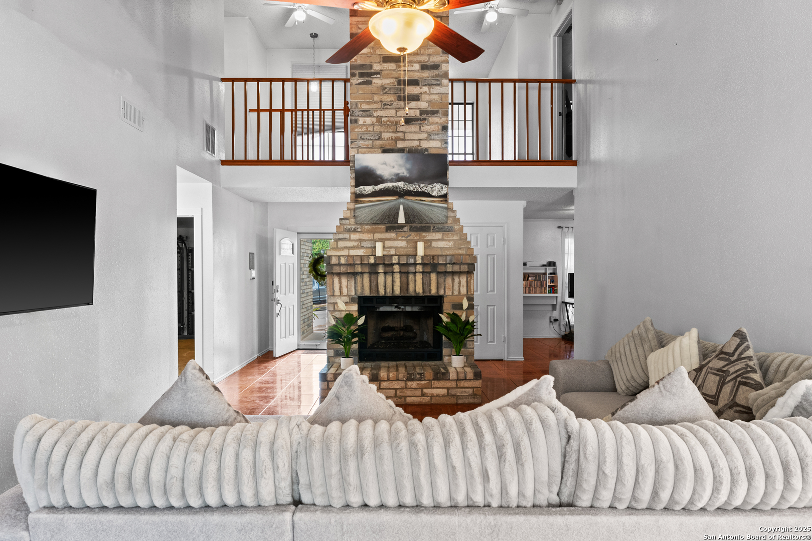 Welcome to this beautifully maintained 4-bedroom, 2.5-bath home nestled in the desirable Woodcrest community of Live Oak. Step inside to find high ceilings, tile flooring, and a stunning brick fireplace that creates a warm, inviting atmosphere. The open-concept kitchen features granite countertops, abundant cabinetry, and a spacious dining area perfect for gatherings. The primary suite downstairs offers dual walk-in closets and a spa-like bath with a soaking tub and separate shower. Upstairs includes generous secondary bedrooms and a full bath. Enjoy outdoor living year-round with a covered patio and pool. Conveniently located near shopping, dining, and major highways - this home truly has it all!