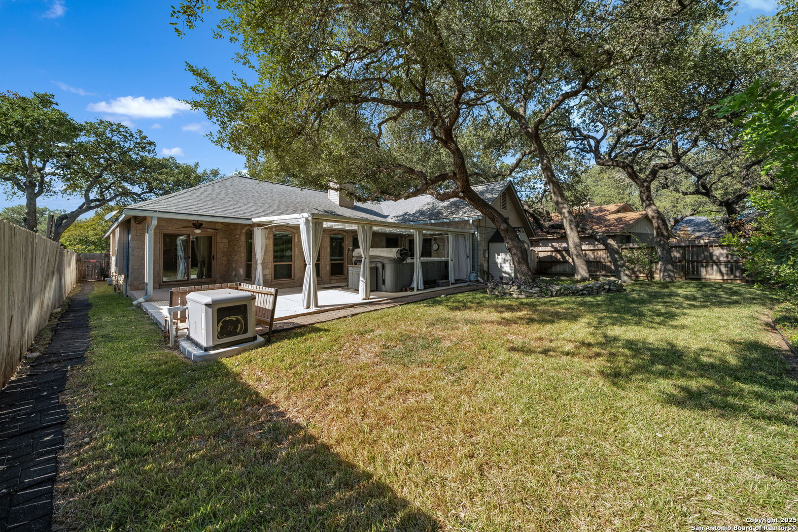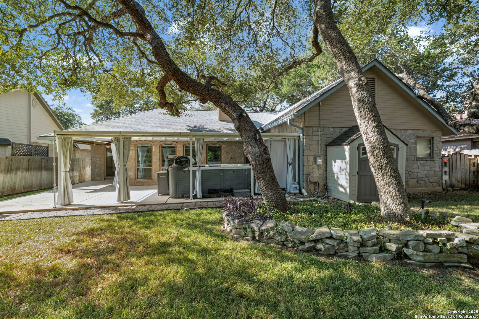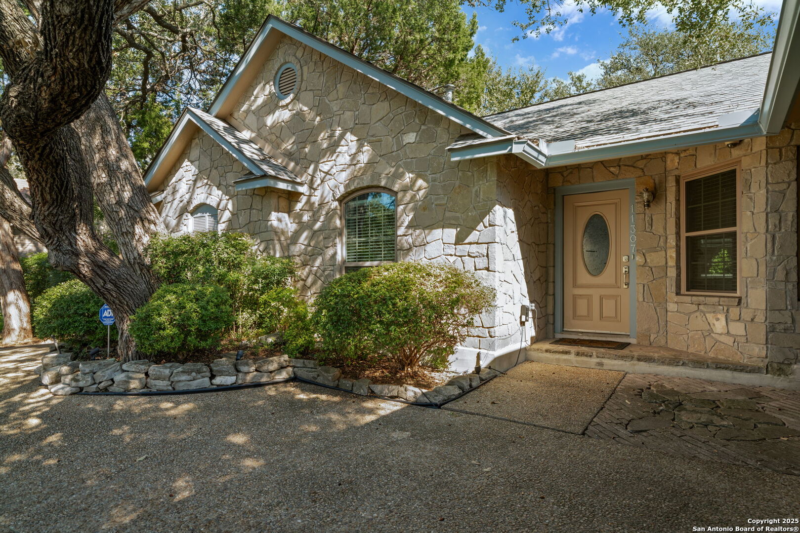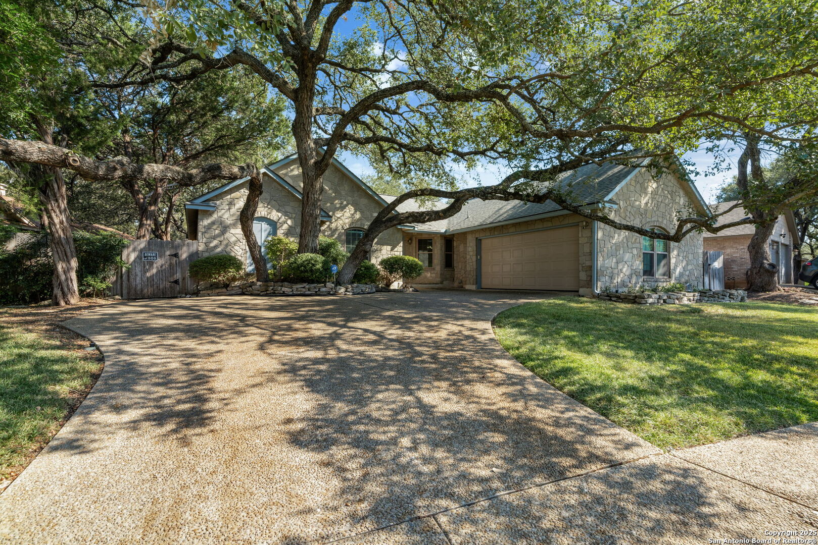 Beautiful stone 1-story home in desirable Woodridge neighborhood features 3 BR, 2 BA, an Office & 2 dining areas! Island kitchen has gas cooking & farmhouse sink. A see-through Fireplace is located between living area & office. No carpet. Spacious Primary suite has a sitting area, tray ceiling, garden soaking tub & patio access. Relaxing Covered Patio has a Swim Spa & heated shower. Backup generator included! Community pool, playground, tennis & sport courts. Near UTSA, USAA, Medical Center & shopping!