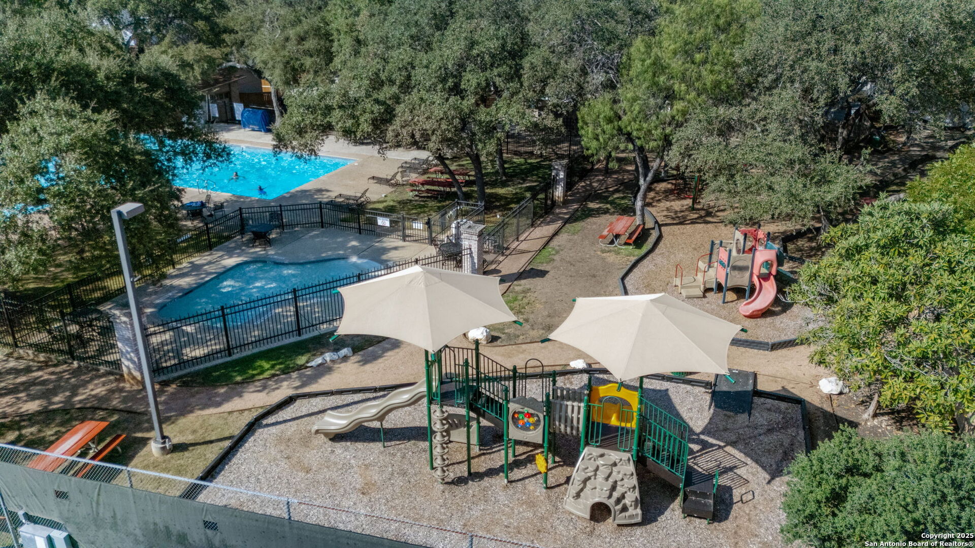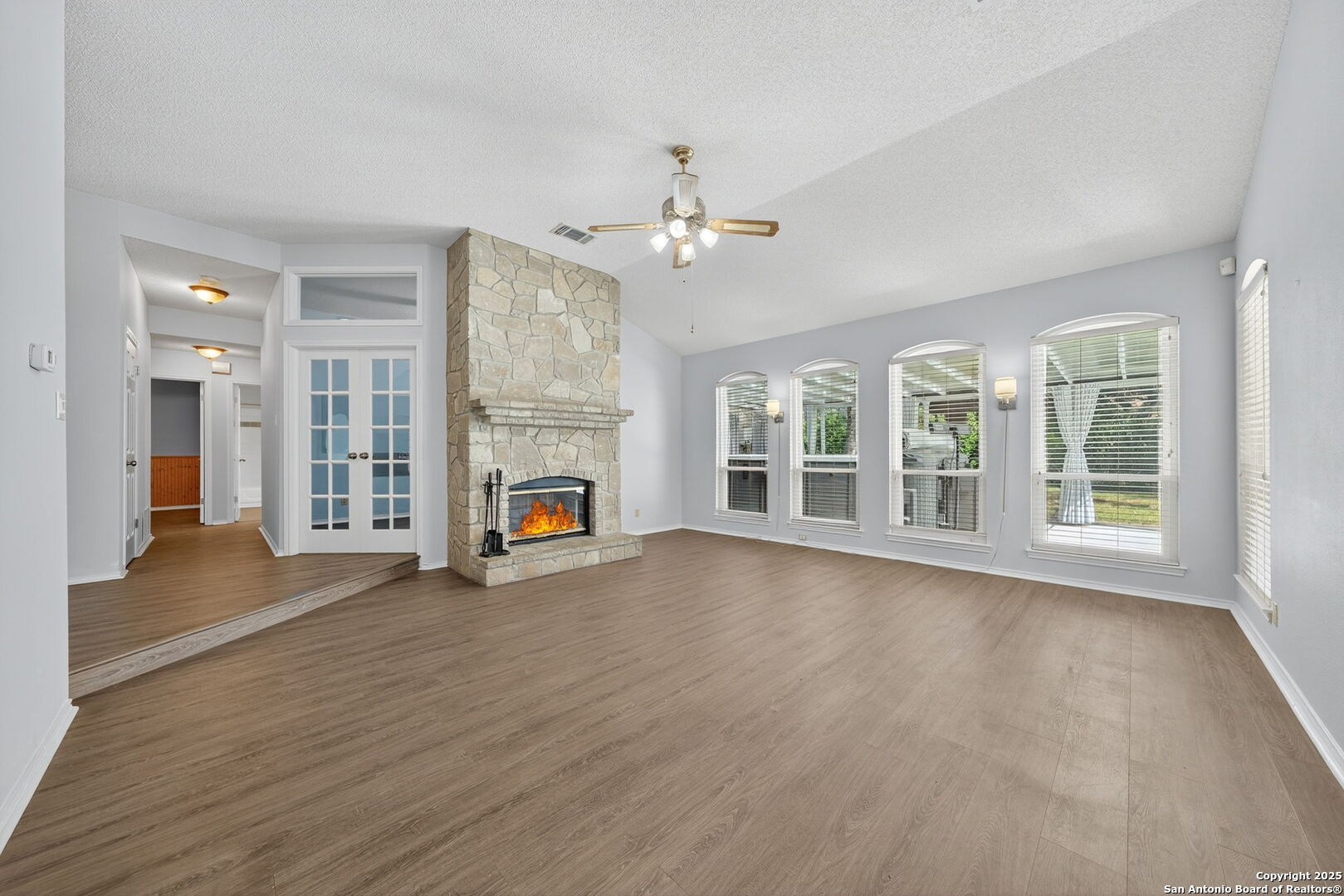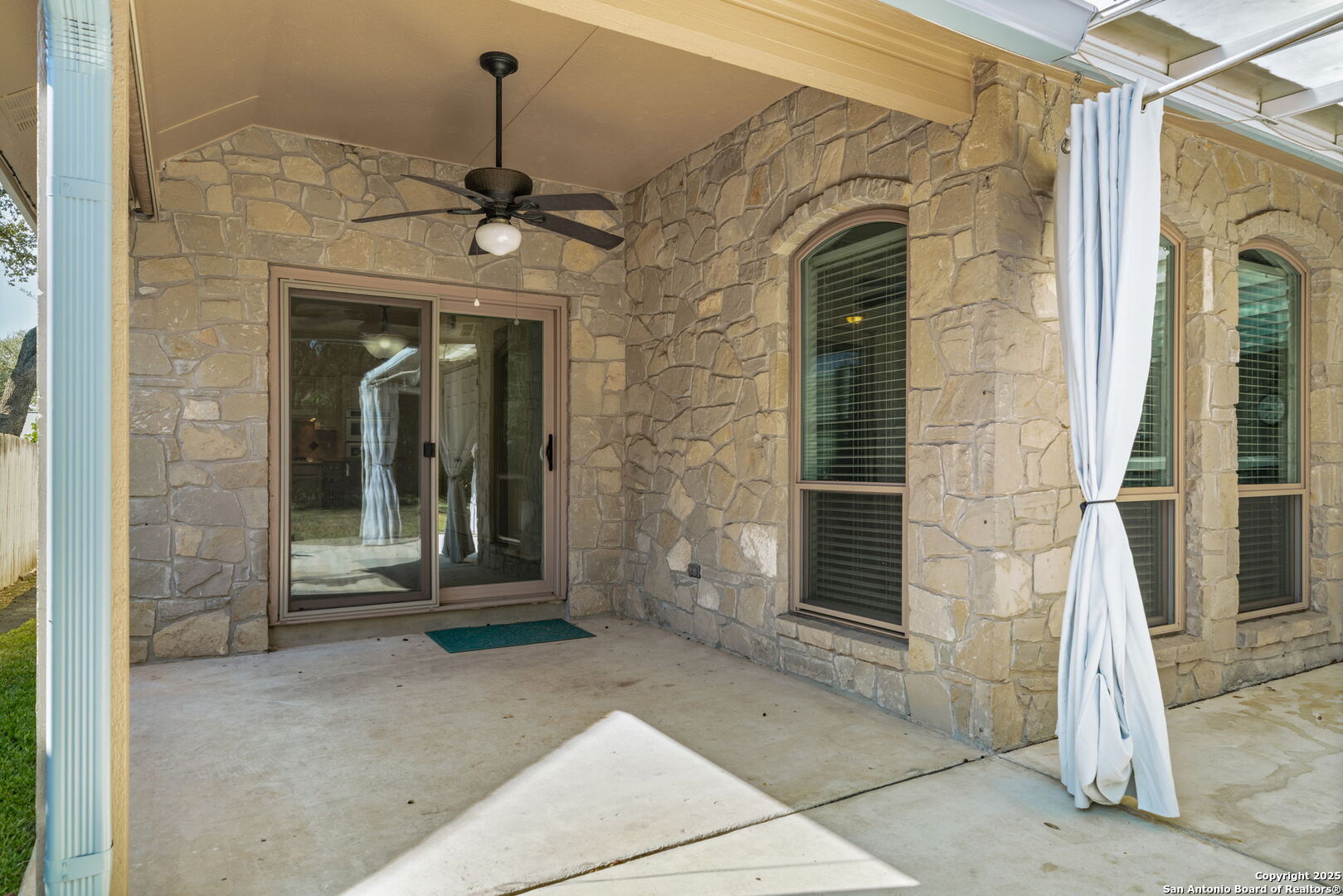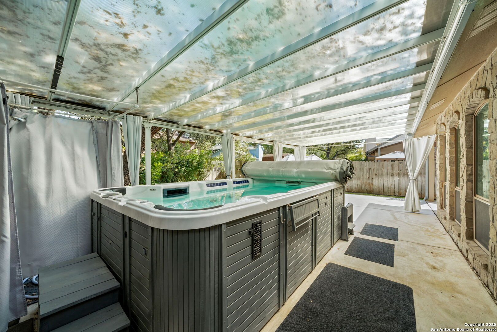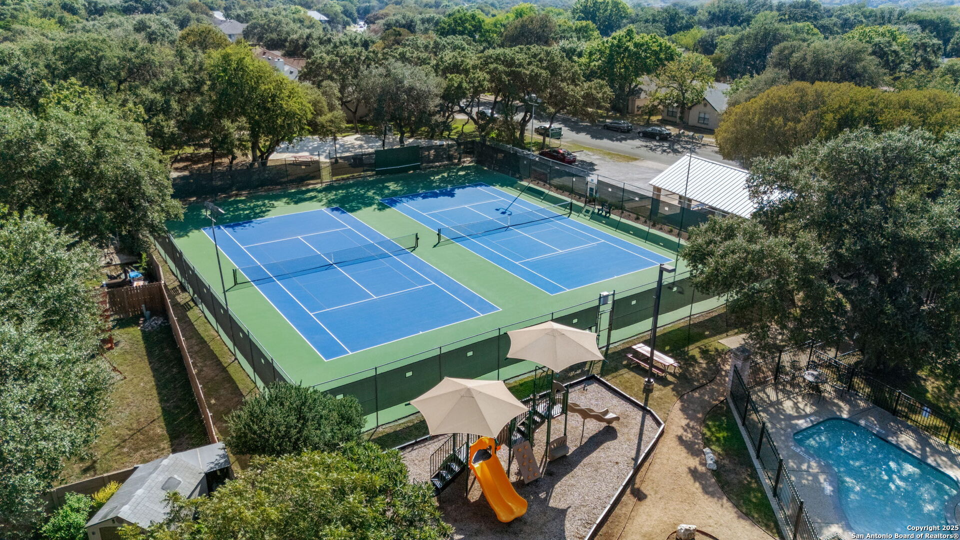 Beautiful stone 1-story home in desirable Woodridge neighborhood features 3 BR, 2 BA, an Office & 2 dining areas! Island kitchen has gas cooking & farmhouse sink. A see-through Fireplace is located between living area & office. No carpet. Spacious Primary suite has a sitting area, tray ceiling, garden soaking tub & patio access. Relaxing Covered Patio has a Swim Spa & heated shower. Backup generator included! Community pool, playground, tennis & sport courts. Near UTSA, USAA, Medical Center & shopping!