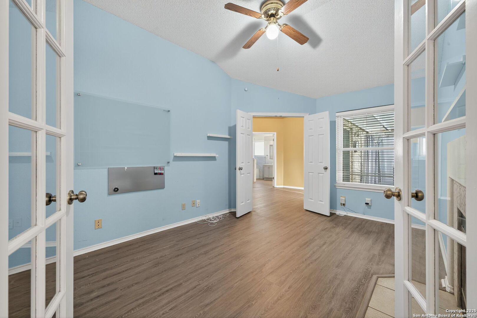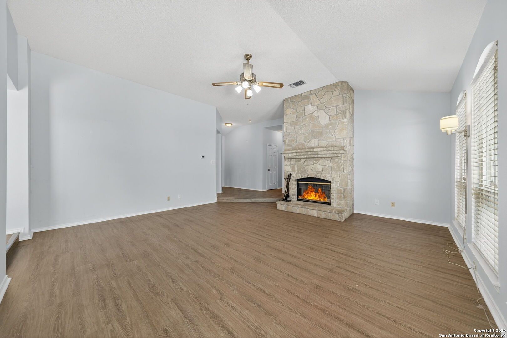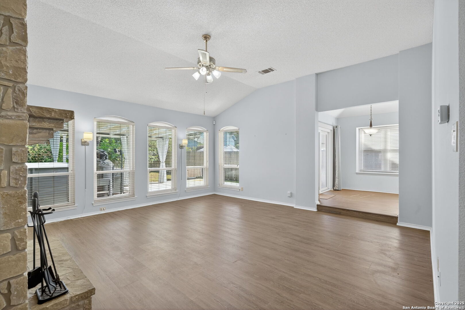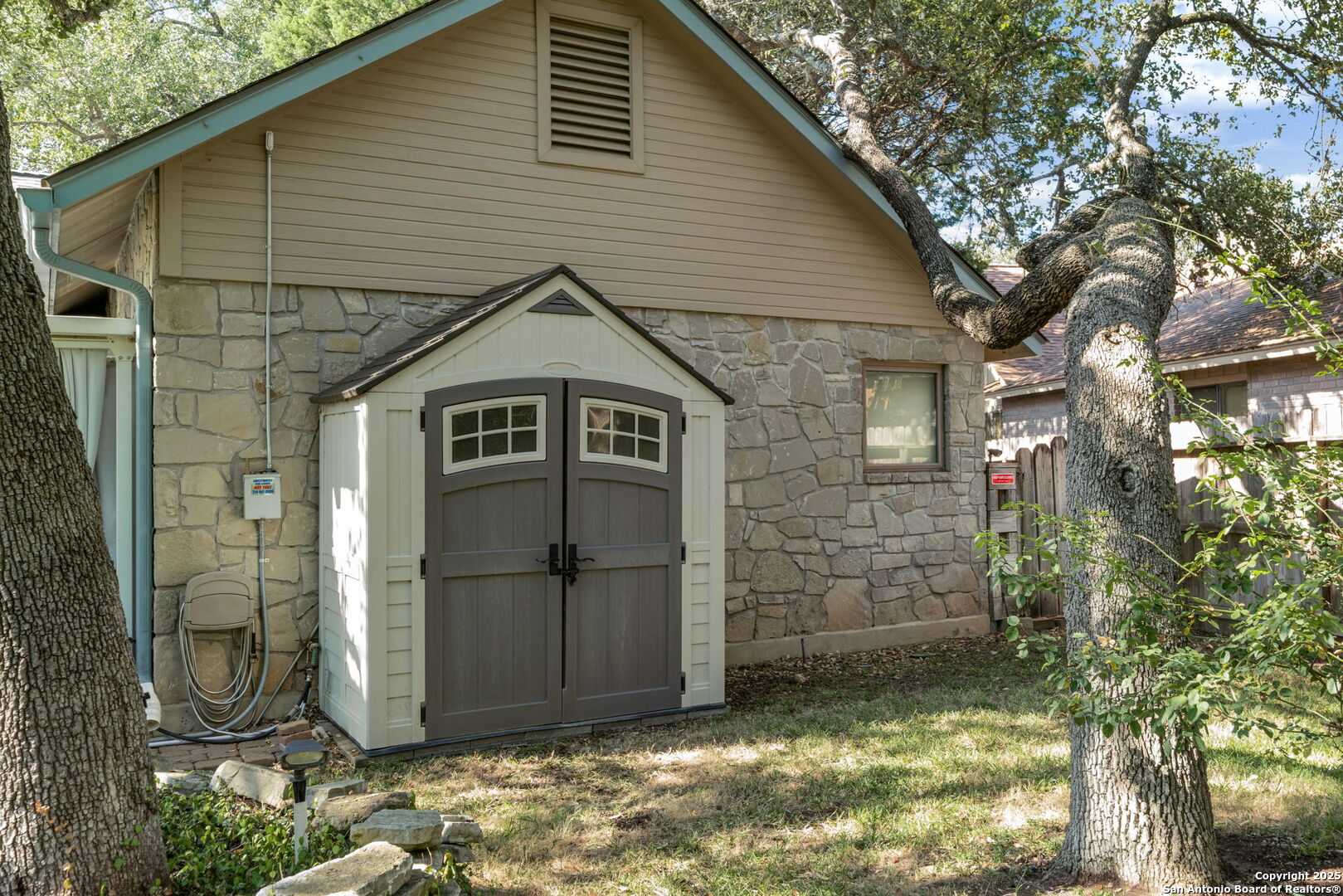 Beautiful stone 1-story home in desirable Woodridge neighborhood features 3 BR, 2 BA, an Office & 2 dining areas! Island kitchen has gas cooking & farmhouse sink. A see-through Fireplace is located between living area & office. No carpet. Spacious Primary suite has a sitting area, tray ceiling, garden soaking tub & patio access. Relaxing Covered Patio has a Swim Spa & heated shower. Backup generator included! Community pool, playground, tennis & sport courts. Near UTSA, USAA, Medical Center & shopping!