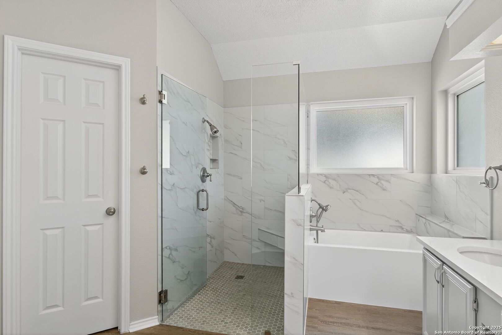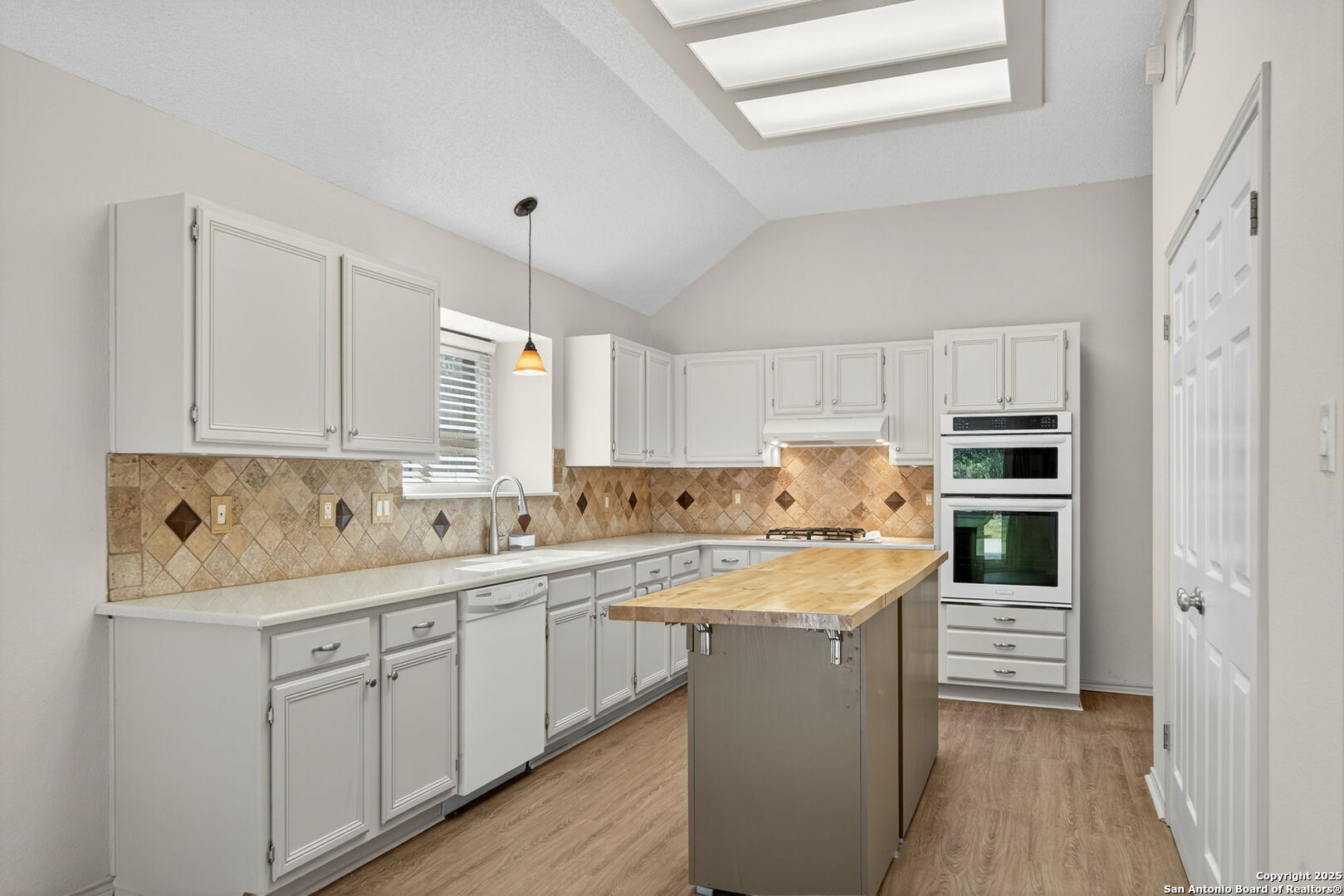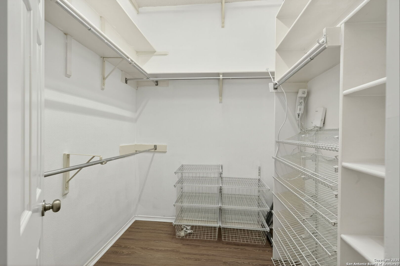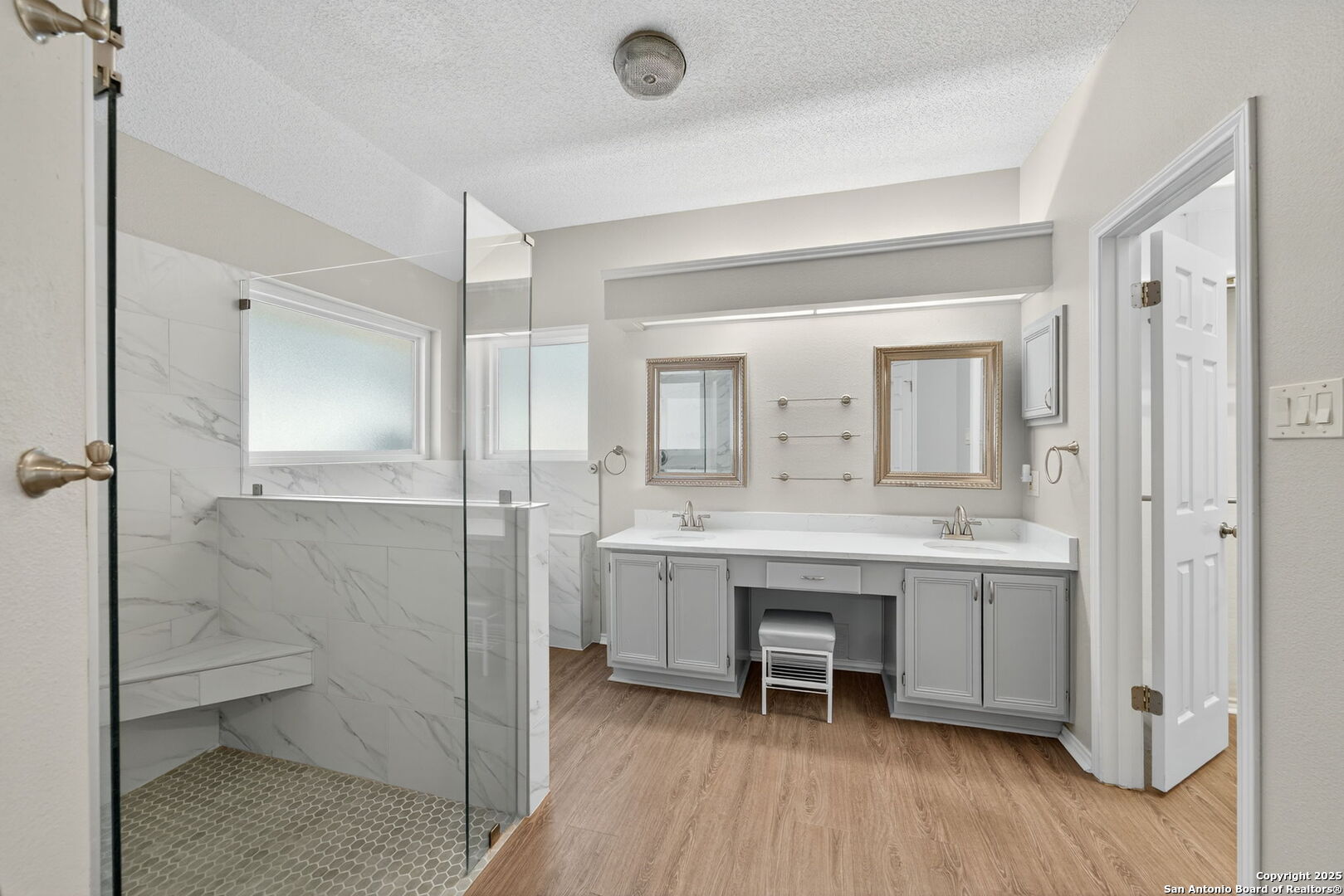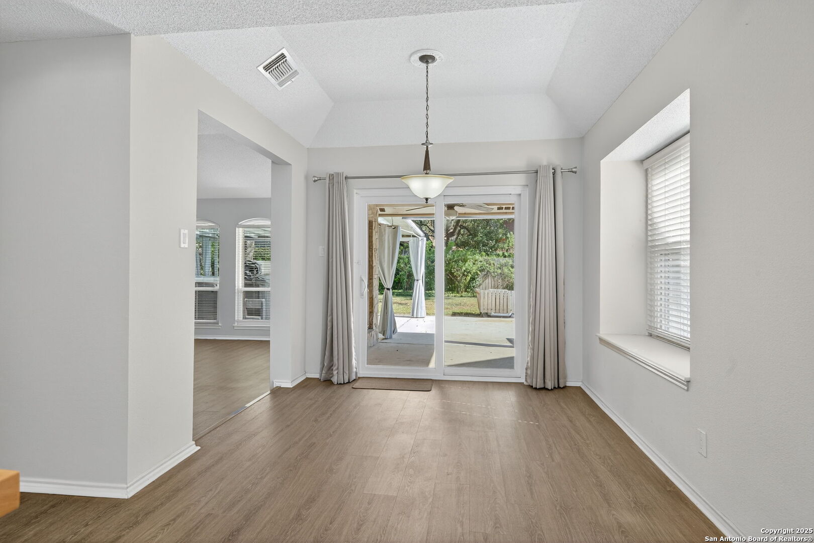 Beautiful stone 1-story home in desirable Woodridge neighborhood features 3 BR, 2 BA, an Office & 2 dining areas! Island kitchen has gas cooking & farmhouse sink. A see-through Fireplace is located between living area & office. No carpet. Spacious Primary suite has a sitting area, tray ceiling, garden soaking tub & patio access. Relaxing Covered Patio has a Swim Spa & heated shower. Backup generator included! Community pool, playground, tennis & sport courts. Near UTSA, USAA, Medical Center & shopping!