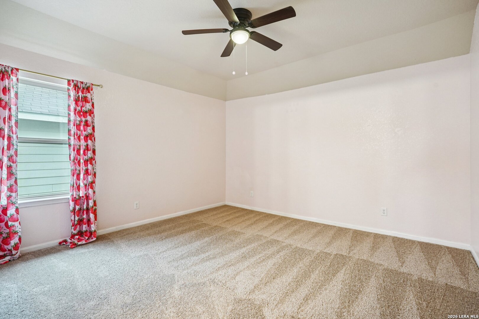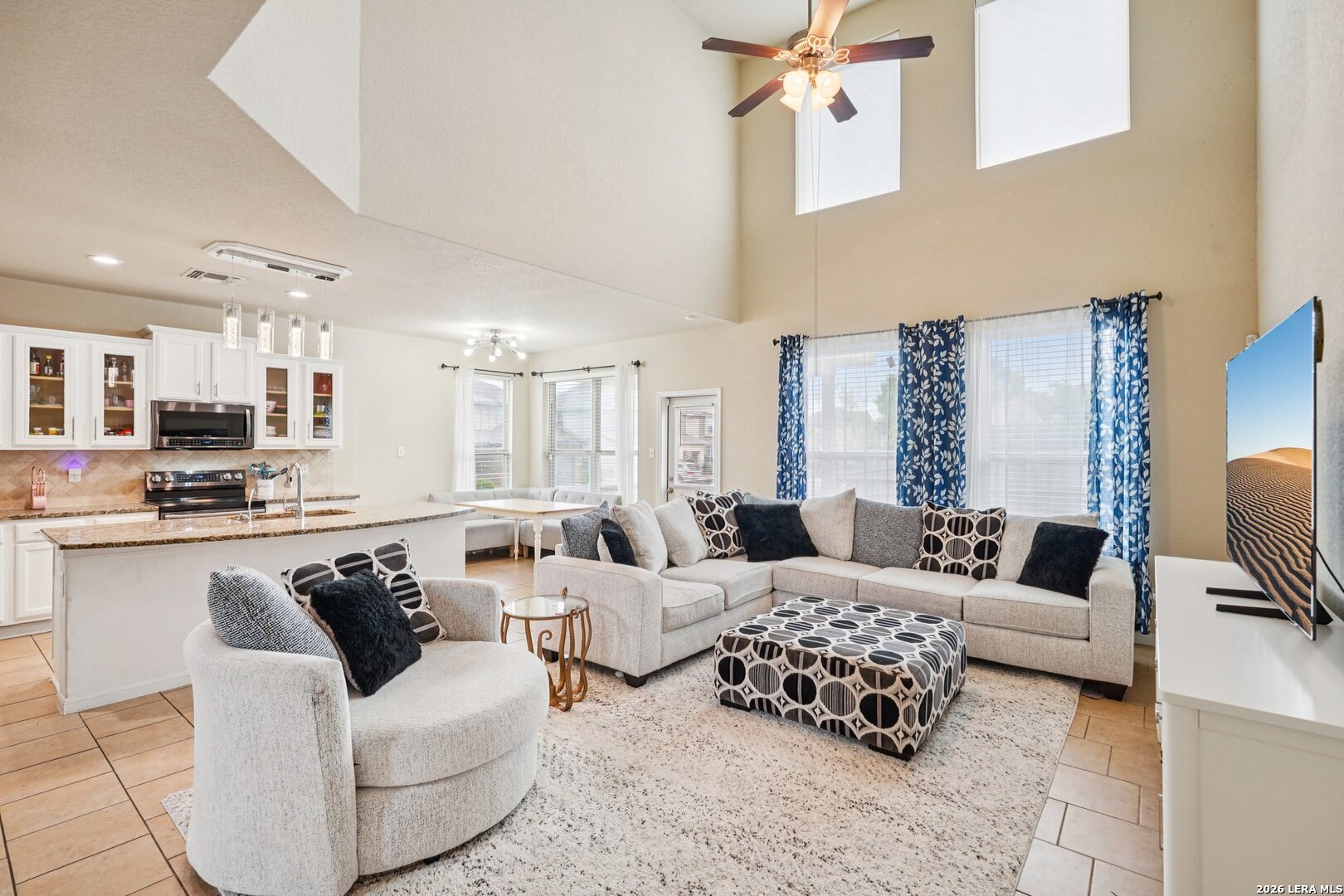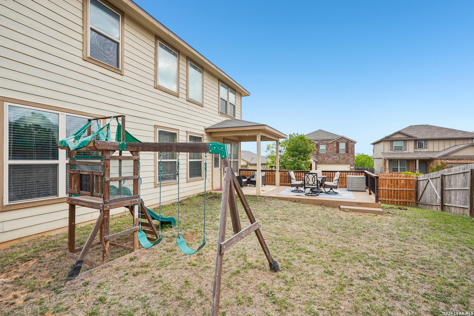Don't miss this contemporary 2 story home on a corner lot with gorgeous curb appeal, 4 bedrooms, 3.5 bathrooms, and many custom upgrades. You'll love the dramatic entryway, high ceilings, and natural lighting. This spacious property offers an open floor plan, modern kitchen with a large island, tons of cabinetry, stone counters, and stainless steel appliances. Unwind in your downstairs primary suite with a spa-like bathroom featuring dual vanities, marble finishes, a dreamy walk-in closet with custom built-ins, and a luxurious soaking tub. Upstairs you'll find 3 additional bedrooms (Jack & Jill), 2 full bathrooms, and a game room with doors for extra privacy. You also get a bonus room on the main level which is perfect for an office space or sitting room. Enjoy backyard BBQ's and relaxation with your covered patio and deck area. Trampoline and outdoor playset included. Roof replaced in 2021. Convenient location with easy access to 1604/90/151, Home Depot, new Target coming soon, Costco, dining, shopping, entertainment, Lackland, and Sea World just minutes away.