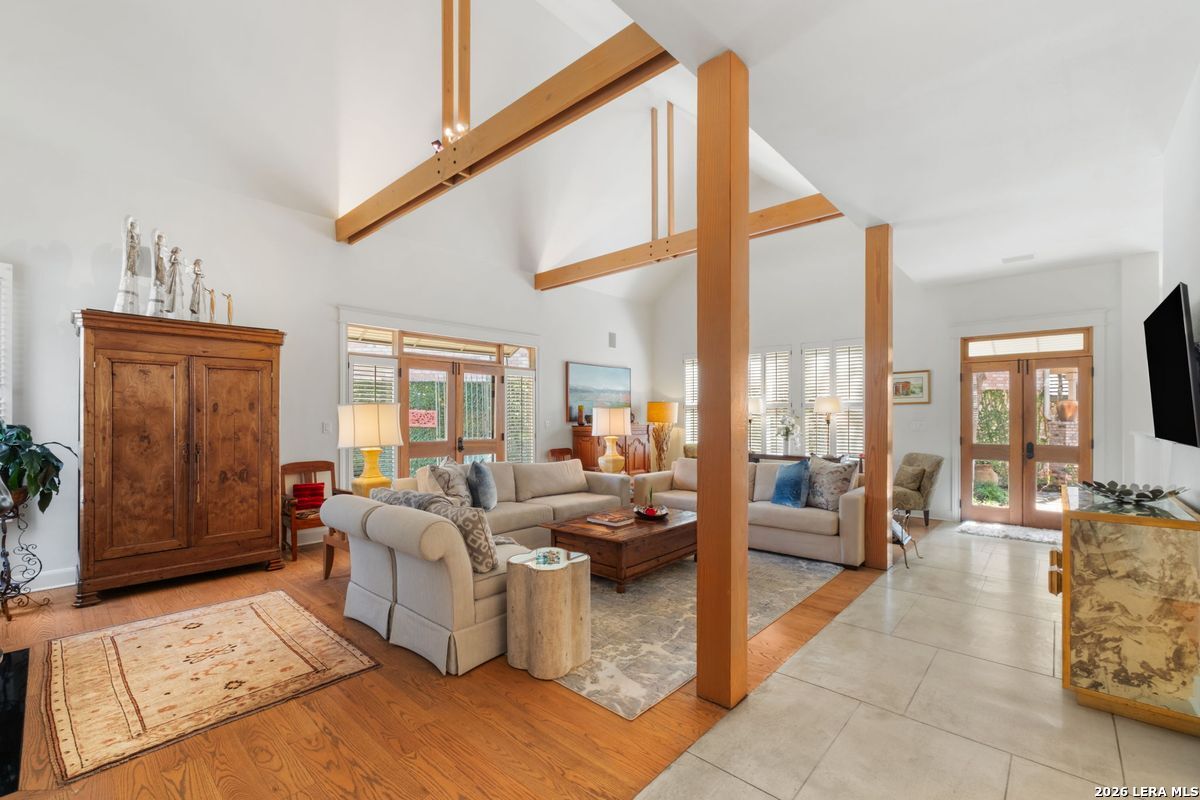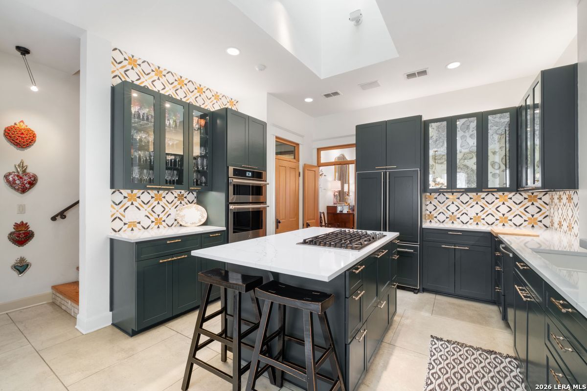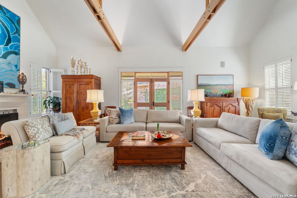 A masterful blend of timeless design and modern elegance, this beautifully curated and renovated home exudes impeccable style. The fully re-imagined kitchen is a showstopper, featuring a striking Sedate White quartz island and countertops, deep green cabinetry-some accented with custom acid-washed mirrored fronts-and a dramatic backsplash with a geometric mix of white, gold, and black marble tiles. Expansive living and dining spaces boast a sophisticated mix of scored contemporary concrete and wide-plank natural wood floors. A sleek, modern fireplace anchors the soaring, vaulted-beamed living room, complemented by an armoire-style wet bar. The dining room ceiling adds another layer of design intrigue with textured designer wallpaper. The serene primary suite offers a true retreat, with two walk-in closets and an en-suite bath adorned with breathtaking Brazilian Patagonian quartzite. This rare natural stone swirls with tones of white, black, gold, and beige, accented by translucent gray veining. Apron-style vanities with wall-mounted faucets add a touch of refinement, while a sculptural soaking tub is set against a statement-making book-matched stone wall-an artistic focal point in its own right. Upstairs, two well-appointed bedrooms share a stylish bath, along with a spacious loft outfitted with built-ins-perfect for a home office or creative space. The outdoor living area is equally impressive, offering a private, turfed yard with flagstone accents, all set behind an elegant wrought iron gate for added privacy. This home is a true masterpiece of design, offering both luxurious comfort and striking architectural detail.