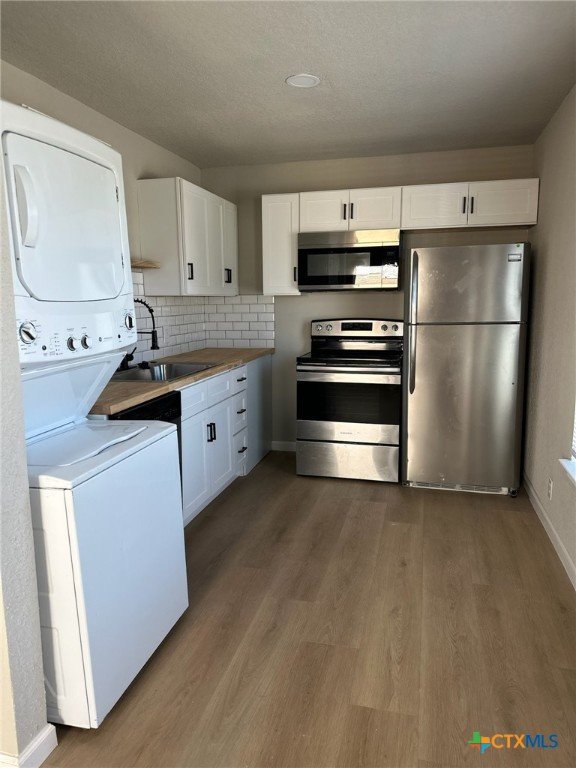 Updated duplex with wood-look flooring throughout the home. The kitchen features stainless and black appliances, a tile backsplash, a pot-filler sink, and a stacked washer and dryer. Both bedrooms are spacious. The bathroom is beautiful, with a rainfall shower head and accent lighting. Coat closet for extra storage. Recessed lighting and ceiling fans. Easily hop on 90, 123, or I-10, and lots of conveniences within moments.
