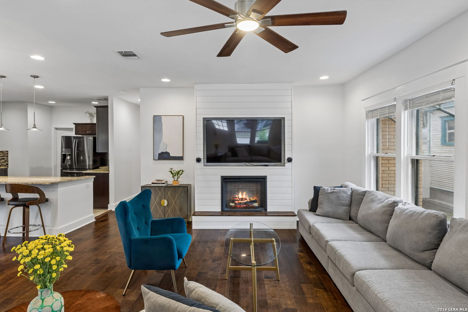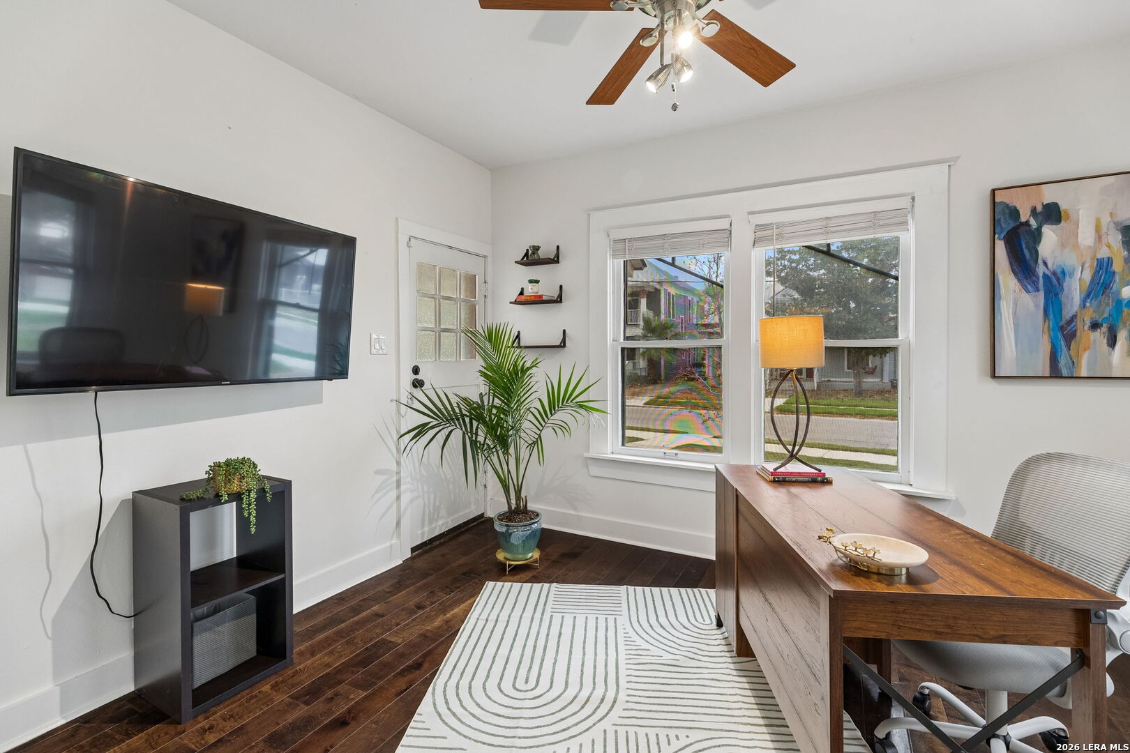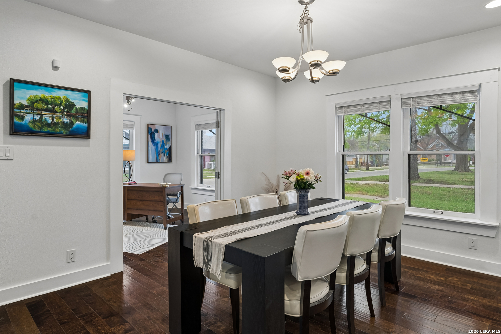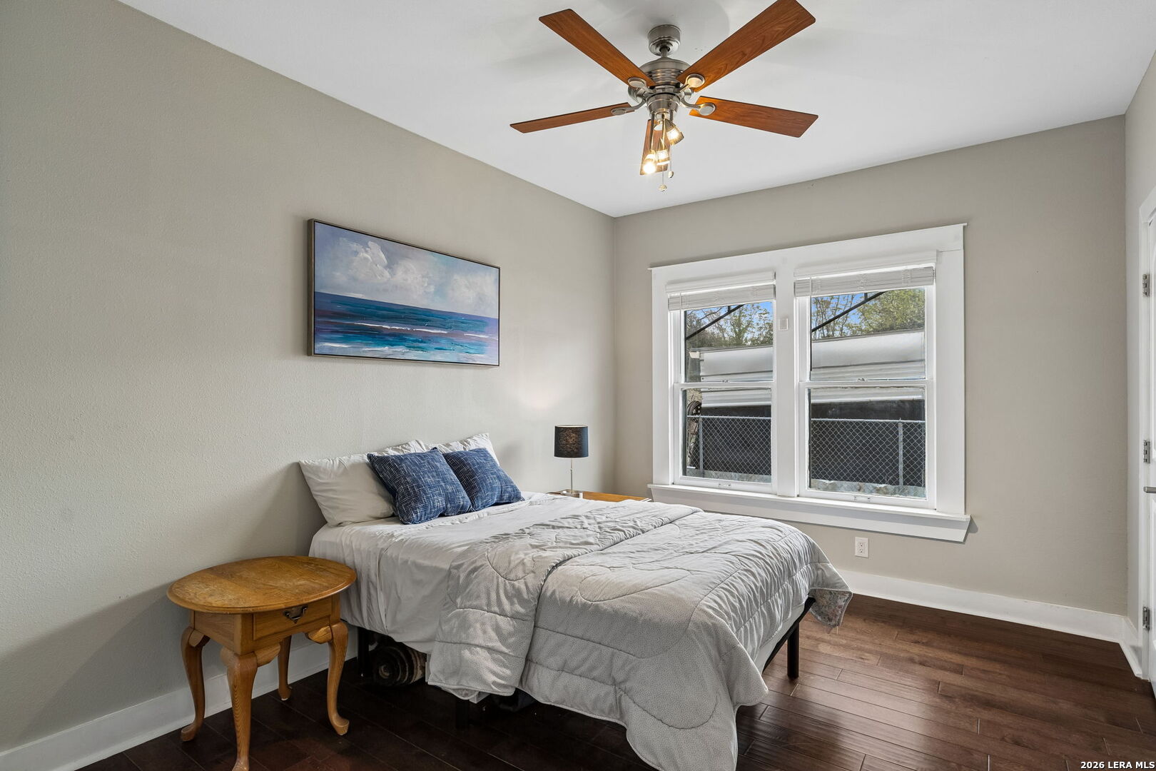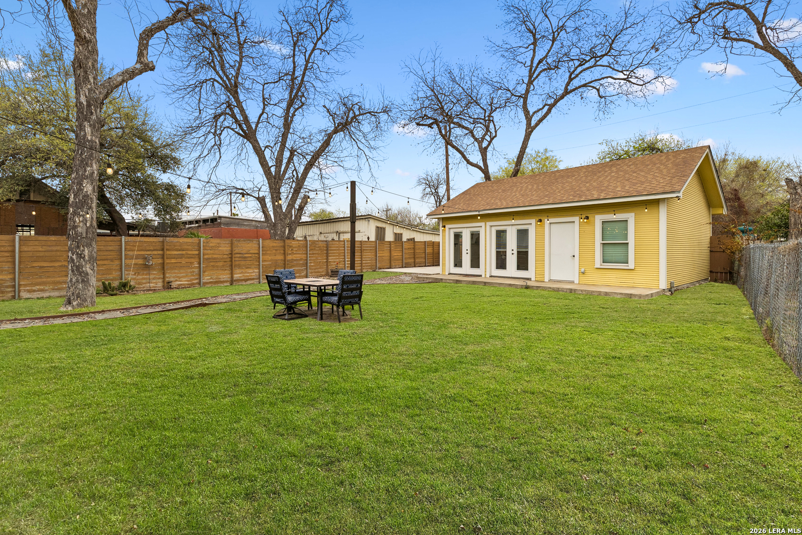 Just steps from the energy of downtown San Antonio, 115 Delaware St sits in a pocket of the city where everything feels within reach, from morning coffee runs to evenings out in Southtown and along the River Walk. A covered front porch welcomes you in, leading to light-filled interiors framed by craftsman-style windows, where the living room anchors the front of the home and flows naturally into the dining area and kitchen beyond, creating an easy, connected layout for everyday living. Updates over time have been made with function in mind, including a custom-built media wall with an electric fireplace, expanded laundry room with barn doors, wood flooring and ceramic tile throughout, updated fixtures, and recently improved major systems including HVAC and electrical. The primary suite offers a quiet retreat with a refreshed bath featuring a Jacuzzi tub and glass shower entry, while the rest of the home maintains a consistent sense of comfort and cohesion. Out back, mature pecan trees shade a deep, private yard with rear gated access, off-street parking, and a detached garage paired with a finished flex space completed in 2020, ideal for a studio, office, or additional living space. Weekends unfold naturally here, with stops at CommonWealth Coffeehouse & Bakery, afternoons exploring nearby favorites, and evenings at Bliss or Rosario's, all just moments away, while even glimpses of the Tower of the Americas from the backyard serve as a reminder of how connected this location truly is. This unique brick bungalow filled with history is thoughtfully improved and positioned in one of the most connected locations in San Antonio, offering a lifestyle that feels both grounded and distinctly urban.