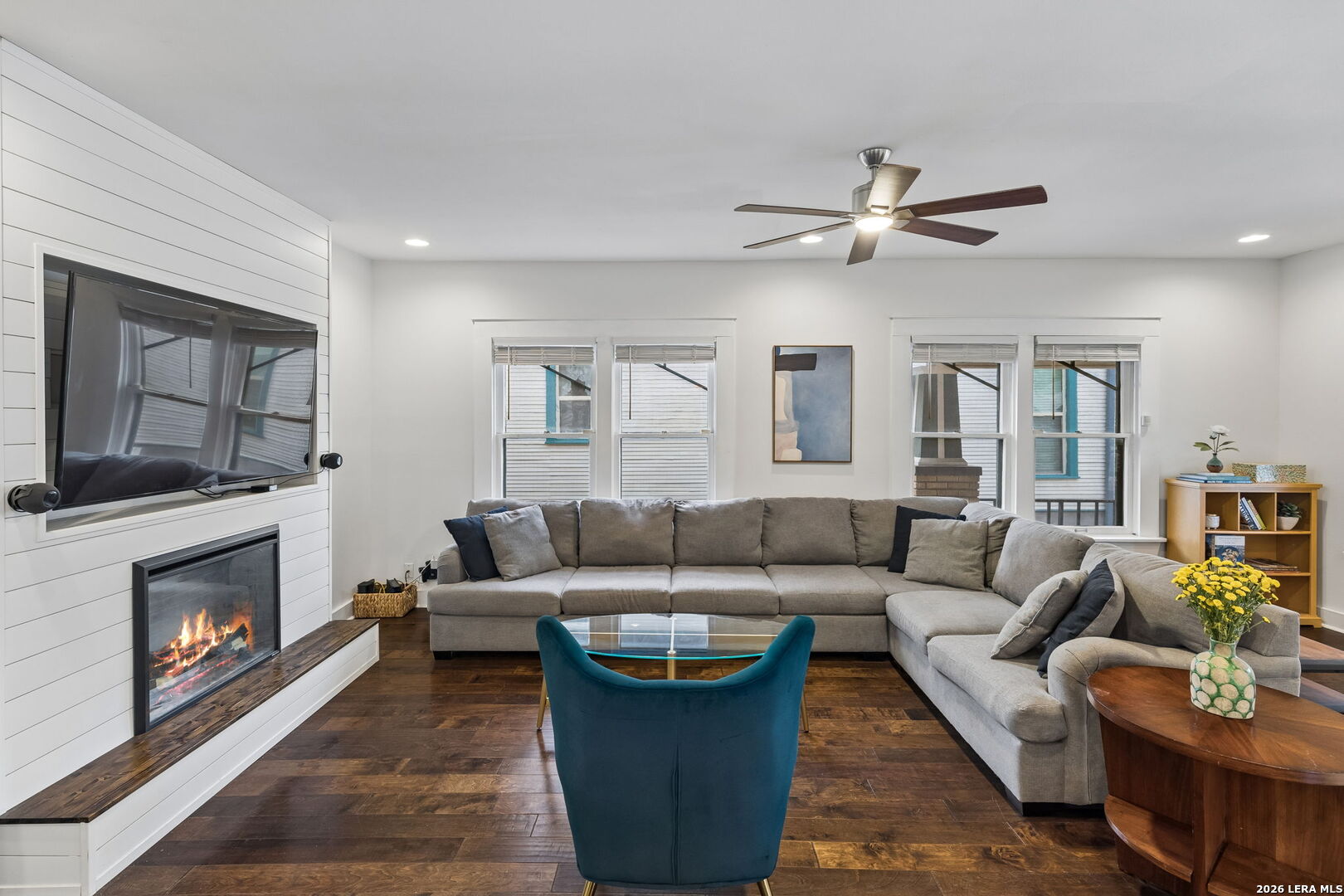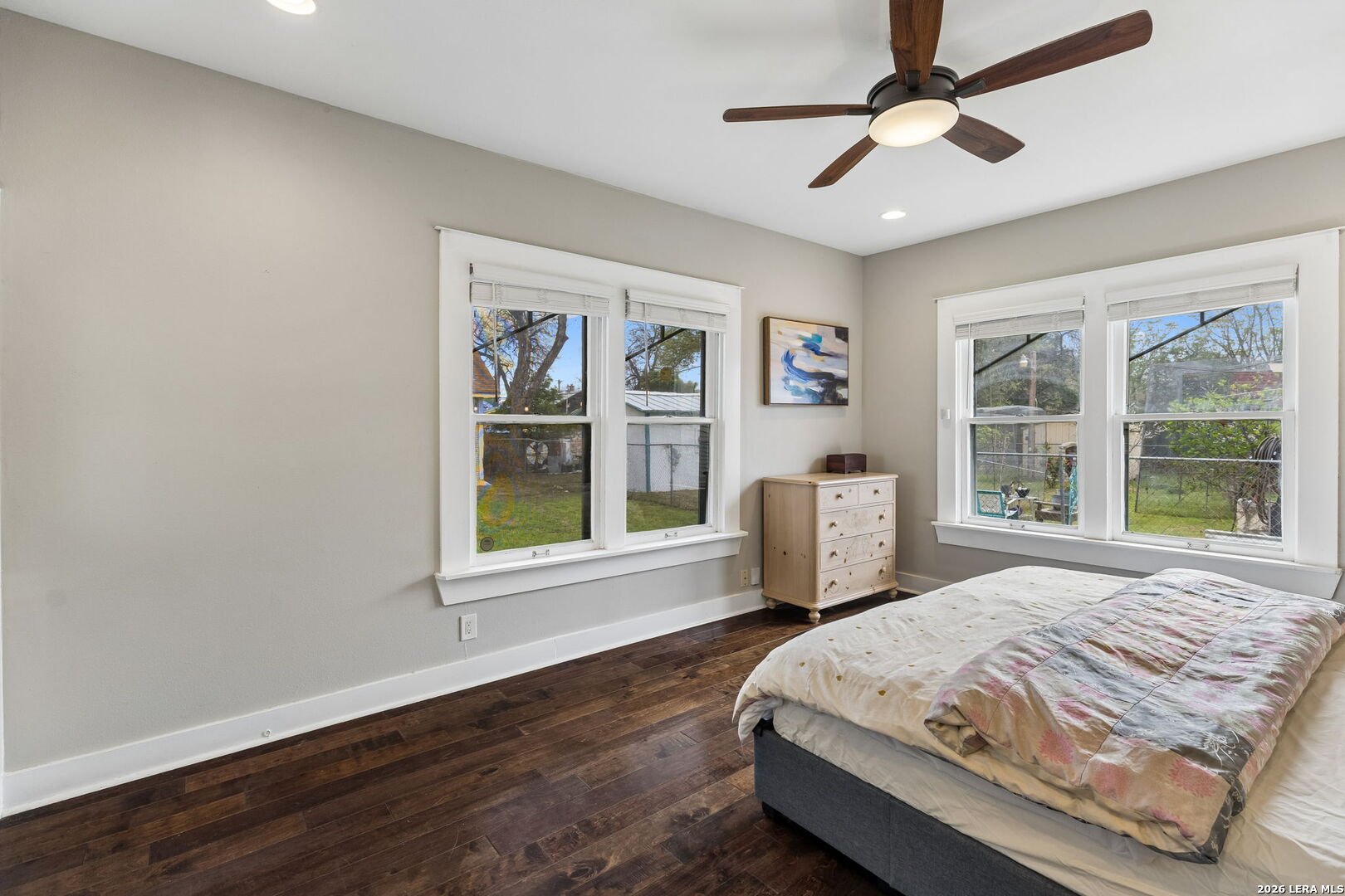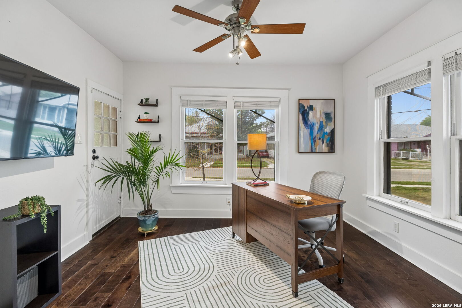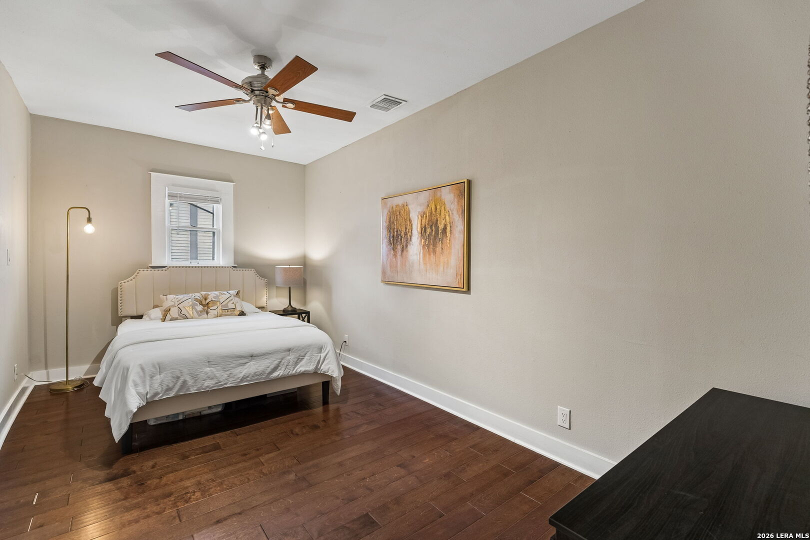 Just steps from the energy of downtown San Antonio, 115 Delaware St sits in a pocket of the city where everything feels within reach, from morning coffee runs to evenings out in Southtown and along the River Walk. A covered front porch welcomes you in, leading to light-filled interiors framed by craftsman-style windows, where the living room anchors the front of the home and flows naturally into the dining area and kitchen beyond, creating an easy, connected layout for everyday living. Updates over time have been made with function in mind, including a custom-built media wall with an electric fireplace, expanded laundry room with barn doors, wood flooring and ceramic tile throughout, updated fixtures, and recently improved major systems including HVAC and electrical. The primary suite offers a quiet retreat with a refreshed bath featuring a Jacuzzi tub and glass shower entry, while the rest of the home maintains a consistent sense of comfort and cohesion. Out back, mature pecan trees shade a deep, private yard with rear gated access, off-street parking, and a detached garage paired with a finished flex space completed in 2020, ideal for a studio, office, or additional living space. Weekends unfold naturally here, with stops at CommonWealth Coffeehouse & Bakery, afternoons exploring nearby favorites, and evenings at Bliss or Rosario's, all just moments away, while even glimpses of the Tower of the Americas from the backyard serve as a reminder of how connected this location truly is. This unique brick bungalow filled with history is thoughtfully improved and positioned in one of the most connected locations in San Antonio, offering a lifestyle that feels both grounded and distinctly urban.