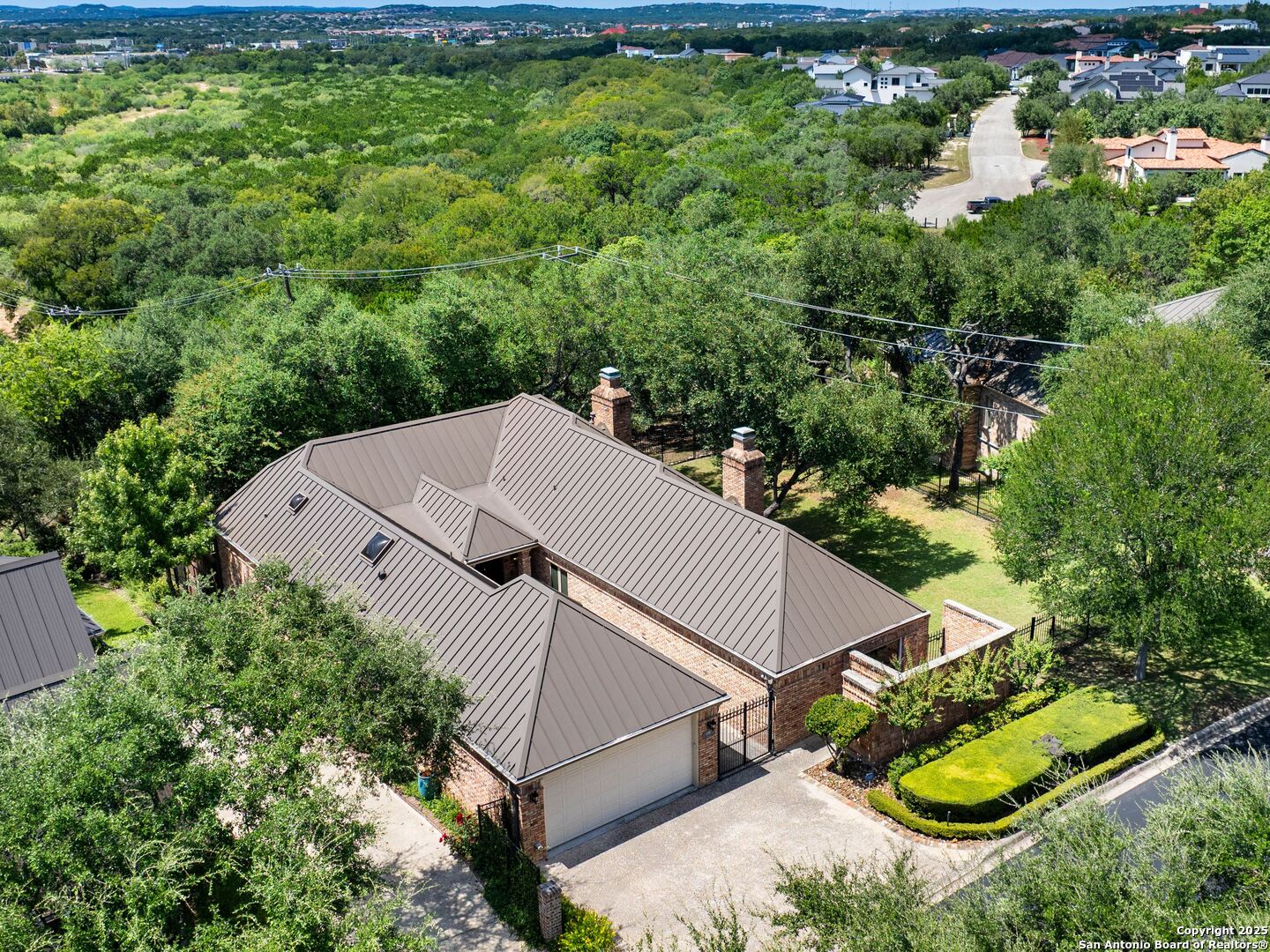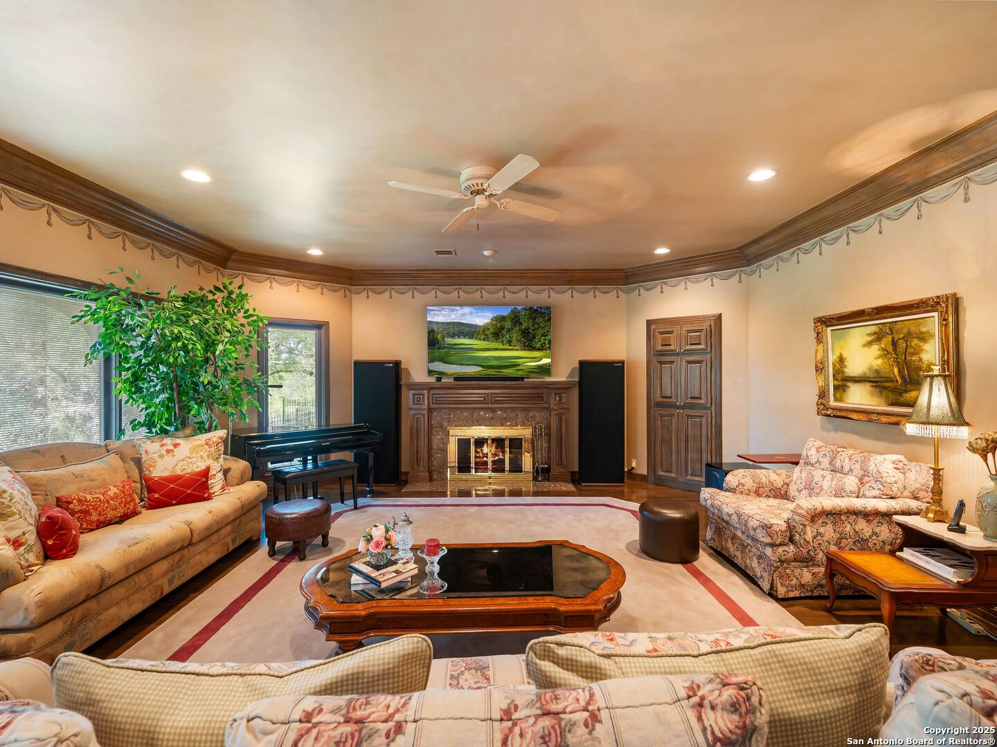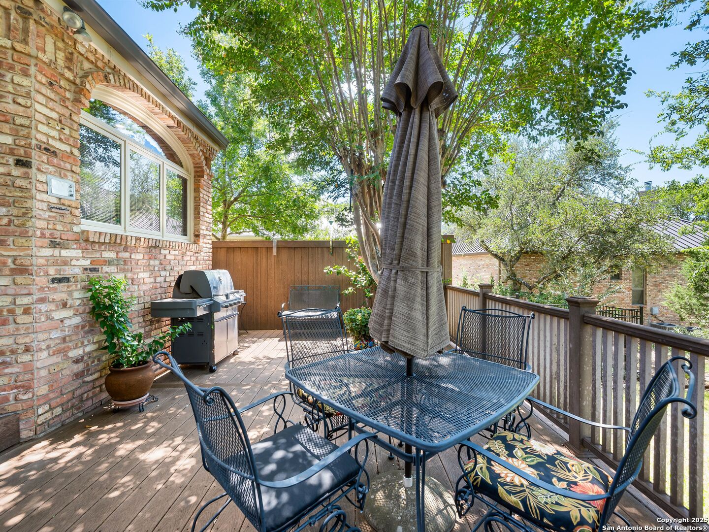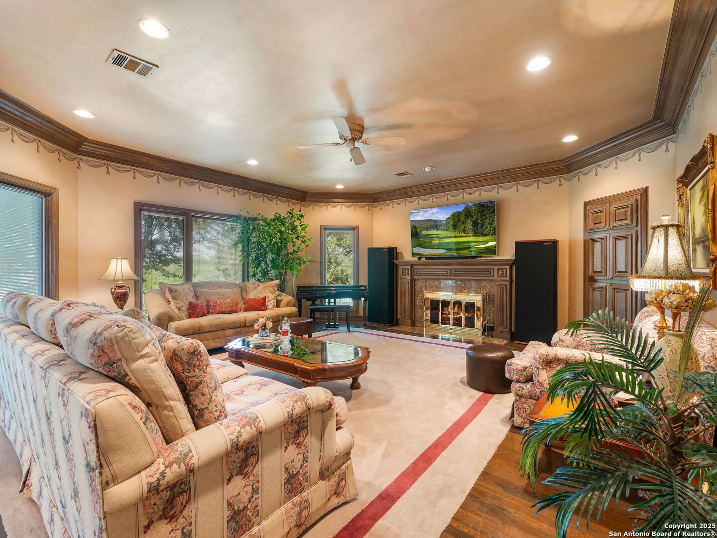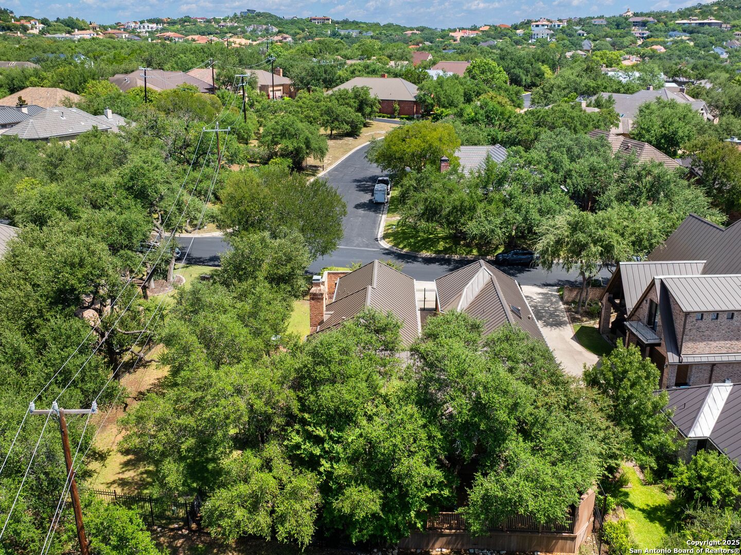 Located in The Dominion Gardens, this residence rests on a premium double lot backing to a greenbelt for exceptional privacy. Interior features include hardwood floors, custom crown moulding, and expansive windows framing treetop views. The chef's kitchen is outfitted with gas cooking, dual ovens, a 6-burner range with vent hood, and an ice maker. Designed for entertaining, the centrally located dining area flows seamlessly into the family room and wet bar. The primary suite offers outdoor access through dual French doors, a fireplace, two oversized custom closets, and a spacious bath with dual vanities, a wet bar, and private water closet with bidet. Secondary bedrooms feature en suite baths and custom built-ins. Enjoy serene greenbelt views from the generous composite deck, perfect for outdoor living and entertaining. Oversized two-car garage with separate golf cart bay currently utilized as a utility room but easily converted back. Located in one of San Antonio's most prestigious communities, this property is convenient to Dominion Country Club's amenities, shopping, restaurants, major employers, and Medical Center.