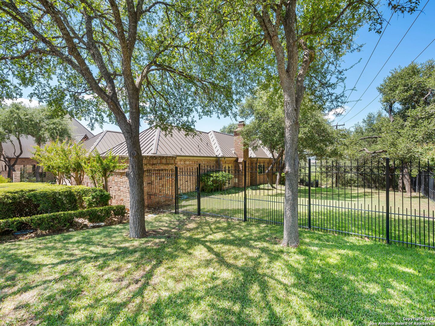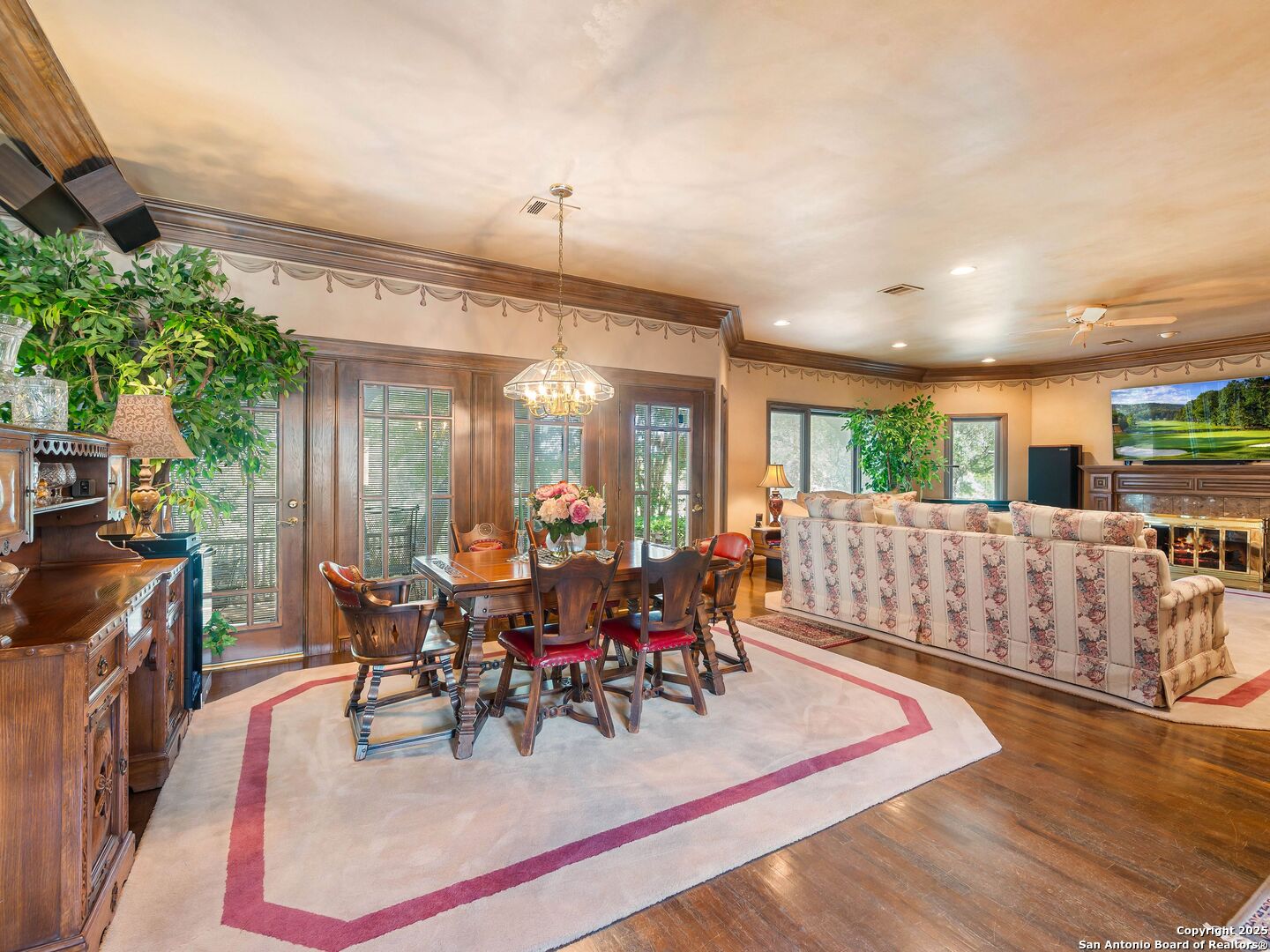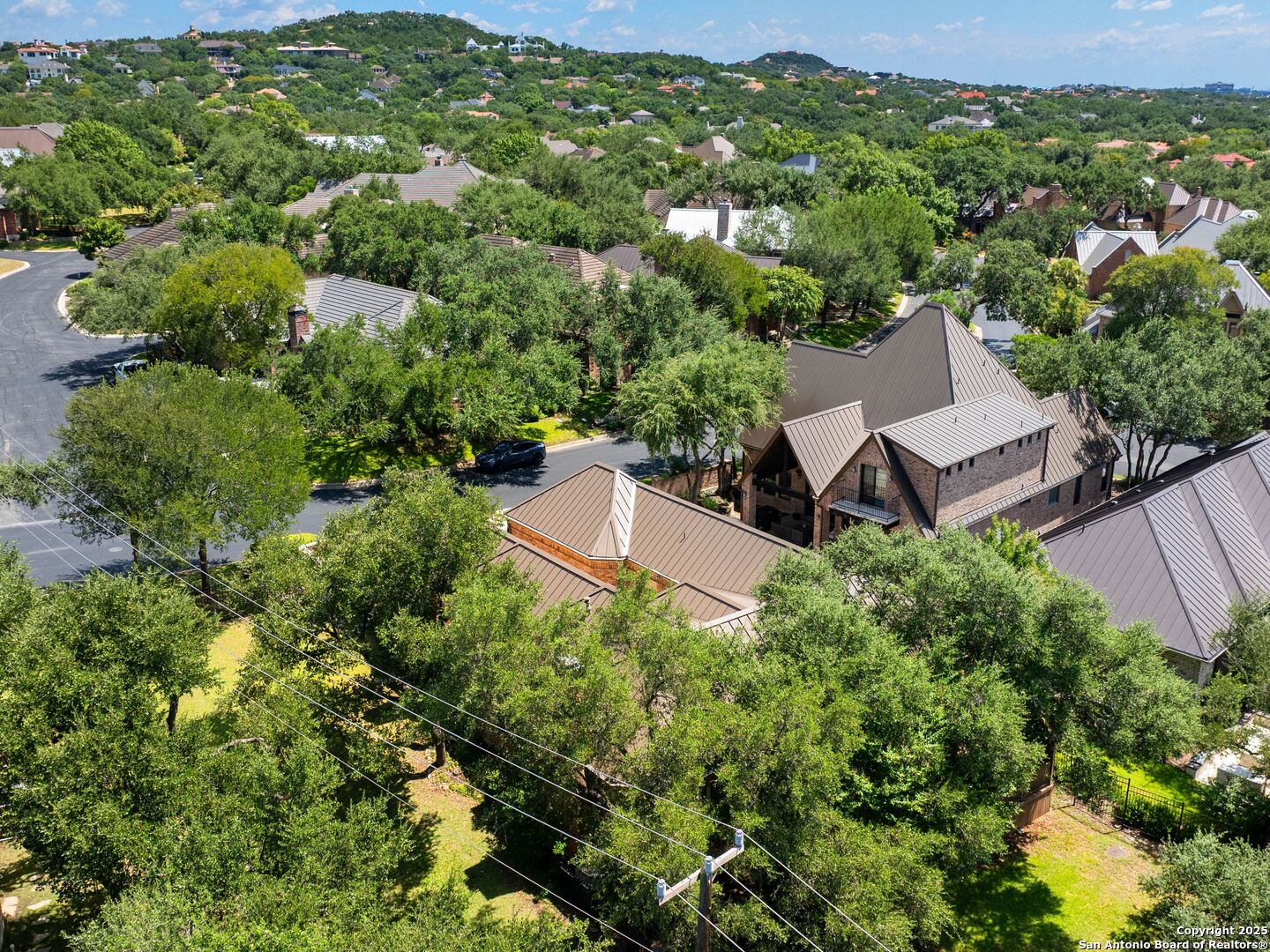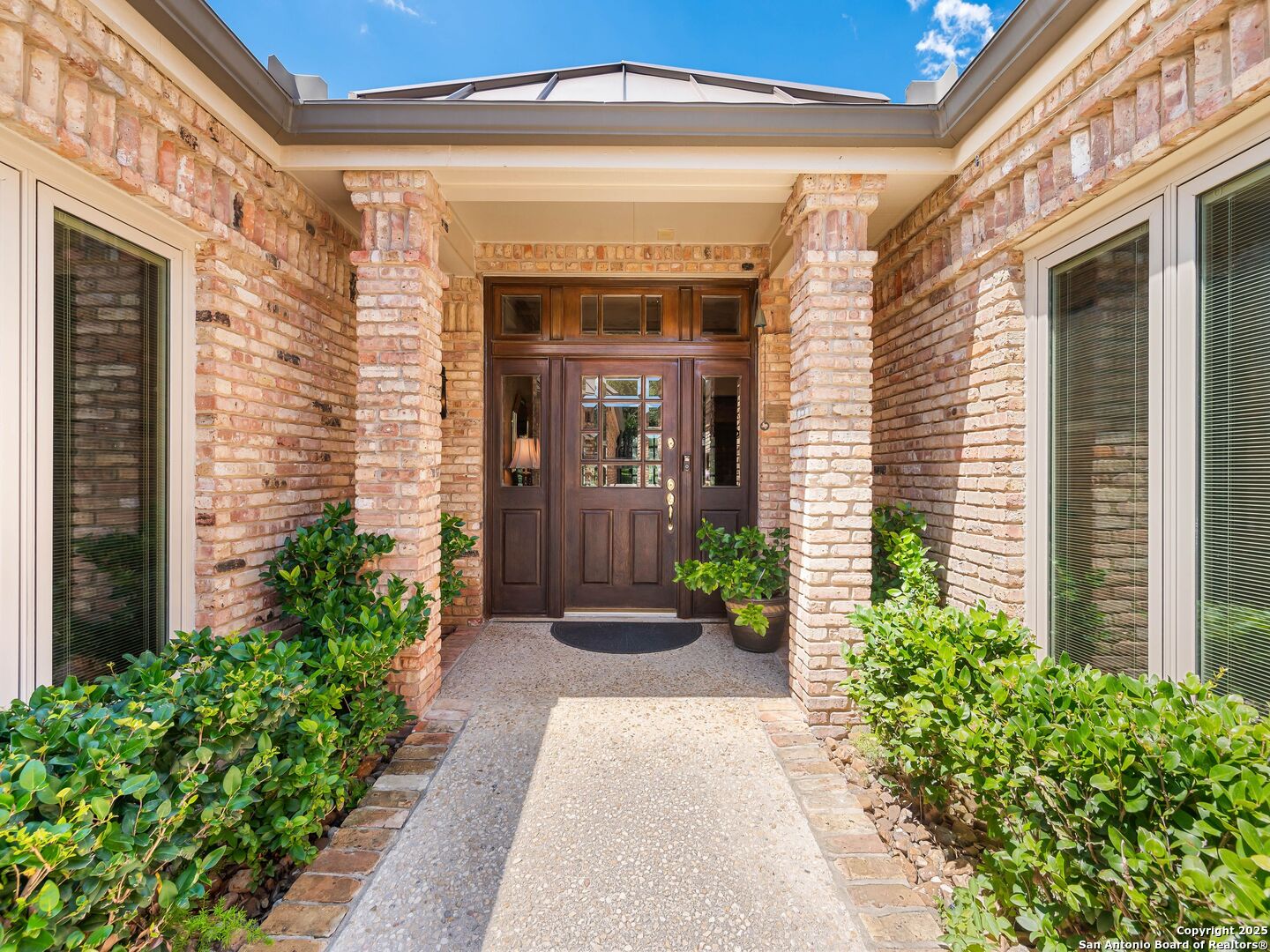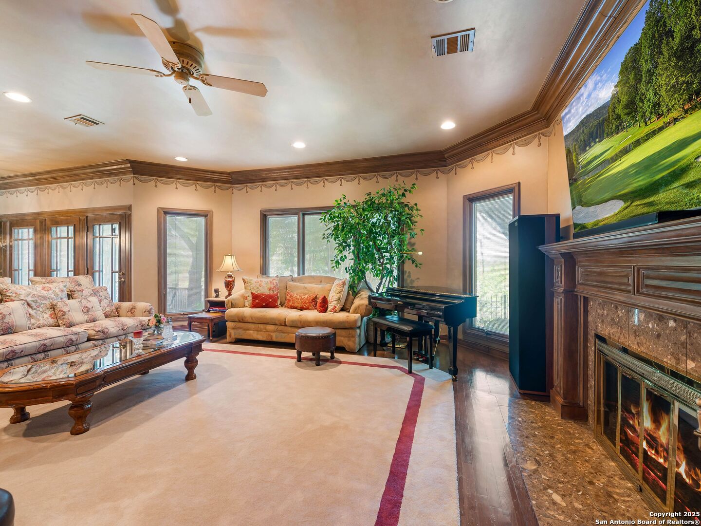 Located in The Dominion Gardens, this residence rests on a premium double lot backing to a greenbelt for exceptional privacy. Interior features include hardwood floors, custom crown moulding, and expansive windows framing treetop views. The chef's kitchen is outfitted with gas cooking, dual ovens, a 6-burner range with vent hood, and an ice maker. Designed for entertaining, the centrally located dining area flows seamlessly into the family room and wet bar. The primary suite offers outdoor access through dual French doors, a fireplace, two oversized custom closets, and a spacious bath with dual vanities, a wet bar, and private water closet with bidet. Secondary bedrooms feature en suite baths and custom built-ins. Enjoy serene greenbelt views from the generous composite deck, perfect for outdoor living and entertaining. Oversized two-car garage with separate golf cart bay currently utilized as a utility room but easily converted back. Located in one of San Antonio's most prestigious communities, this property is convenient to Dominion Country Club's amenities, shopping, restaurants, major employers, and Medical Center.