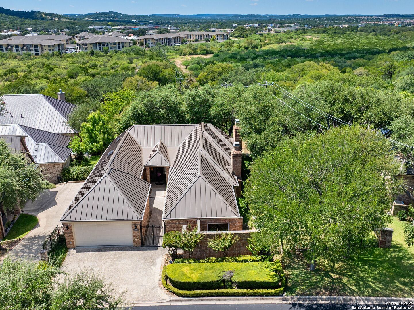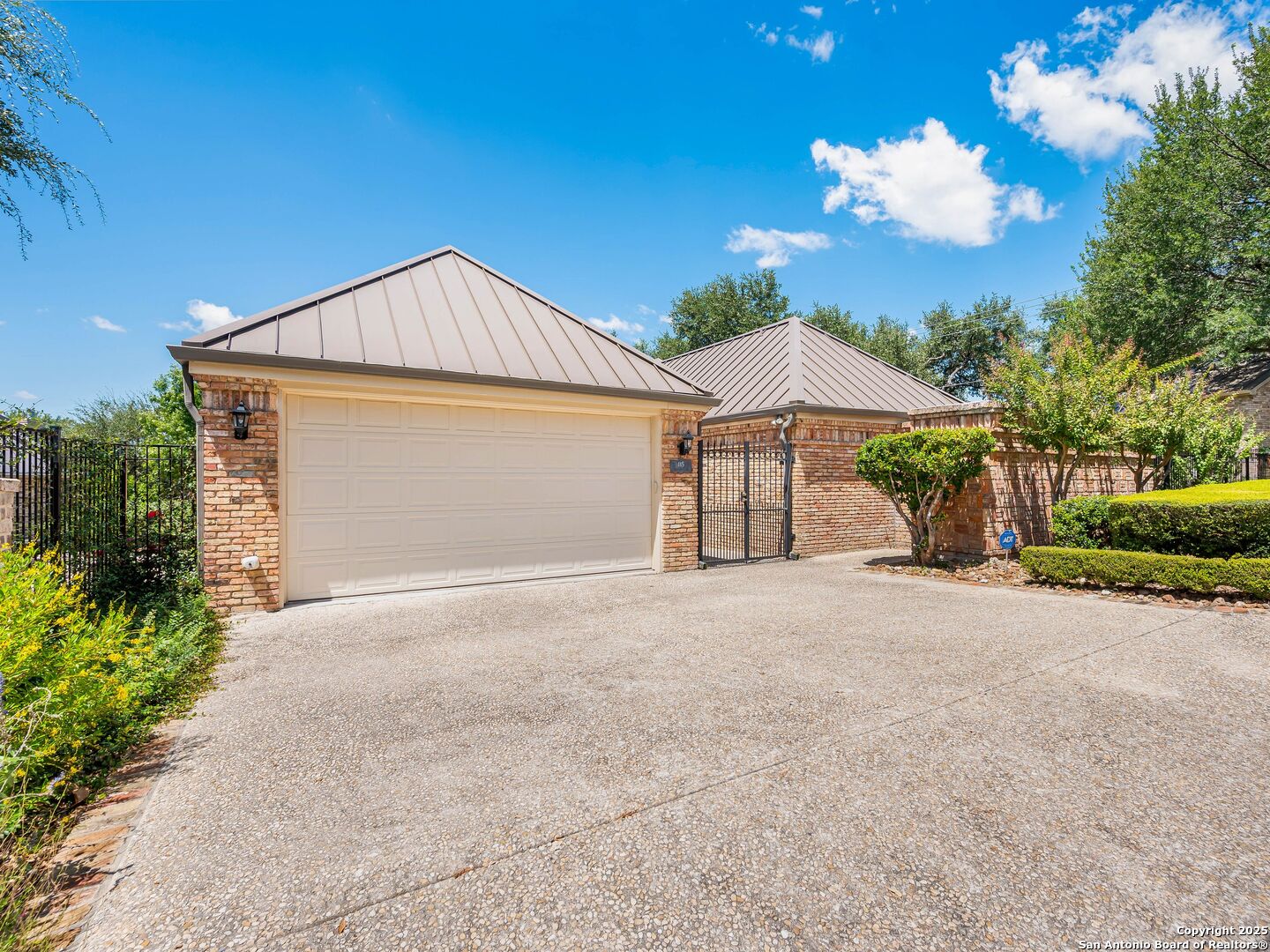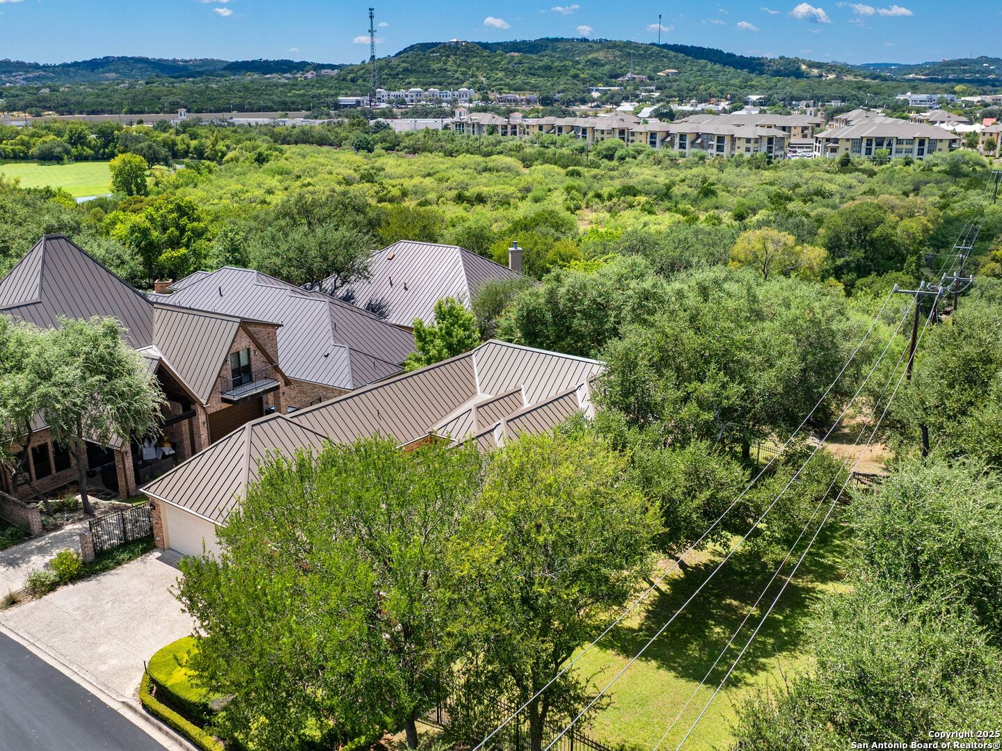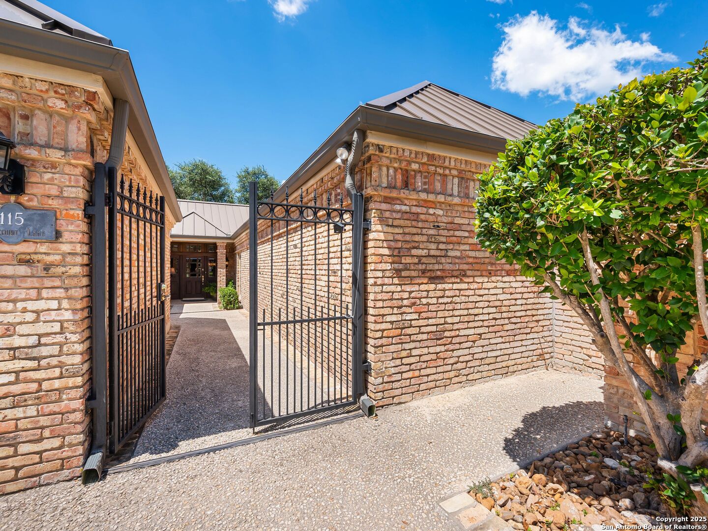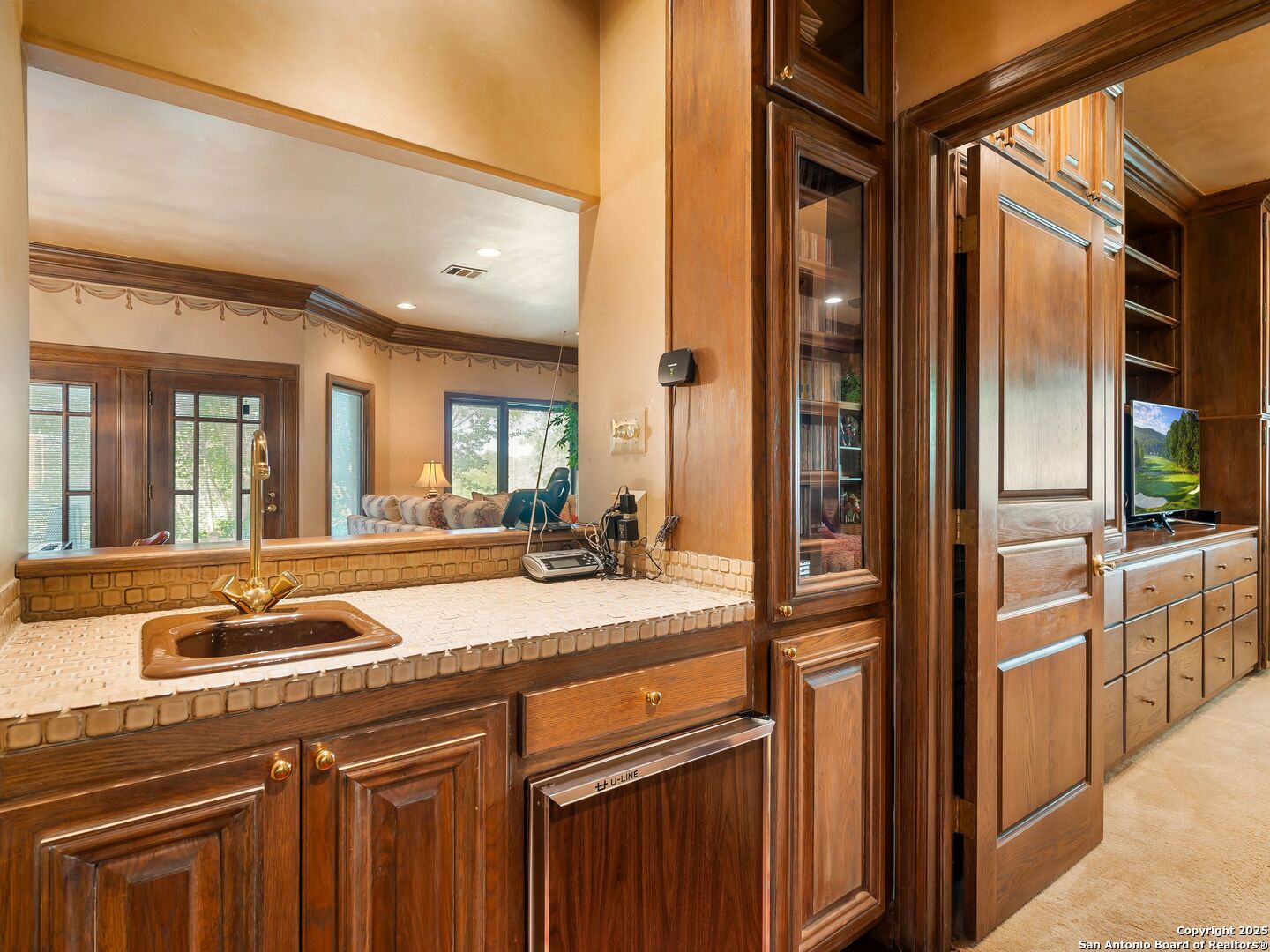 Located in The Dominion Gardens, this residence rests on a premium double lot backing to a greenbelt for exceptional privacy. Interior features include hardwood floors, custom crown moulding, and expansive windows framing treetop views. The chef's kitchen is outfitted with gas cooking, dual ovens, a 6-burner range with vent hood, and an ice maker. Designed for entertaining, the centrally located dining area flows seamlessly into the family room and wet bar. The primary suite offers outdoor access through dual French doors, a fireplace, two oversized custom closets, and a spacious bath with dual vanities, a wet bar, and private water closet with bidet. Secondary bedrooms feature en suite baths and custom built-ins. Enjoy serene greenbelt views from the generous composite deck, perfect for outdoor living and entertaining. Oversized two-car garage with separate golf cart bay currently utilized as a utility room but easily converted back. Located in one of San Antonio's most prestigious communities, this property is convenient to Dominion Country Club's amenities, shopping, restaurants, major employers, and Medical Center.