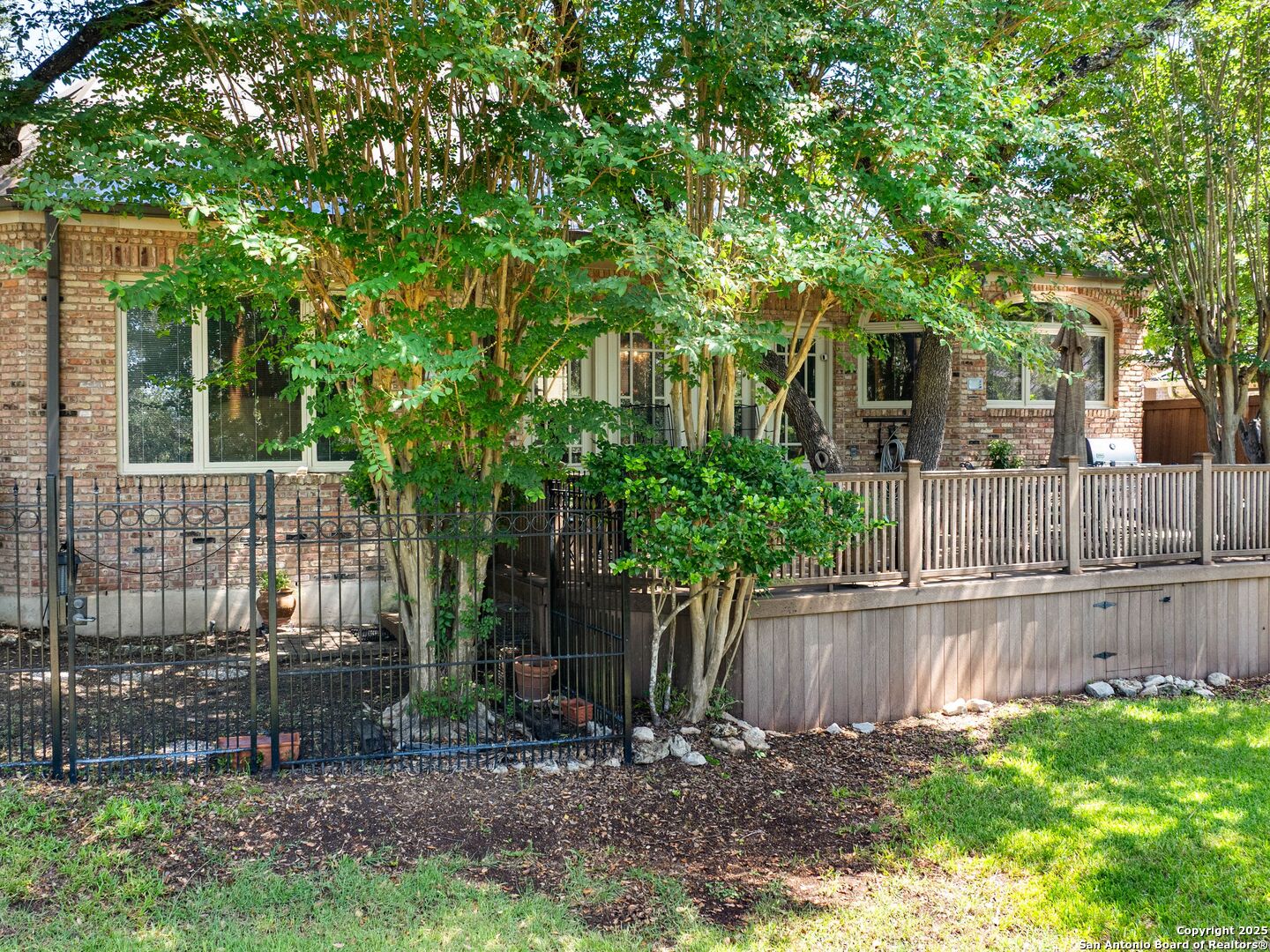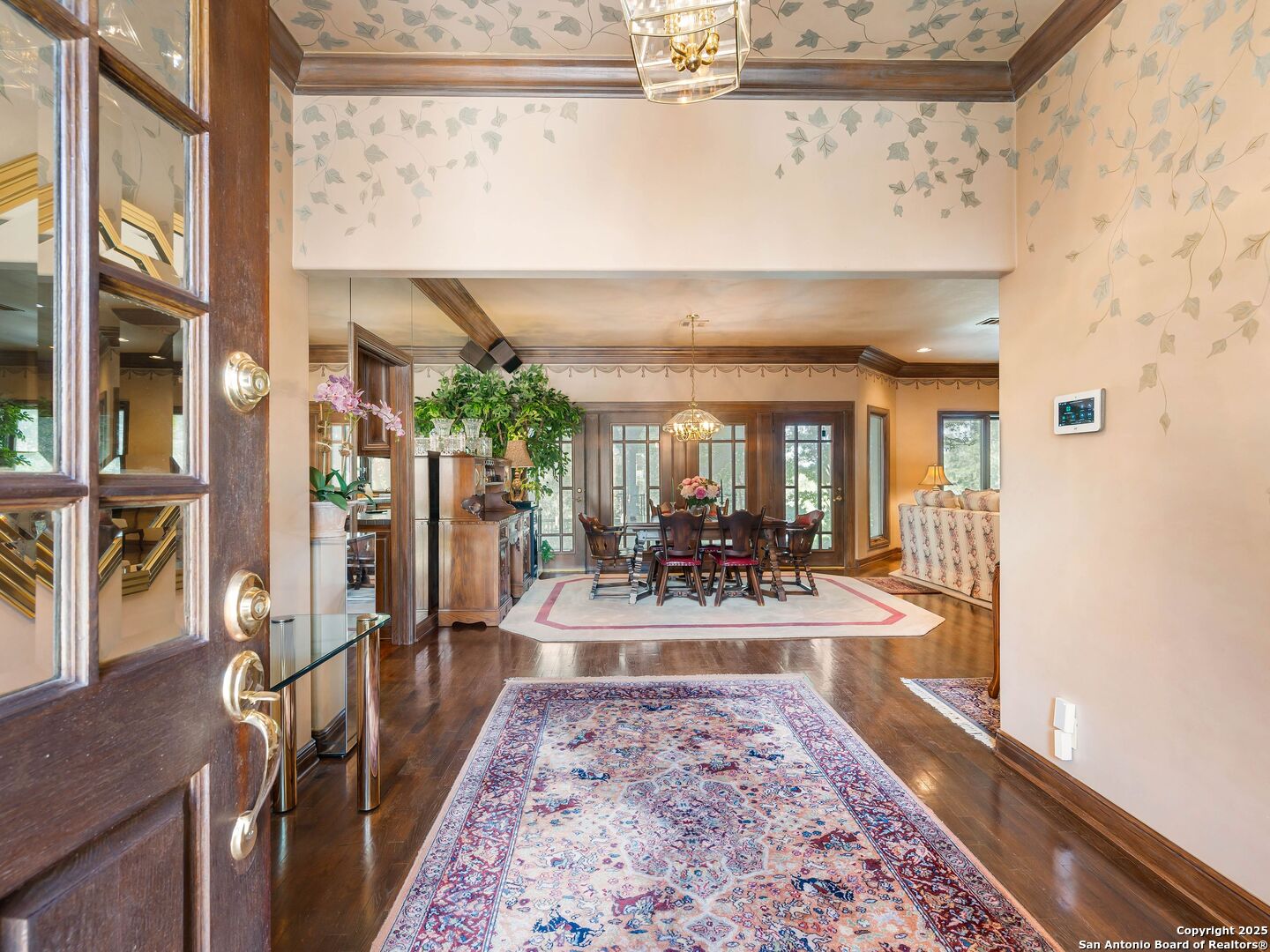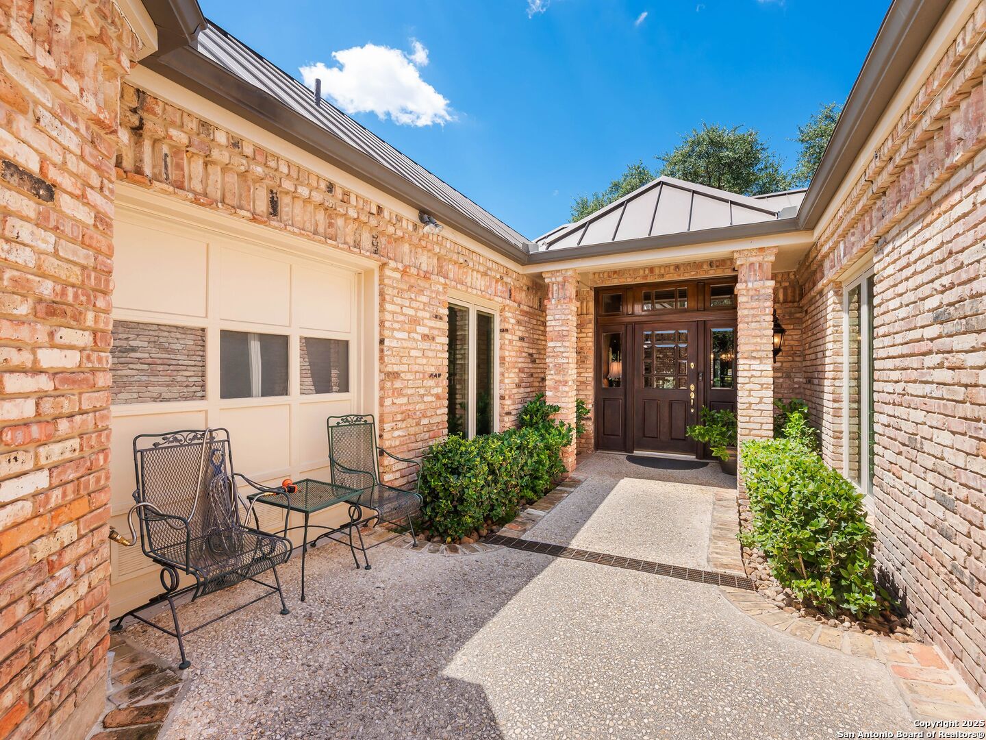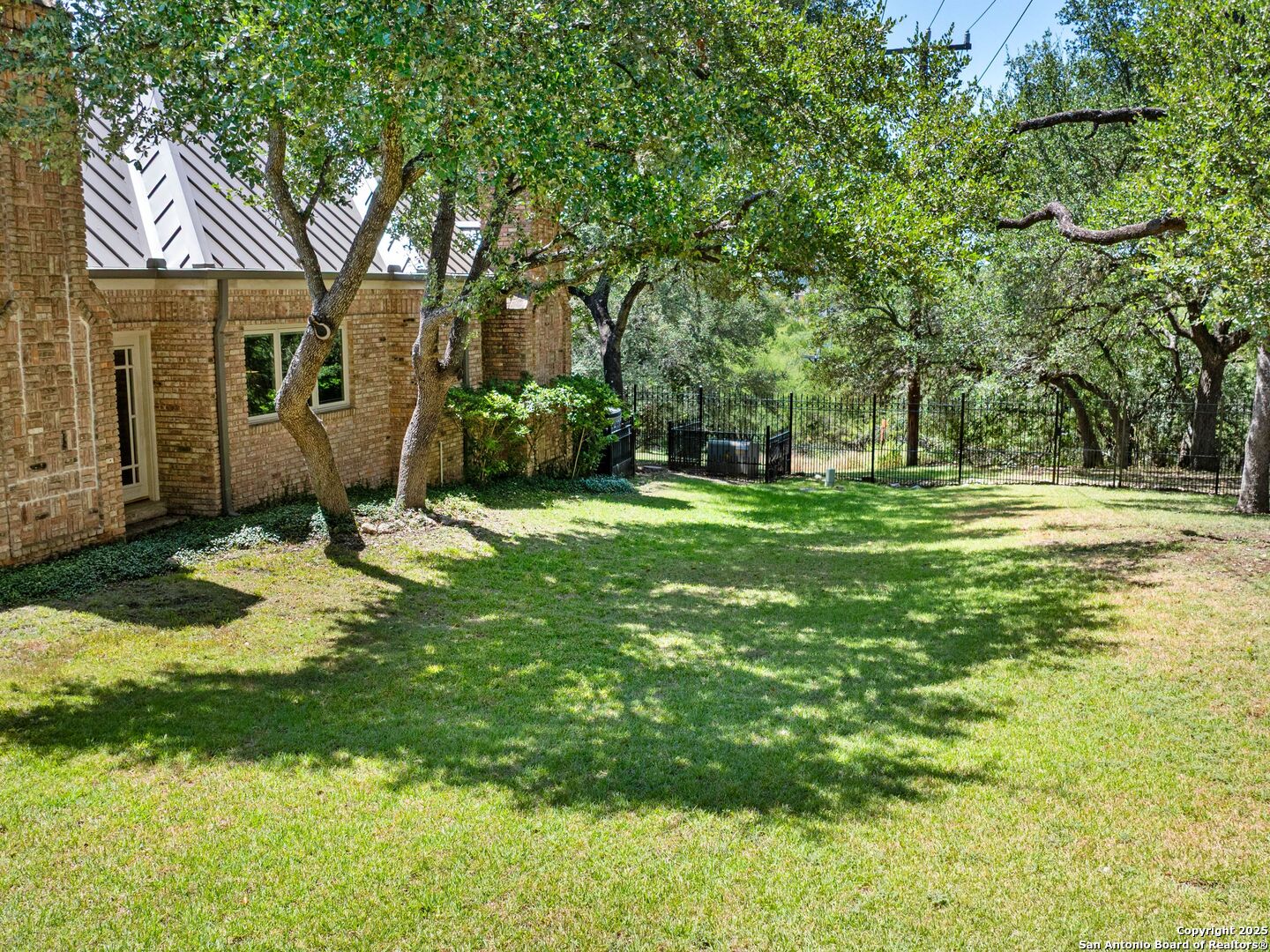 Located in The Dominion Gardens, this residence rests on a premium double lot backing to a greenbelt for exceptional privacy. Interior features include hardwood floors, custom crown moulding, and expansive windows framing treetop views. The chef's kitchen is outfitted with gas cooking, dual ovens, a 6-burner range with vent hood, and an ice maker. Designed for entertaining, the centrally located dining area flows seamlessly into the family room and wet bar. The primary suite offers outdoor access through dual French doors, a fireplace, two oversized custom closets, and a spacious bath with dual vanities, a wet bar, and private water closet with bidet. Secondary bedrooms feature en suite baths and custom built-ins. Enjoy serene greenbelt views from the generous composite deck, perfect for outdoor living and entertaining. Oversized two-car garage with separate golf cart bay currently utilized as a utility room but easily converted back. Located in one of San Antonio's most prestigious communities, this property is convenient to Dominion Country Club's amenities, shopping, restaurants, major employers, and Medical Center.