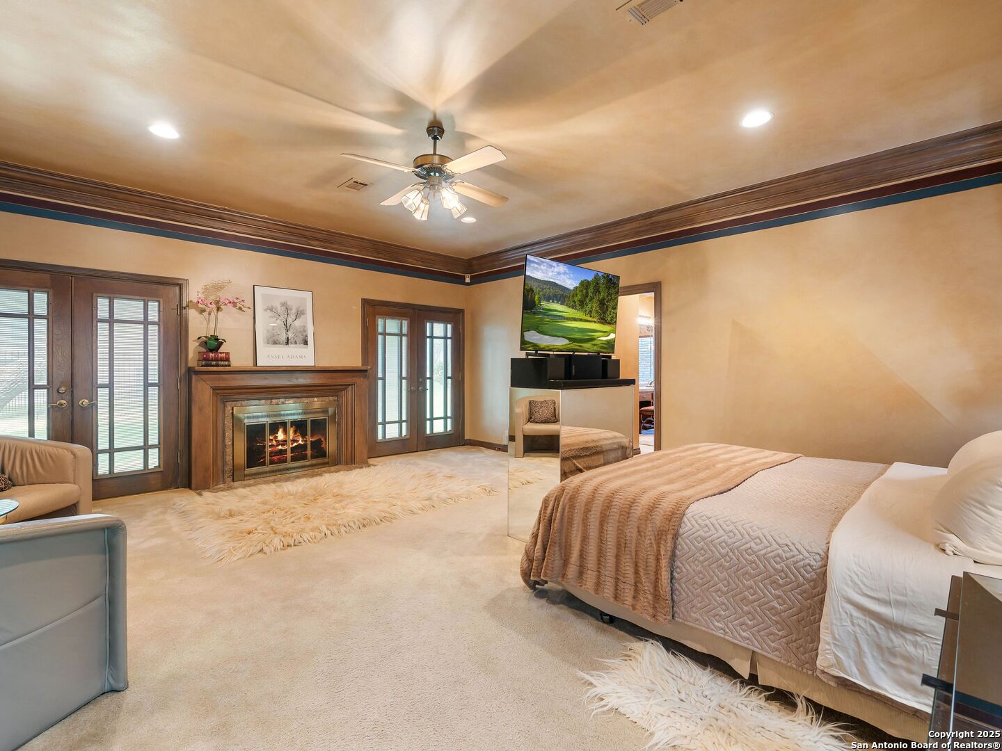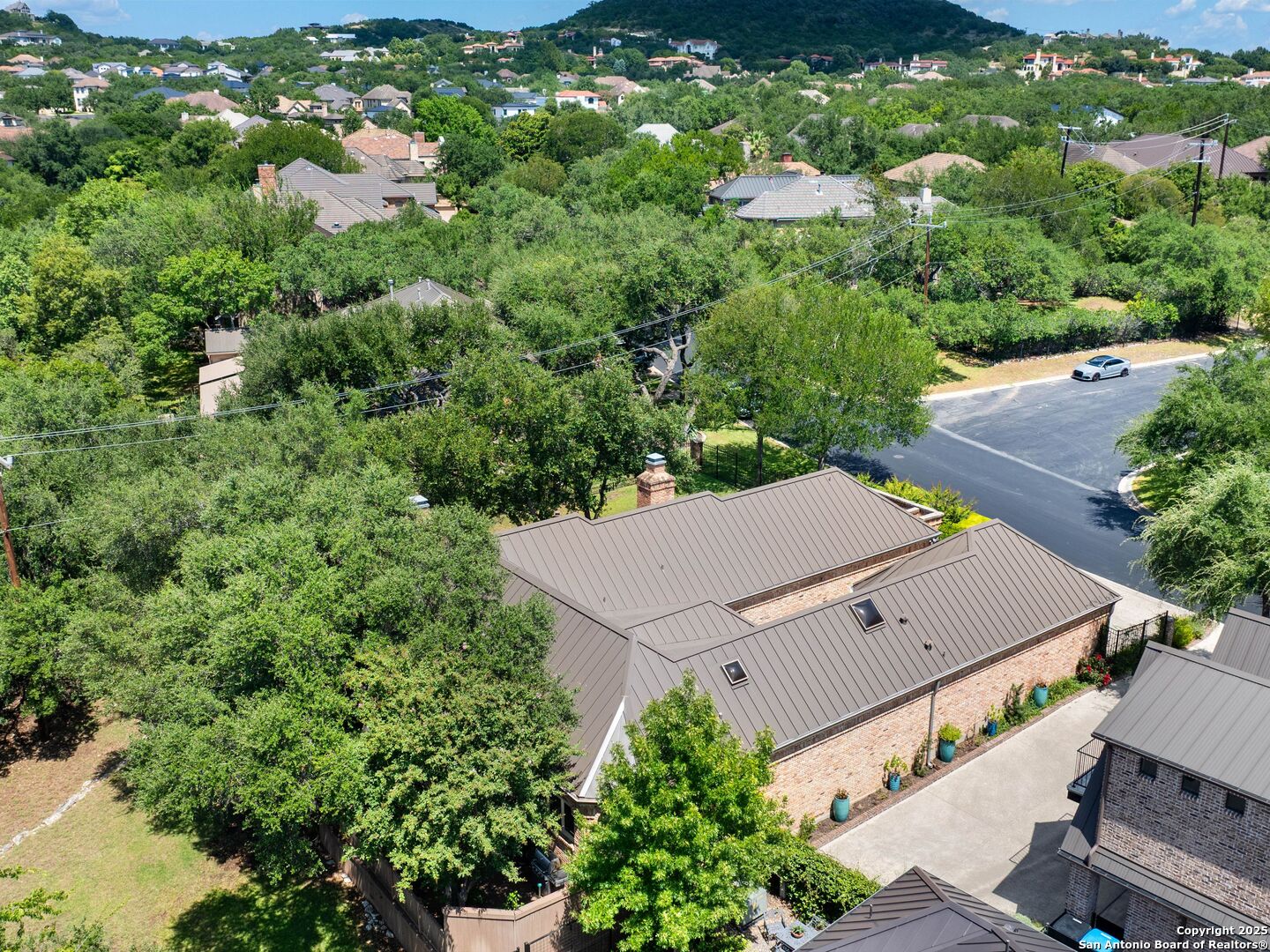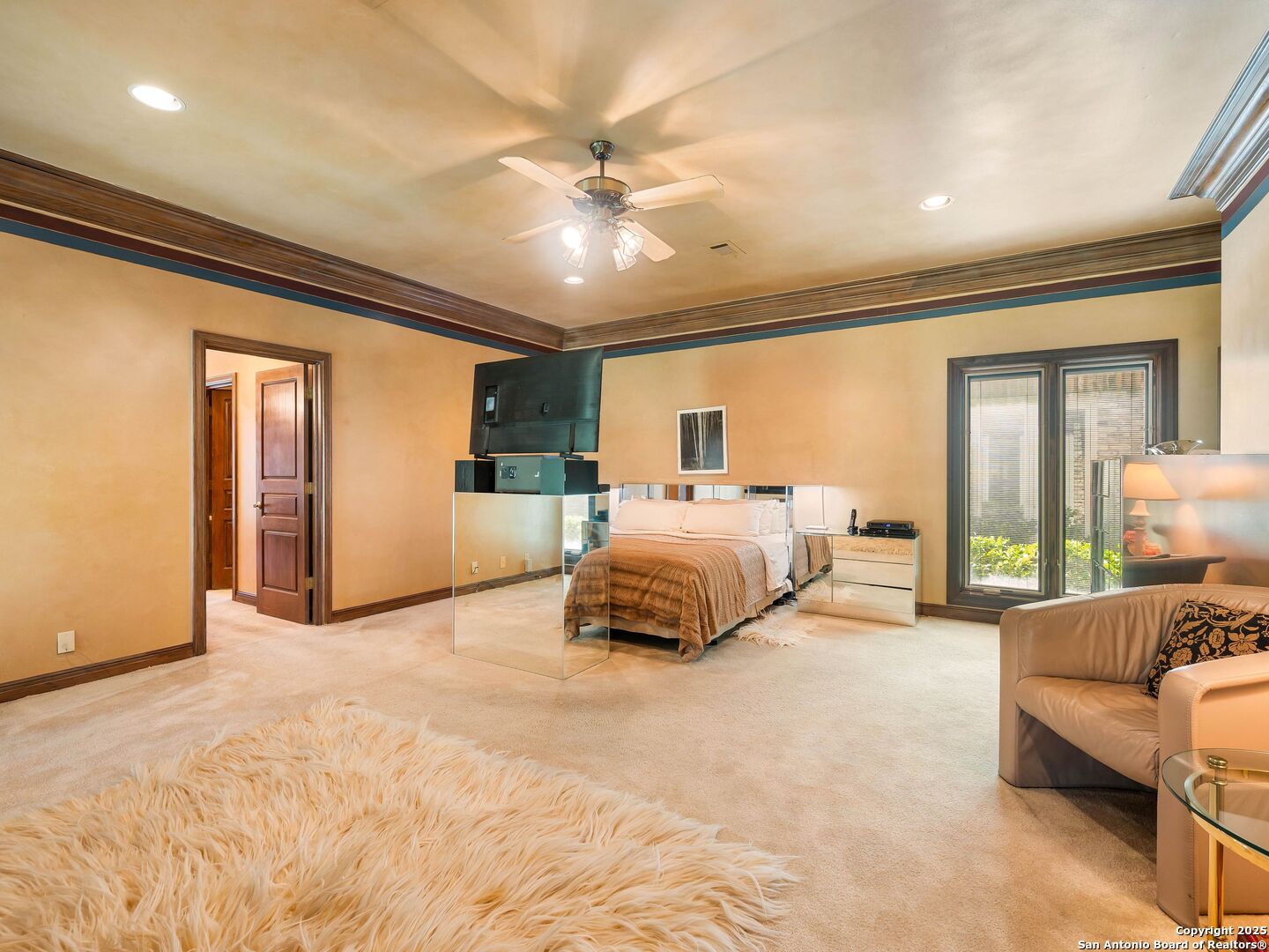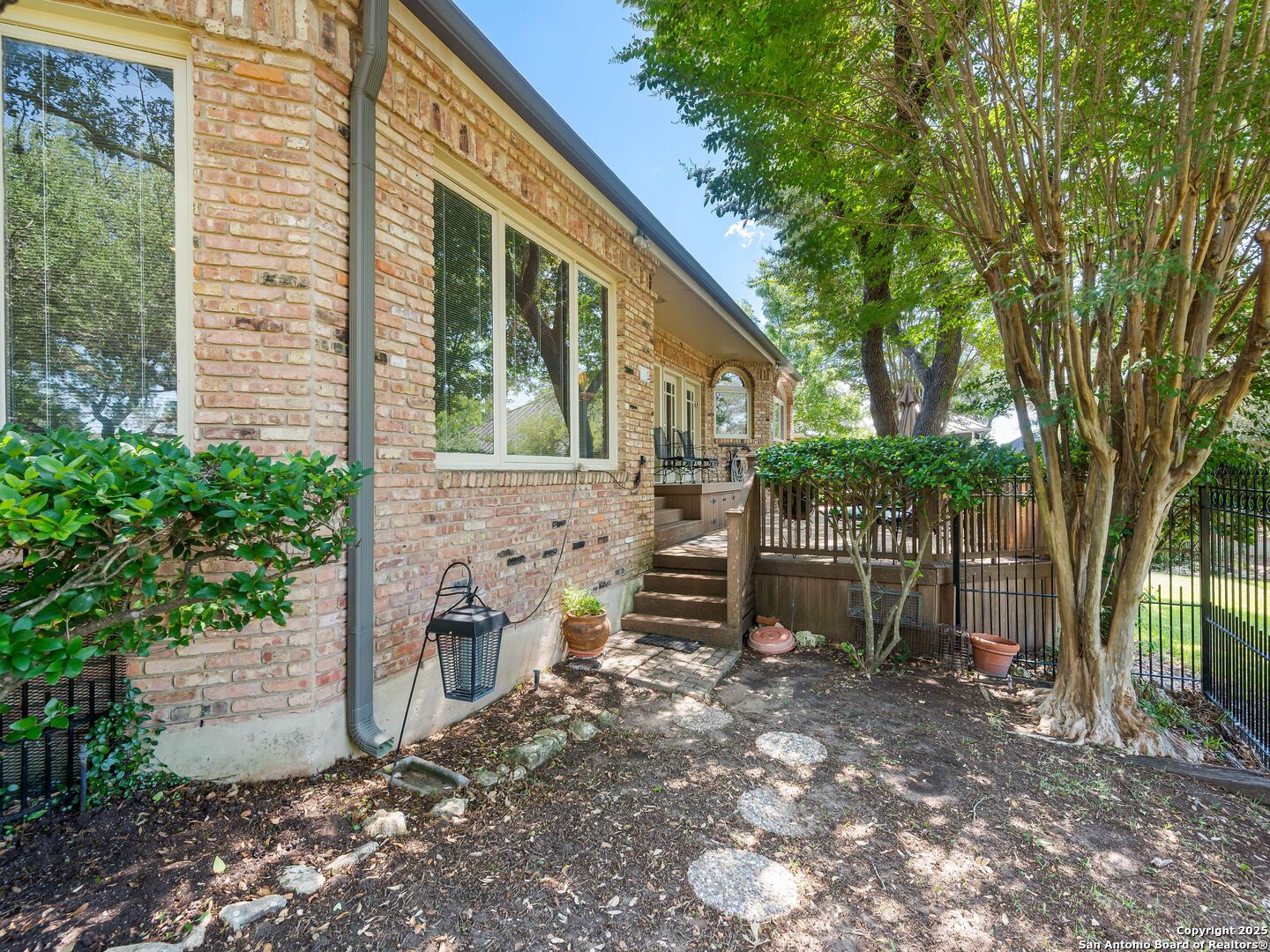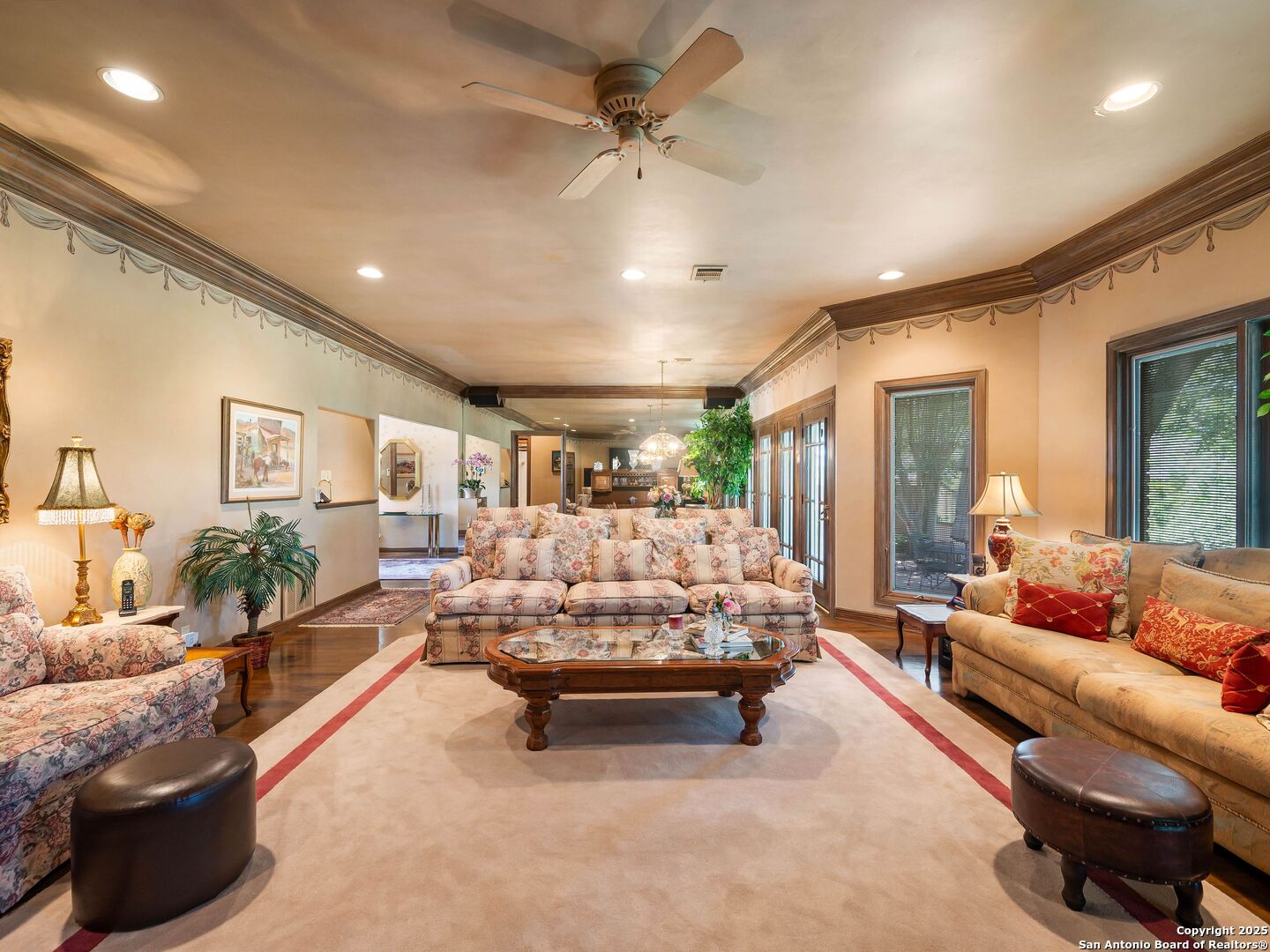 Located in The Dominion Gardens, this residence rests on a premium double lot backing to a greenbelt for exceptional privacy. Interior features include hardwood floors, custom crown moulding, and expansive windows framing treetop views. The chef's kitchen is outfitted with gas cooking, dual ovens, a 6-burner range with vent hood, and an ice maker. Designed for entertaining, the centrally located dining area flows seamlessly into the family room and wet bar. The primary suite offers outdoor access through dual French doors, a fireplace, two oversized custom closets, and a spacious bath with dual vanities, a wet bar, and private water closet with bidet. Secondary bedrooms feature en suite baths and custom built-ins. Enjoy serene greenbelt views from the generous composite deck, perfect for outdoor living and entertaining. Oversized two-car garage with separate golf cart bay currently utilized as a utility room but easily converted back. Located in one of San Antonio's most prestigious communities, this property is convenient to Dominion Country Club's amenities, shopping, restaurants, major employers, and Medical Center.