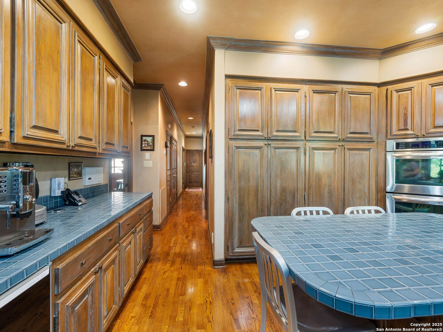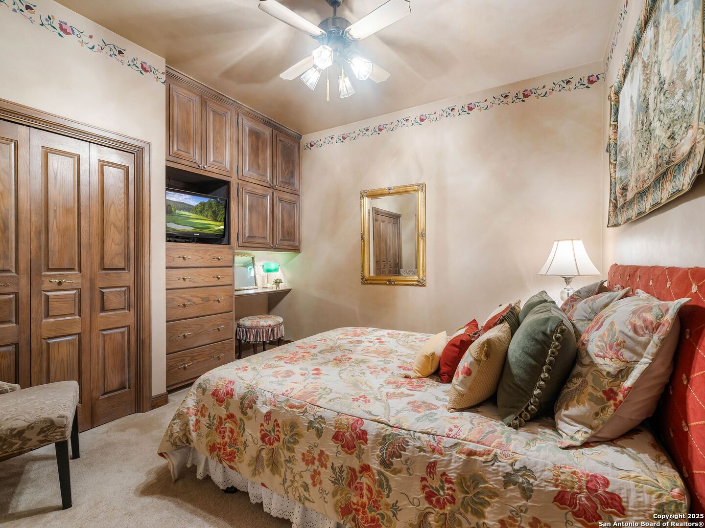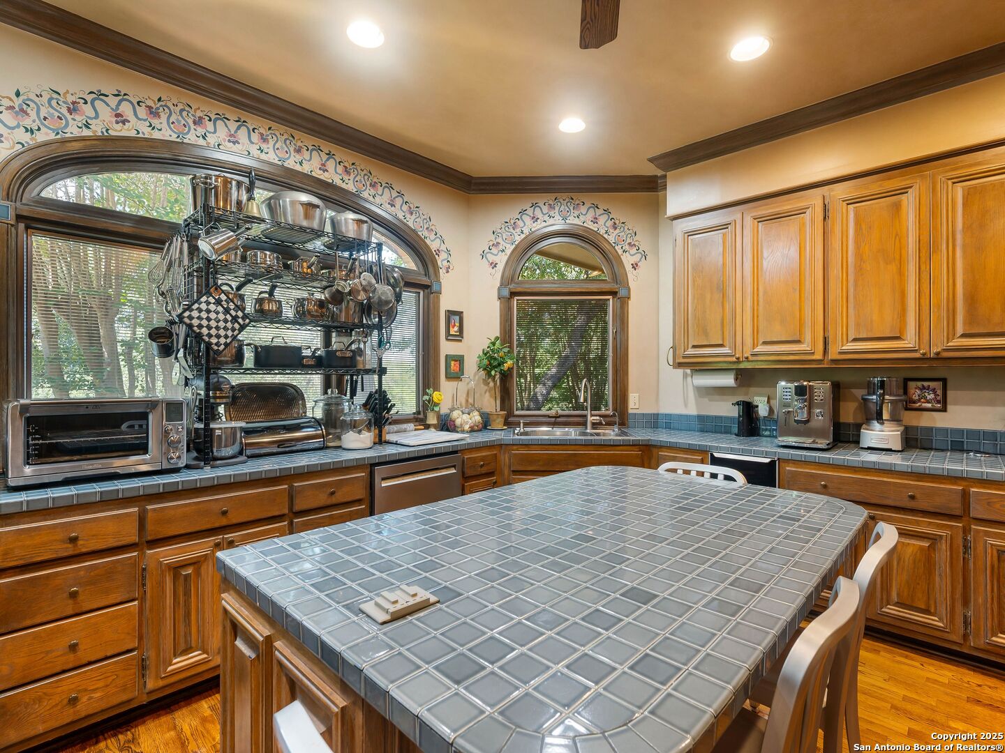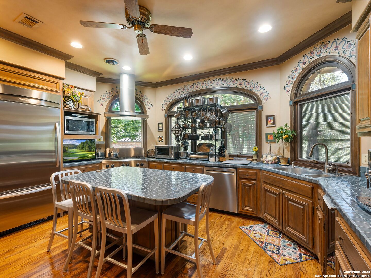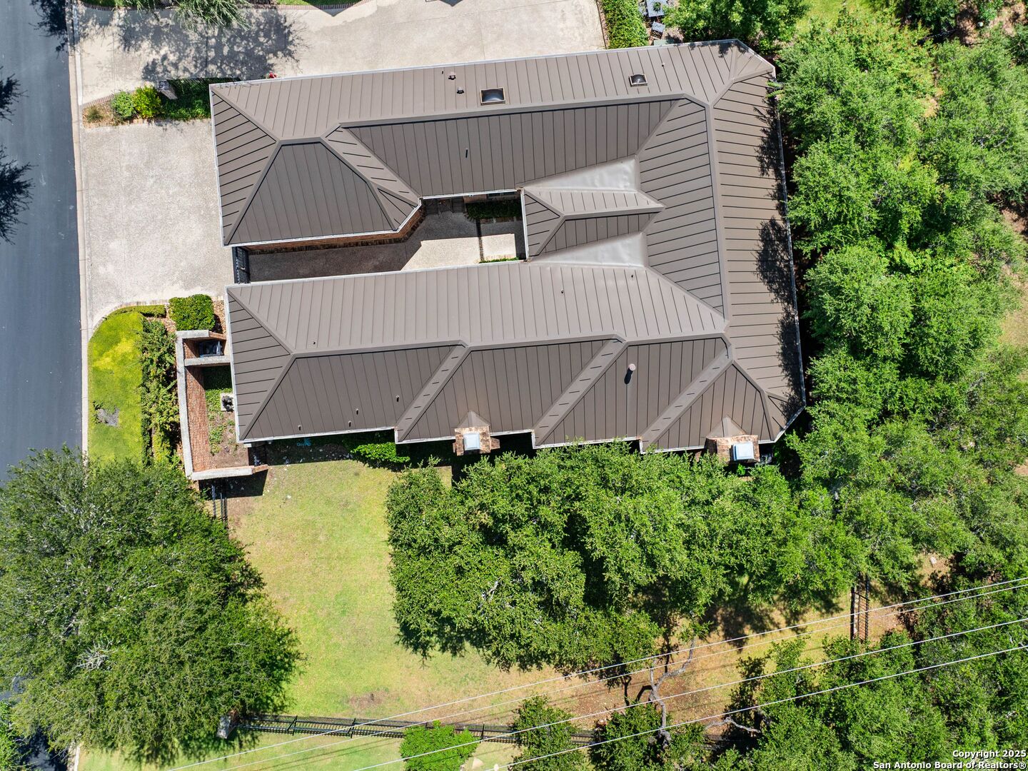 Located in The Dominion Gardens, this residence rests on a premium double lot backing to a greenbelt for exceptional privacy. Interior features include hardwood floors, custom crown moulding, and expansive windows framing treetop views. The chef's kitchen is outfitted with gas cooking, dual ovens, a 6-burner range with vent hood, and an ice maker. Designed for entertaining, the centrally located dining area flows seamlessly into the family room and wet bar. The primary suite offers outdoor access through dual French doors, a fireplace, two oversized custom closets, and a spacious bath with dual vanities, a wet bar, and private water closet with bidet. Secondary bedrooms feature en suite baths and custom built-ins. Enjoy serene greenbelt views from the generous composite deck, perfect for outdoor living and entertaining. Oversized two-car garage with separate golf cart bay currently utilized as a utility room but easily converted back. Located in one of San Antonio's most prestigious communities, this property is convenient to Dominion Country Club's amenities, shopping, restaurants, major employers, and Medical Center.