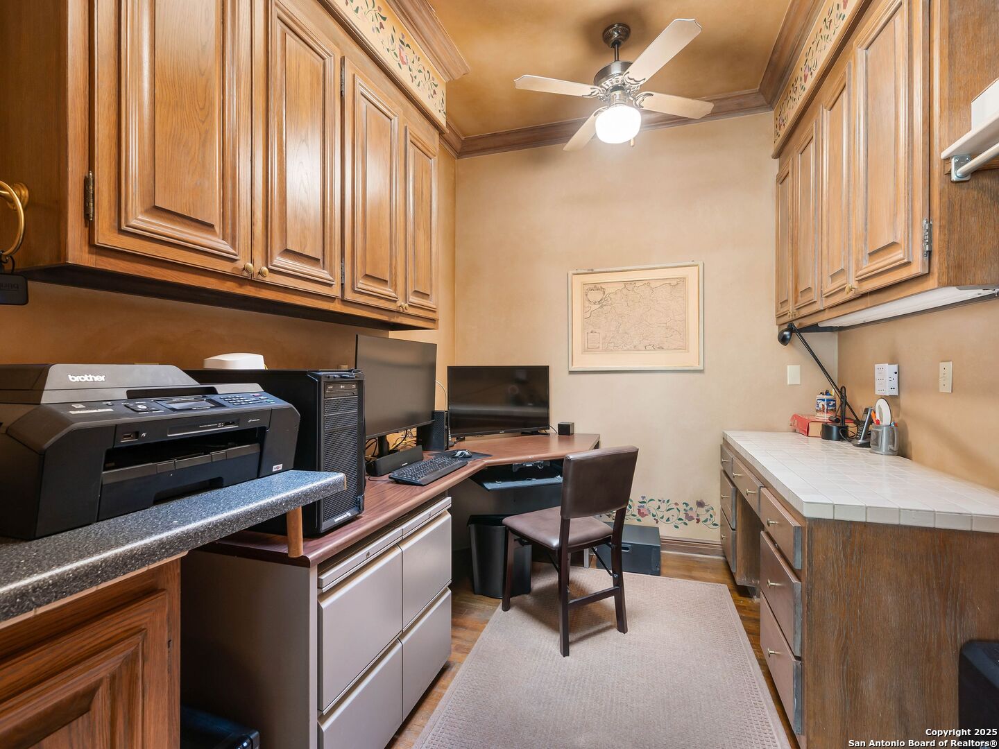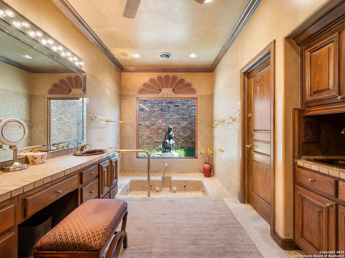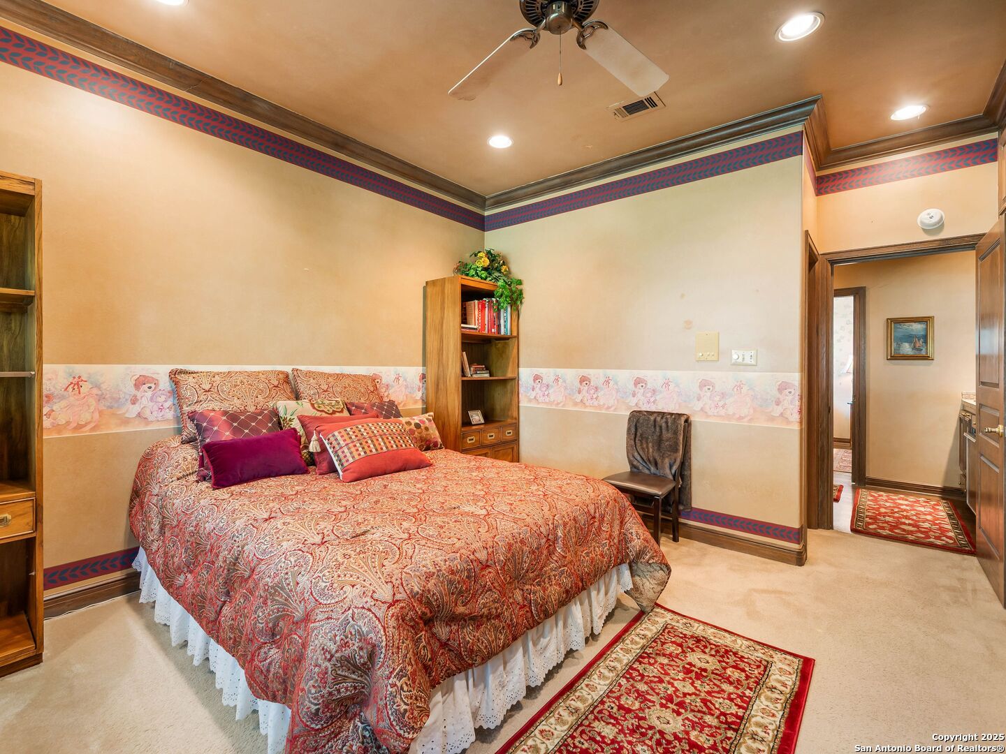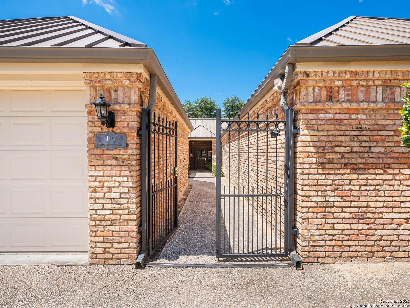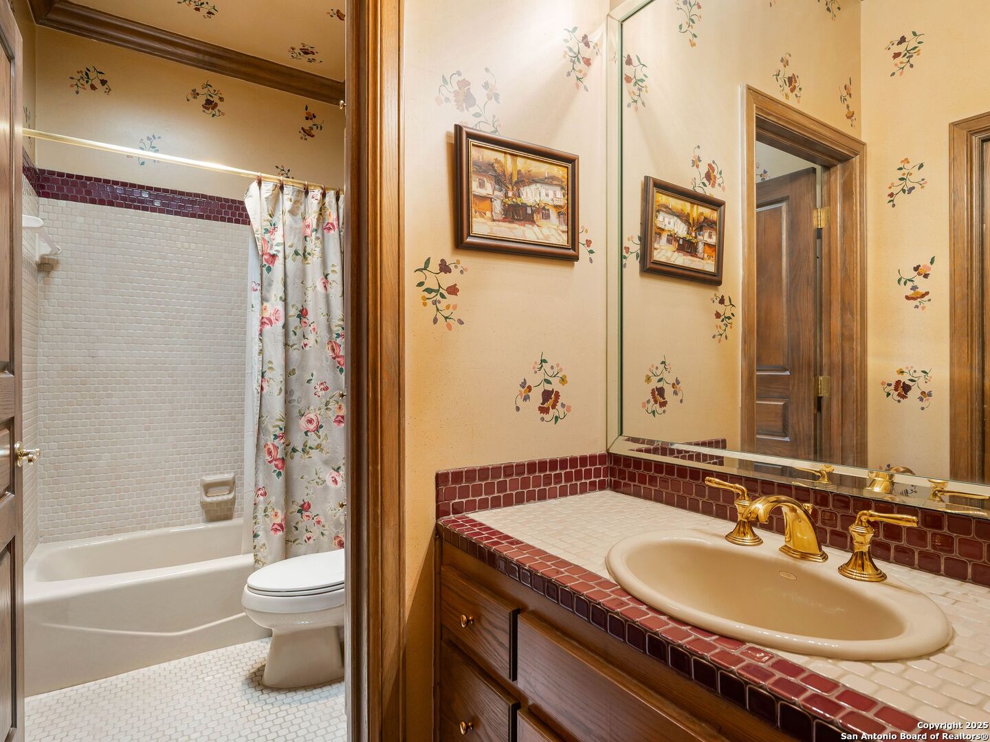 Located in The Dominion Gardens, this residence rests on a premium double lot backing to a greenbelt for exceptional privacy. Interior features include hardwood floors, custom crown moulding, and expansive windows framing treetop views. The chef's kitchen is outfitted with gas cooking, dual ovens, a 6-burner range with vent hood, and an ice maker. Designed for entertaining, the centrally located dining area flows seamlessly into the family room and wet bar. The primary suite offers outdoor access through dual French doors, a fireplace, two oversized custom closets, and a spacious bath with dual vanities, a wet bar, and private water closet with bidet. Secondary bedrooms feature en suite baths and custom built-ins. Enjoy serene greenbelt views from the generous composite deck, perfect for outdoor living and entertaining. Oversized two-car garage with separate golf cart bay currently utilized as a utility room but easily converted back. Located in one of San Antonio's most prestigious communities, this property is convenient to Dominion Country Club's amenities, shopping, restaurants, major employers, and Medical Center.