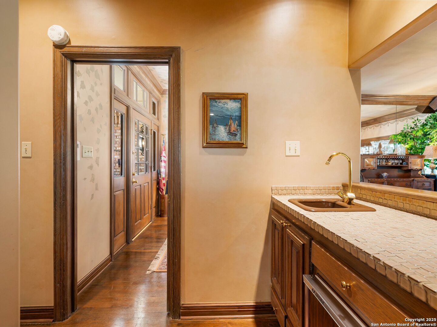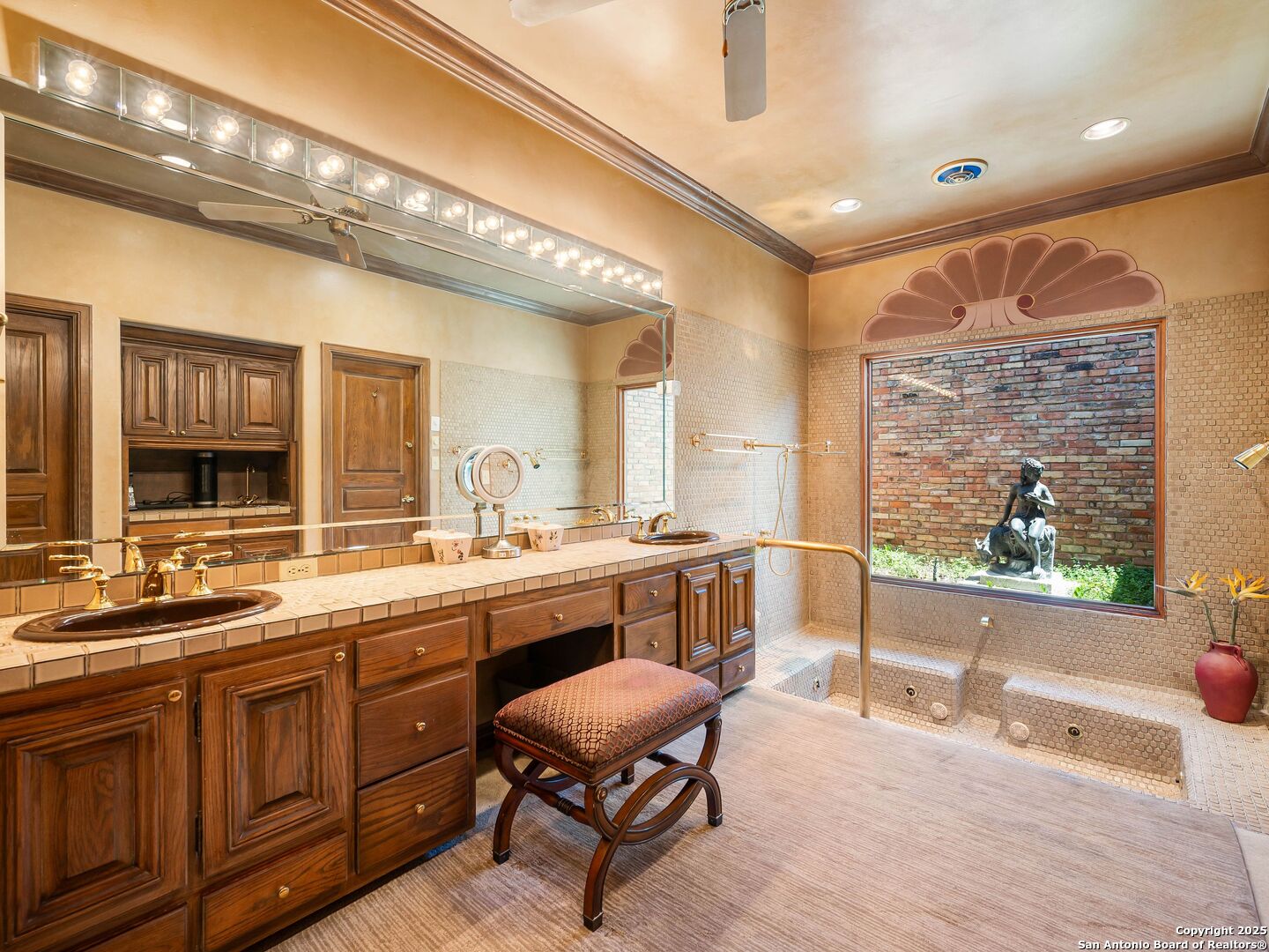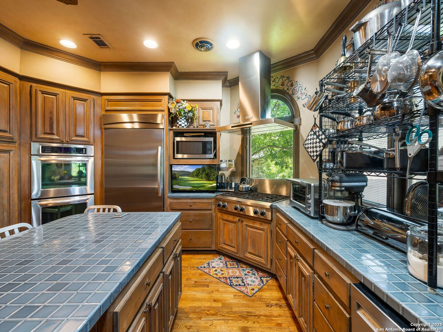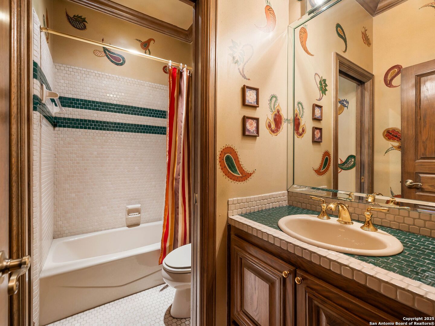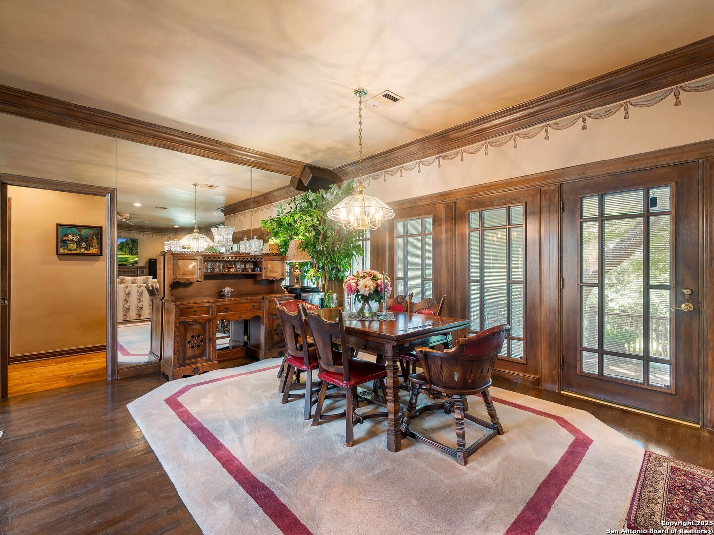 Located in The Dominion Gardens, this residence rests on a premium double lot backing to a greenbelt for exceptional privacy. Interior features include hardwood floors, custom crown moulding, and expansive windows framing treetop views. The chef's kitchen is outfitted with gas cooking, dual ovens, a 6-burner range with vent hood, and an ice maker. Designed for entertaining, the centrally located dining area flows seamlessly into the family room and wet bar. The primary suite offers outdoor access through dual French doors, a fireplace, two oversized custom closets, and a spacious bath with dual vanities, a wet bar, and private water closet with bidet. Secondary bedrooms feature en suite baths and custom built-ins. Enjoy serene greenbelt views from the generous composite deck, perfect for outdoor living and entertaining. Oversized two-car garage with separate golf cart bay currently utilized as a utility room but easily converted back. Located in one of San Antonio's most prestigious communities, this property is convenient to Dominion Country Club's amenities, shopping, restaurants, major employers, and Medical Center.