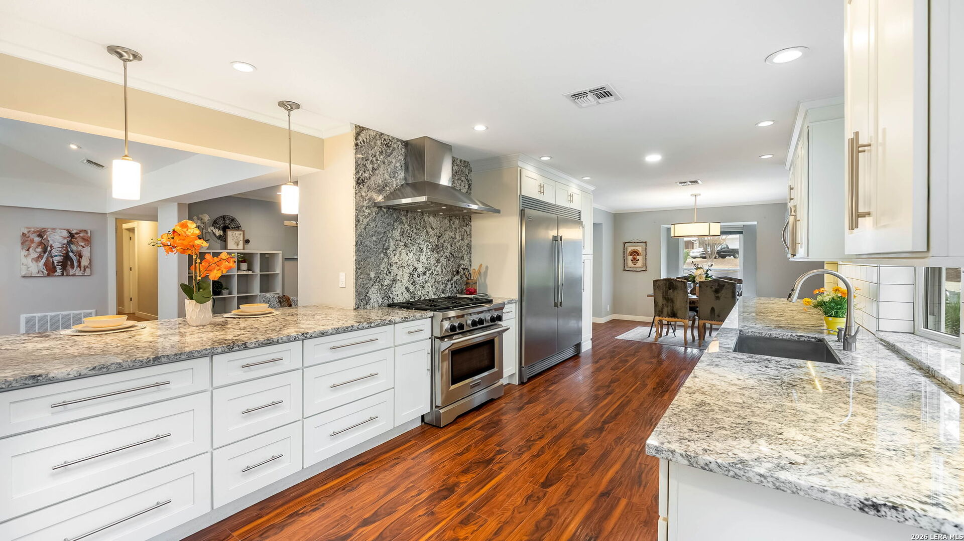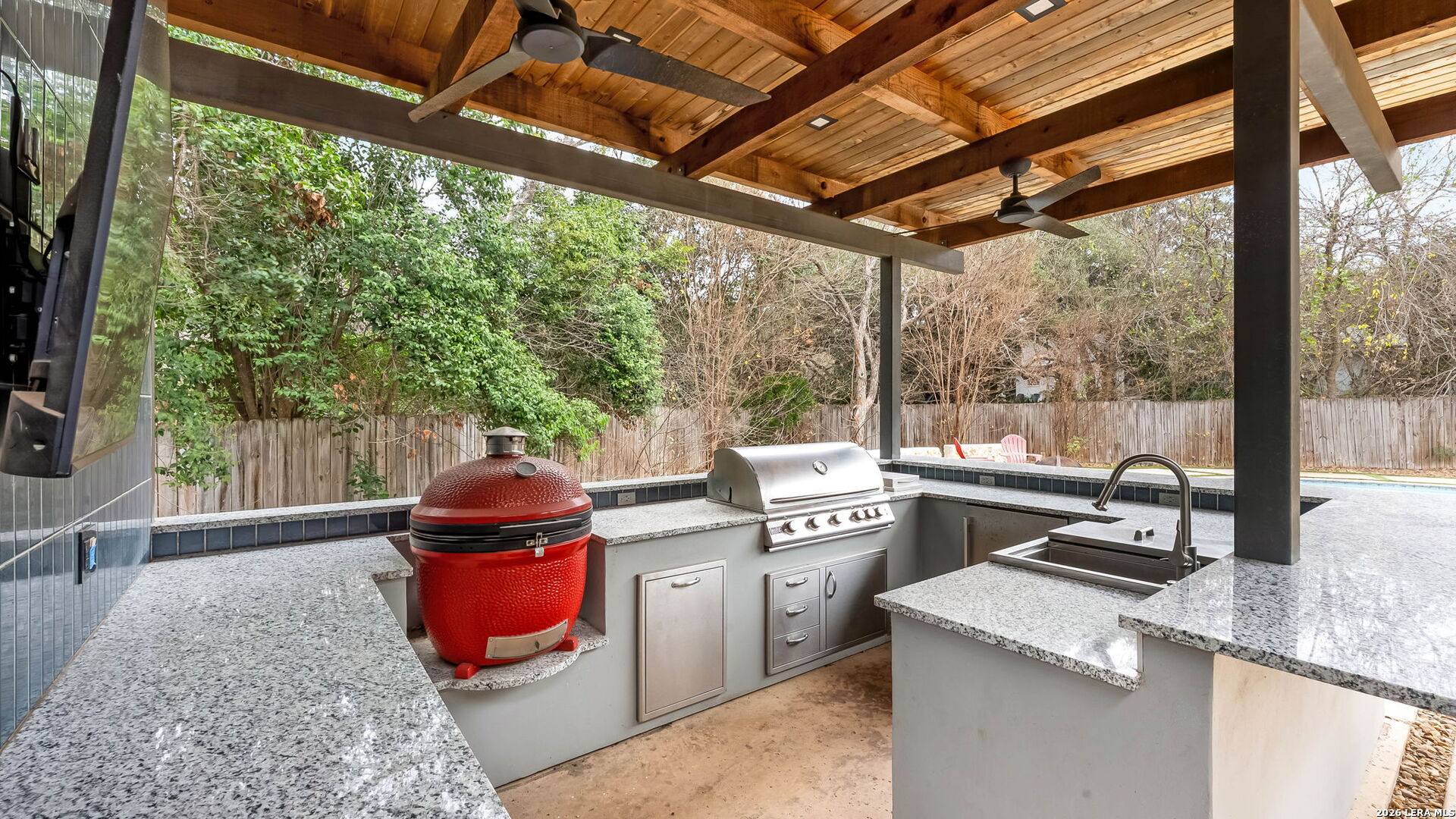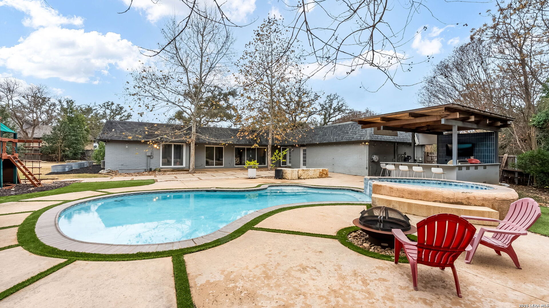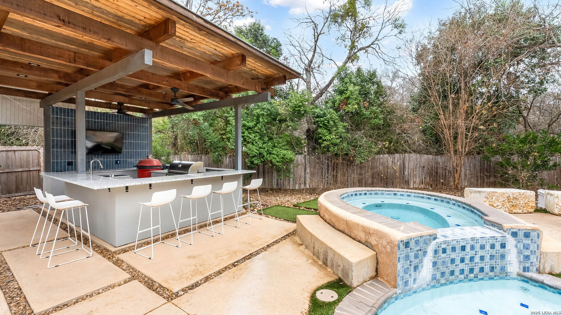 Tucked away on the largest lot in Whispering Oaks and backing directly to a serene greenbelt, 11510 Whisper Circle offers exceptional privacy, thoughtful upgrades and refined indoor outdoor living. This 2,756 square foot residence features four bedrooms and three fully renovated bathrooms with added soundproofing around every bedroom for enhanced comfort and tranquility. At the heart of the home is a true chef's kitchen equipped with a gas range, Sub-Zero refrigerator/freezer and custom counters that extend six inches deeper than standard providing generous prep space and storage. The entire home has been replumbed with PEX and all windows have been replaced, offering peace of mind and modern efficiency. Step outside to a private backyard retreat featuring a pool and spa, plus a well-appointed cabana complete with built-in grill and ceramic smoker grill, ideal for entertaining or quiet evenings at home. The home's unique positioning next to the greenbelt creates a secluded, natural setting while remaining part of one of San Antonio's most well established neighborhoods, Whispering Oaks. Meticulously maintained, landscaped and extensively updated, this property combines luxury, privacy and smart design.