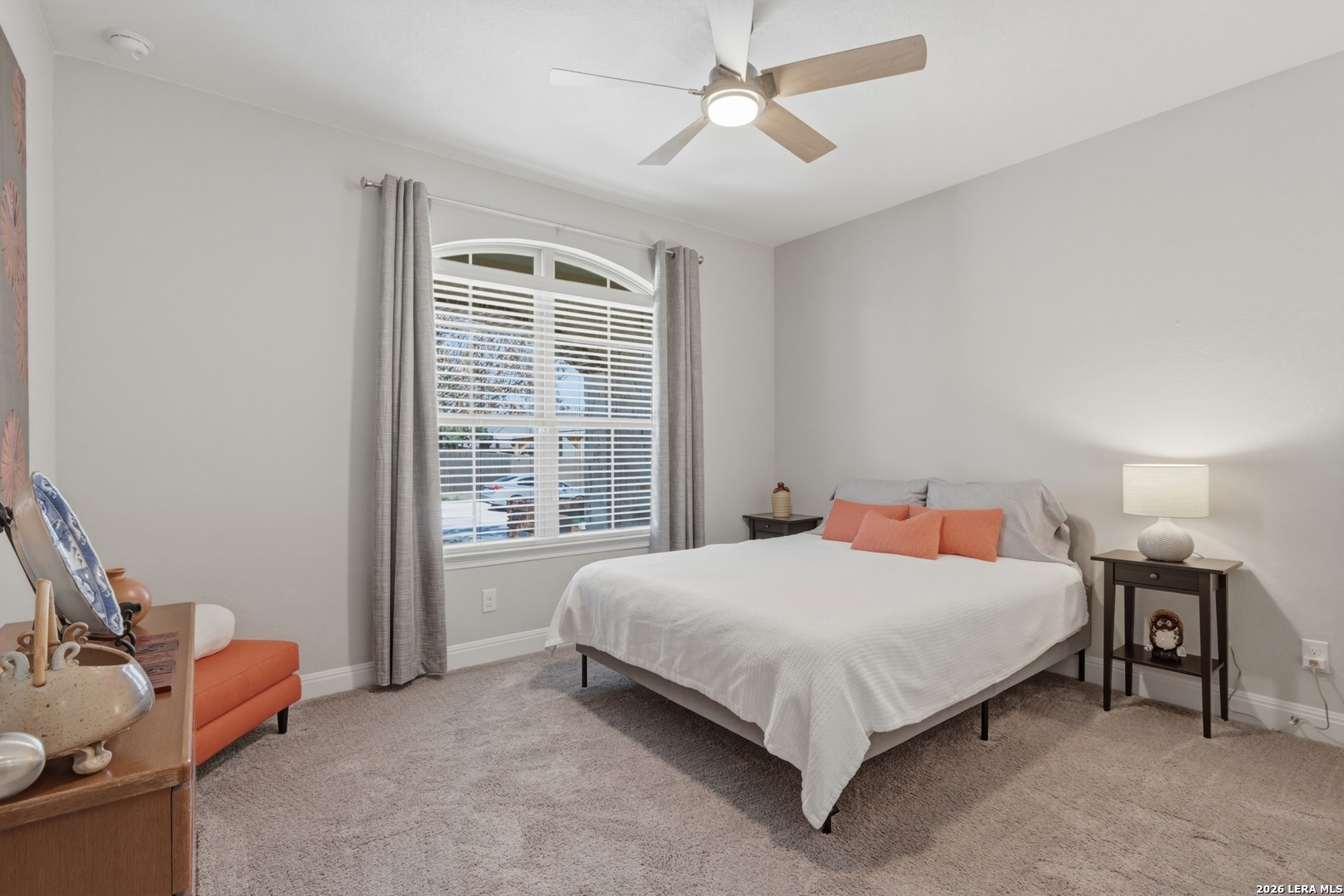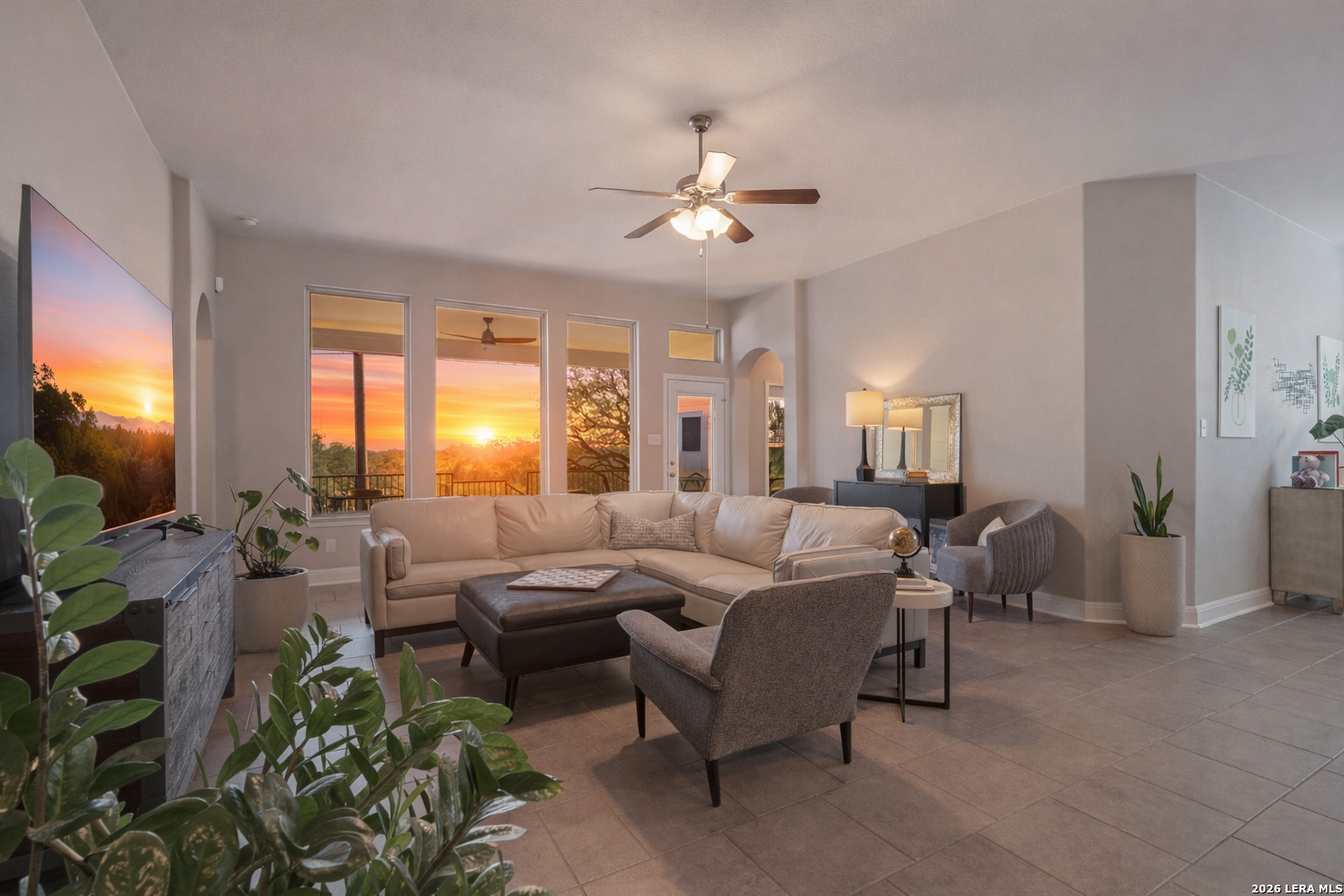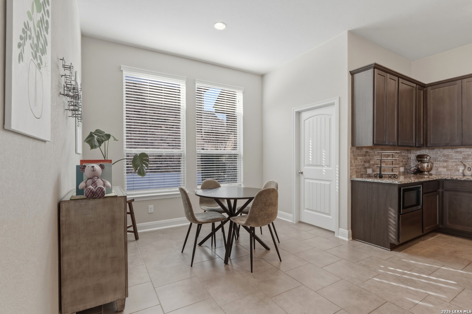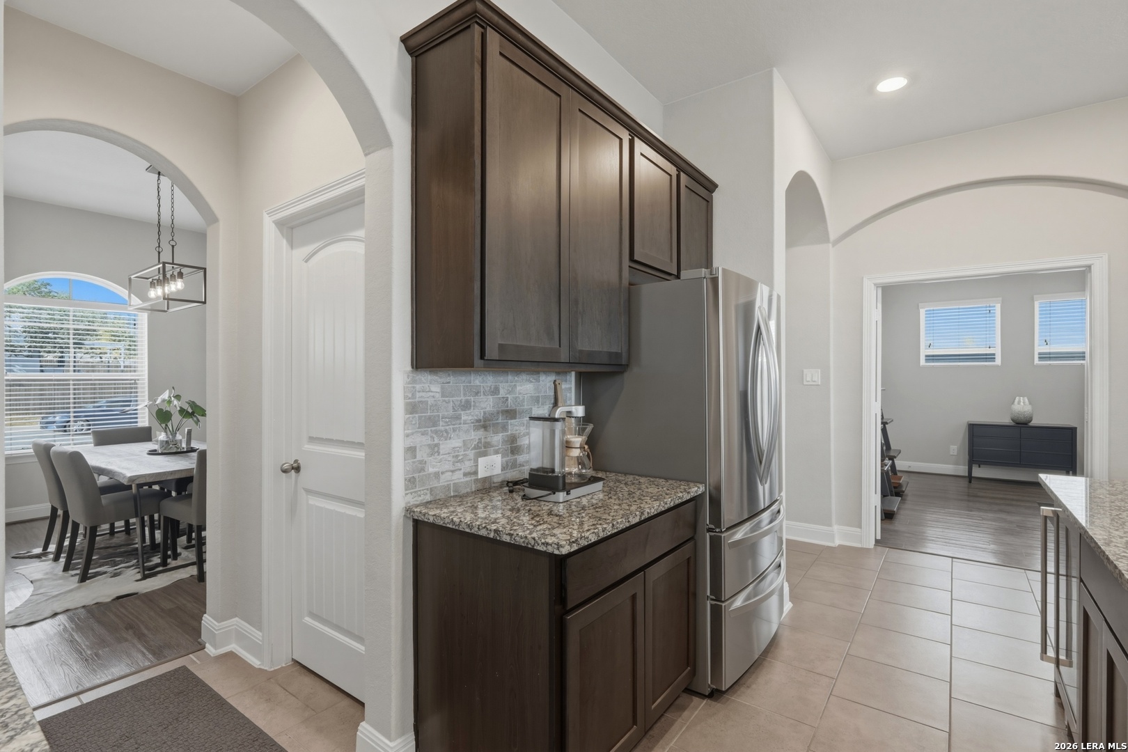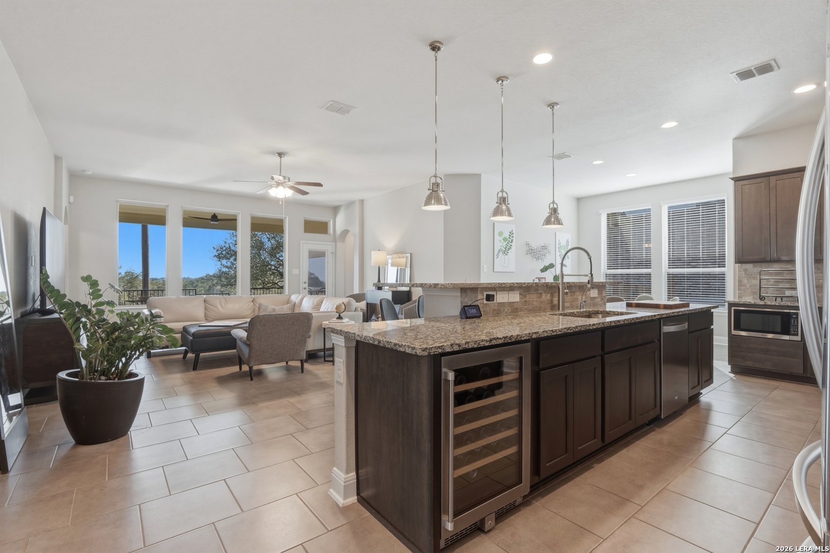 Elegant single-story home in a well-established community, offering 4 bedrooms and 3 full bathrooms. The spacious primary bathroom features a large soaking tub, creating a private retreat to unwind and release the stress of everyday life. The open-concept layout is designed for comfort and effortless entertaining. Abundant natural light fills the living areas, while no rear neighbors provide rare privacy along with peaceful sunrise and sunset views. The updated kitchen is the heart of the home, featuring gas cooking, upgraded appliances, and a wine/beverage center, fully equipped for both entertaining and daily living. Generous space allows for gatherings of all sizes. A formal dining area and a flexible office or secondary living space add versatility for today's lifestyle. A covered patio offers the perfect setting to enjoy morning coffee at sunrise or unwind in the evening with your favorite beverage at sunset. Notable upgrades include two water heaters, a water softener, a separate laundry room, security system, built-in garage storage, and a full sprinkler system. The single-story design offers seamless flow and easy living throughout. Ideally located near major highways, shopping, dining, grocery stores, and a wide variety of entertainment options, this home blends tranquility with everyday convenience. A REFINED RESIDENCE OFFERING PRIVACY, FUNCTIONALITY, AND TIMELESS APPEAL.