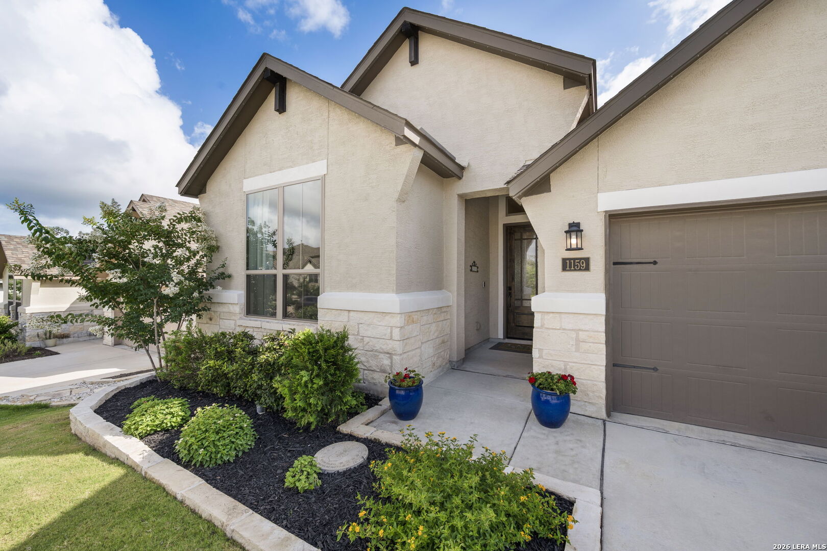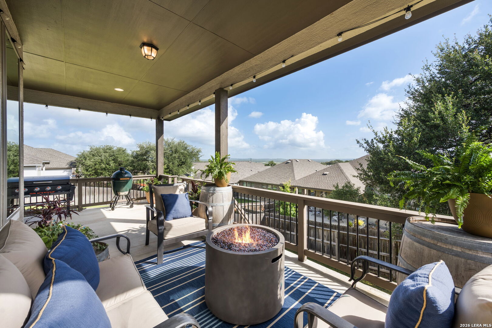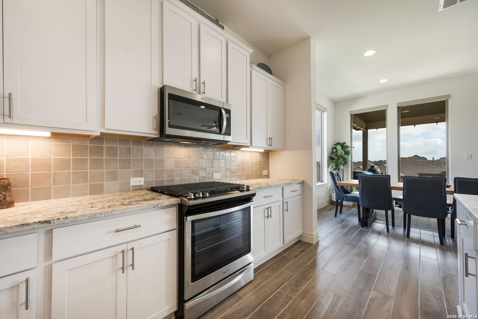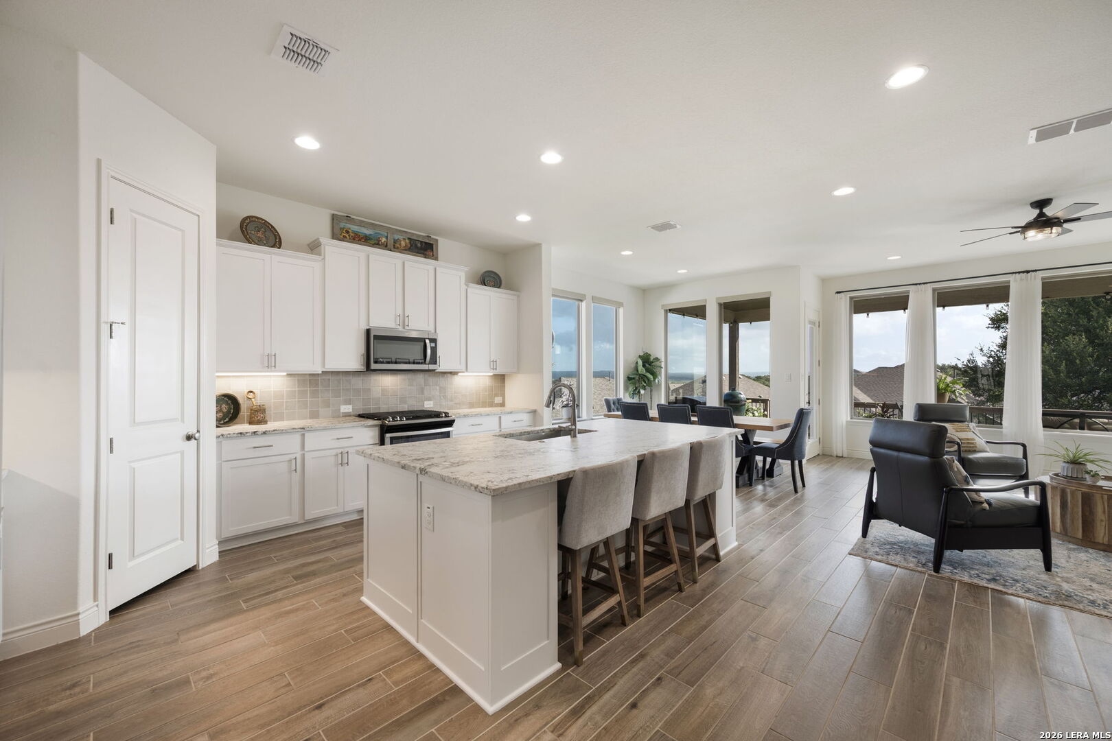 Welcome to 1159 Cadogan Squire in the desirable, gated community of Kinder Ranch - where peaceful Hill Country views meet truly livable luxury. From the moment you arrive, the home reflects thoughtful care and clean architectural design. Inside, high ceilings and wood-look tile floors create an atmosphere that feels both refined and welcoming. The open-concept living space is anchored by a striking accent wall and flows seamlessly into a beautifully appointed kitchen featuring granite countertops, a generous island, stainless steel appliances, and abundant cabinetry - designed for effortless entertaining and everyday connection. The private primary suite offers a true retreat, complete with a bay-style window, freestanding soaking tub, dual granite vanities, and a glass-enclosed walk-in shower - blending comfort with elevated finishes. Large windows frame serene views - yet unlike many view lots, this one gives you usable outdoor space. The covered patio and fenced yard offer room to host, play, garden, or simply unwind at sunset. It's the rare combination of scenic backdrop and everyday functionality. Life in Kinder Ranch offers gated privacy, walking trails, and neighborhood amenities, while everyday conveniences are just minutes away - grocery runs to H-E-B, workouts at LifeTime or Orangetheory, and shopping and dining at the Village at Stone Oak retail center. Enjoy quick access to Stone Oak favorites, distinctive Hill Country dining, and major highways connecting you to the best of San Antonio. This is more than a home with a view - it's a home where design, comfort, and lifestyle come together beautifully.