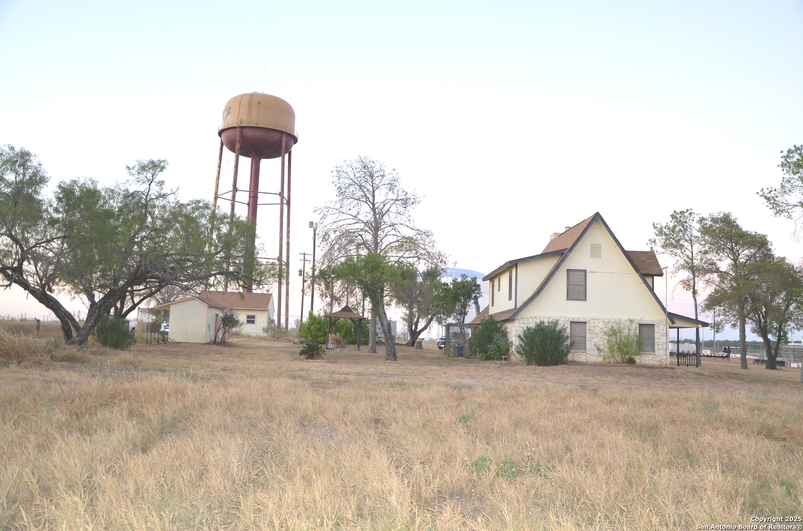 Spacious Hilltop home on nearly 4 acres - City views with NO city taxes - known to many as the " Devine's Water Tower 2-story home". Discover the perfect blend of space, comfort and opportunity in this expansive two-story home set on 3.94 acres. Step inside to find 2 generous living areas, a cozy fireplace and inviting game room area with a wet bar - ideal for entertaining and family fun! The primary suite is conveniently located downstairs, offering a private retreat, while the oversized second and third bedrooms upstairs feature a Jack and Jill bathroom, perfect for growing families or guests. Outside, enjoy the room to roam, relax or expand with a detached building in need of some repairs that offers potential rental income, guest quarters, or a home business. Whether you're looking for room to breathe, host or invest, this unique property delivers endless possibilities! Square footage does not reflect an additional 440 sq. feet of living space from the enclosed garage which is now the game room.