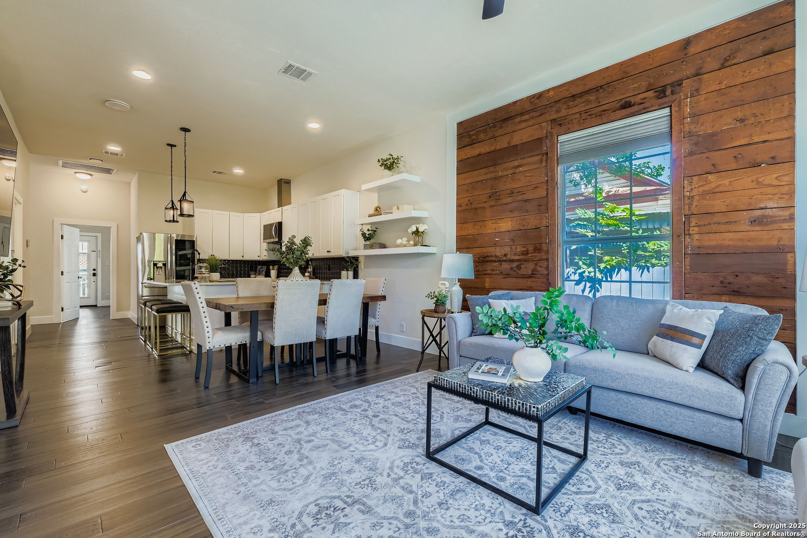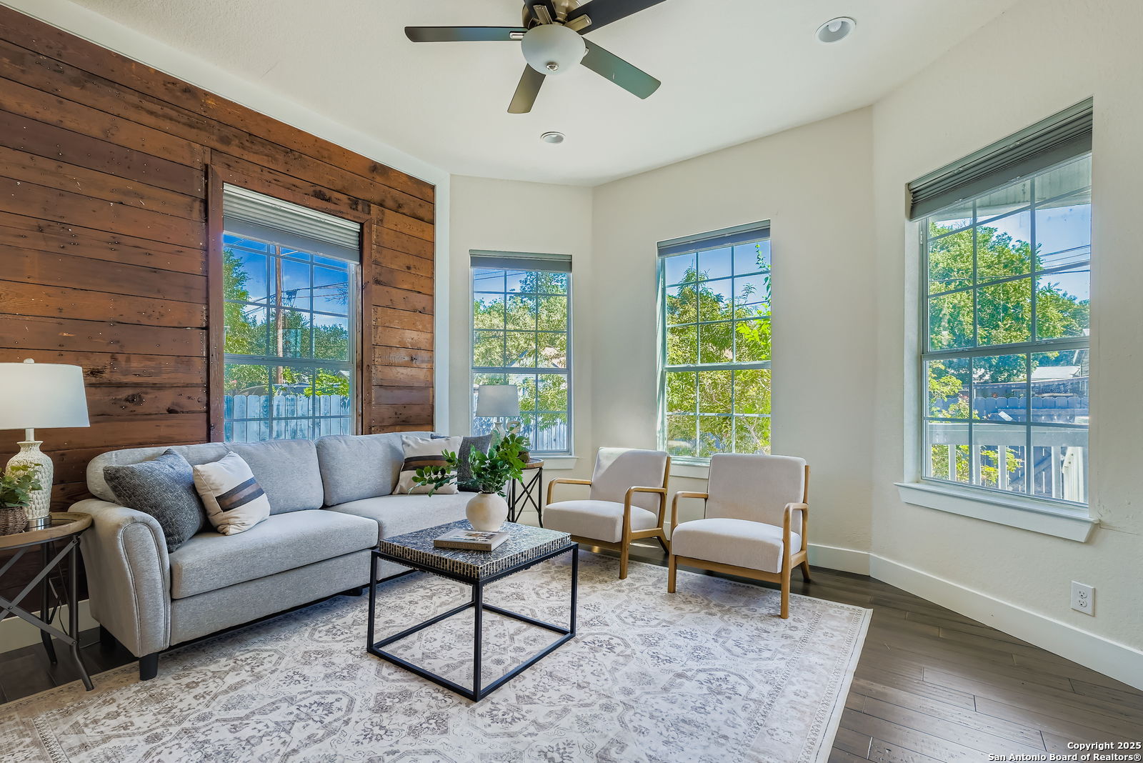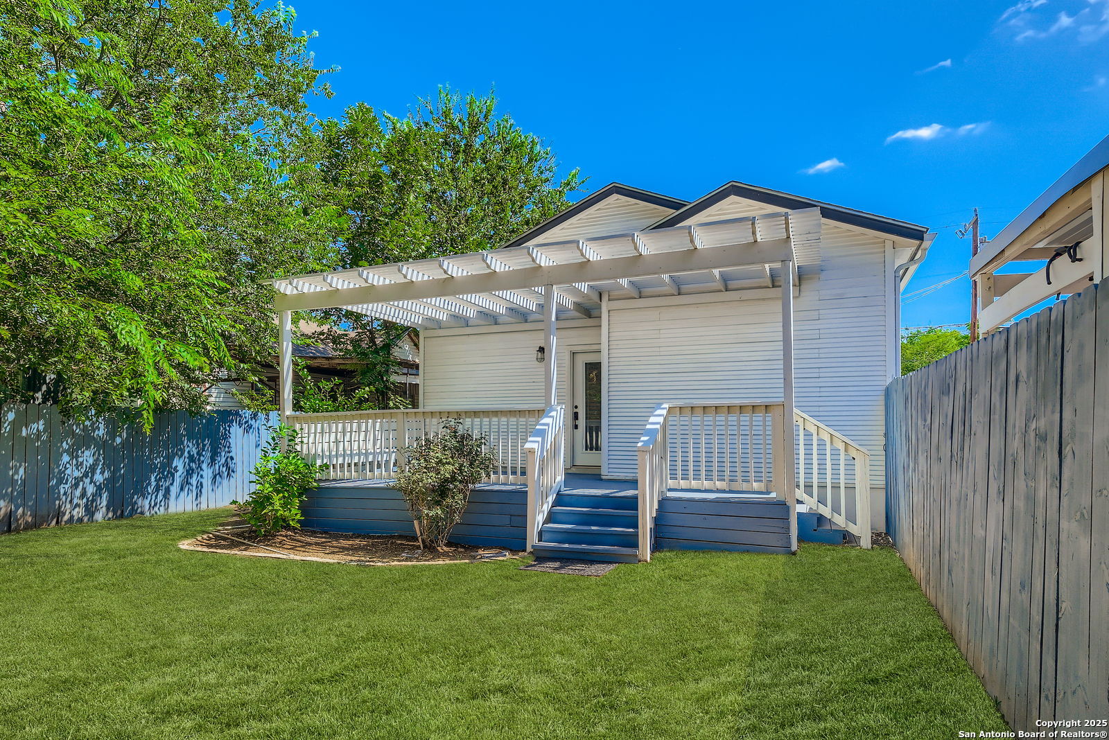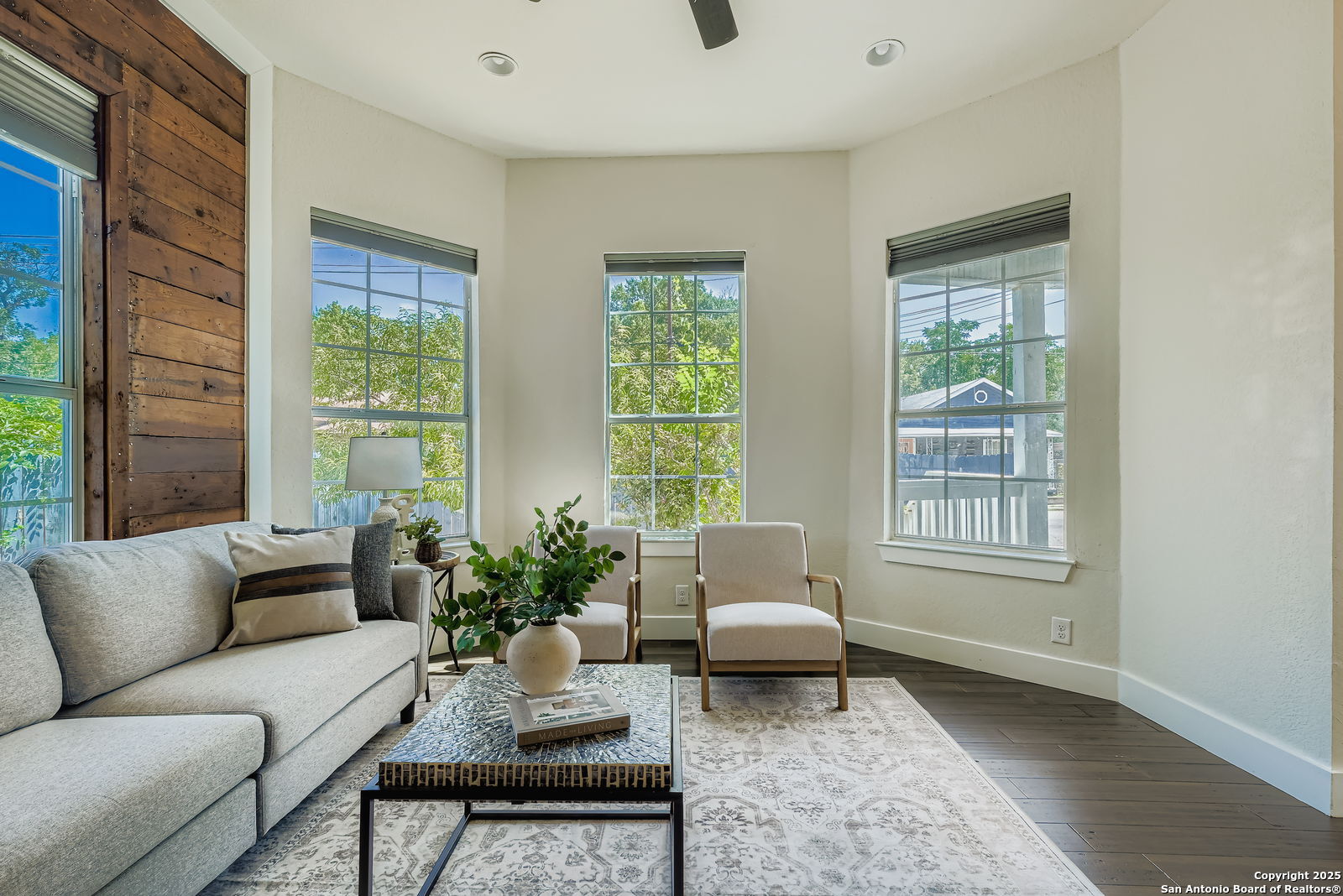 Welcome to a beautifully preserved 1920s gem that blends timeless character with thoughtful modern updates. Nestled in one of San Antonio's most vibrant and culturally rich neighborhoods, this home offers the perfect mix of charm, comfort, and convenience. Step onto the iconic wraparound porch and into a bright, thoughtfully curated interior. The living area features floating shelves, beautiful lighting, and a gorgeous reclaimed wood wall. Custom window treatments - designed specifically for the home - add beauty, privacy, and will remain with the property. The kitchen is equipped with a top-of-the-line appliance package, including the refrigerator, washer, and dryer, AND an 85-inch screen TV - making this home truly move-in ready. The primary suite offers private access to a spacious covered patio - ideal for relaxed mornings or evening gatherings. Major improvements include foundation repairs, home leveling, a new HVAC filtration system, and an advanced water filtration system for comfort and peace of mind. Out back, enjoy a fully enclosed retreat built for both relaxation and functionality - featuring fruit-bearing peach, orange, and lemon trees, a privacy fence perfect for pets, and a covered sitting area just off the primary suite. A detached, air-conditioned workshop adds bonus space for hobbies or storage. The extended shadow stone driveway accommodates four vehicles, and a bold privacy-blue front fence sets the tone for this unique property. The location is a dream - just a 4-minute walk to Il Forno (AMAZING pizza!), a 10-minute stroll to Kunstler Brewing, and a short bike ride to SoFlo, King William, and Southtown - where San Antonio's creative energy shines through its art, culture, and world-class dining. This is more than a home - it's a lifestyle.
