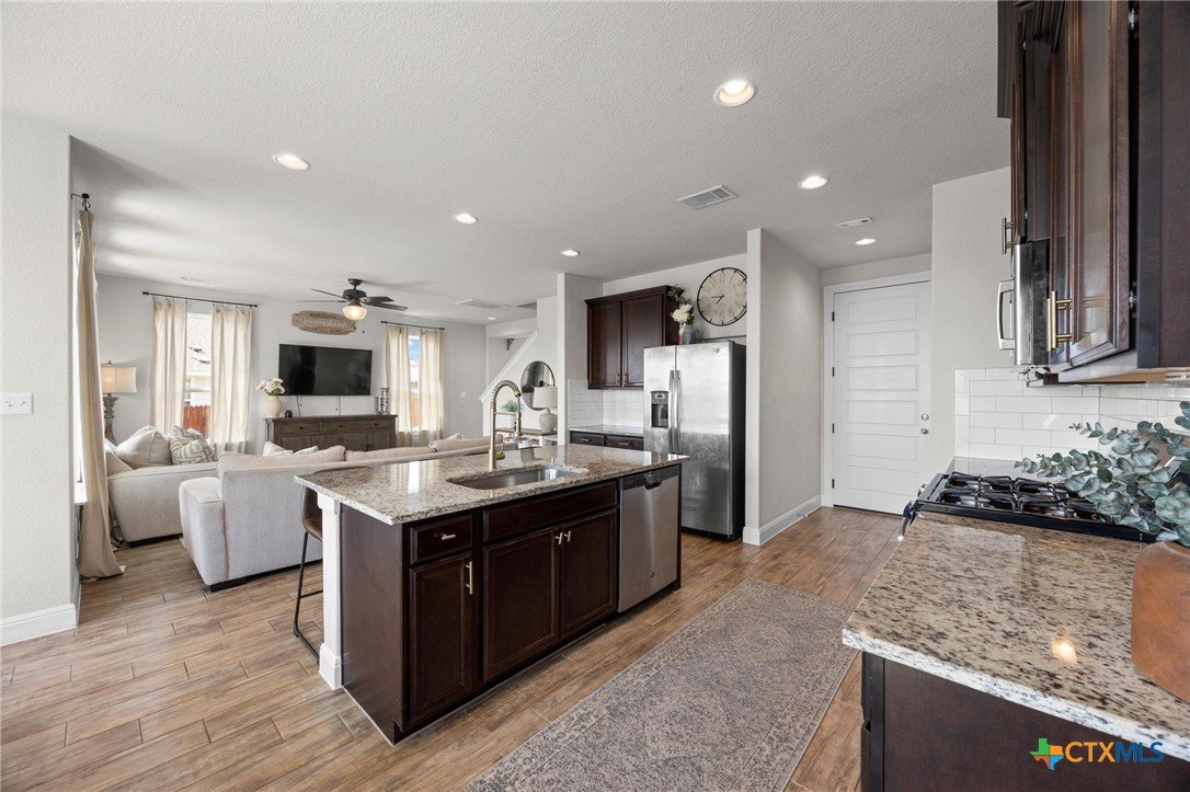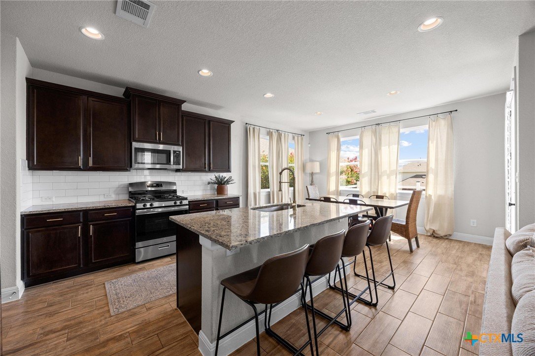 Nestled in a quiet neighborhood, this beautifully maintained traditional home exudes timeless curb appeal. The welcoming entryway is filled with natural light that leads to the stunning open concept living area. A perfect blend of comfort, style and functionality. Bathed in natural light from the large windows, this expansive space features a seamless flow between the living room, dining area and kitchen. neutral tones and wood looking tile create modern yet inviting atmosphere. While recessed lighting throughout creates a bright and streamlined look. Flowing seamlessly and thoughtfully positioned just off the kitchen, the spacious dining area offers ample room for a large table. Chef's kitchen features an airy layout, stainless steel appliances, oversized sink, granite countertops and an abundance of cabinetry. The primary suite is the perfect blend of comfort and luxury with enough space for additional seating. The En-Suite bathroom includes dual vanities and a tub/shower convo. Connected to the bedroom is a large walk-in closet, designed with both function and style in mind. The outdoor space boasts a large newly stained deck and privacy fence as well as a lounge area overlooking a beautifully landscaped and one of the biggest yards in the master planned community. Enjoy resort-style swimming pools, scenic trails, peaceful parks and fun playgrounds. Showings available starting Friday June 27th, 2025 at 2:00pm *OPEN HOUSE SATURDAY JUNE 28TH AND SUNDAY JUNE 29TH FROM 1:00- 3:00PM*