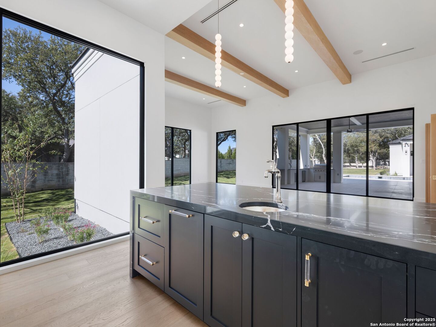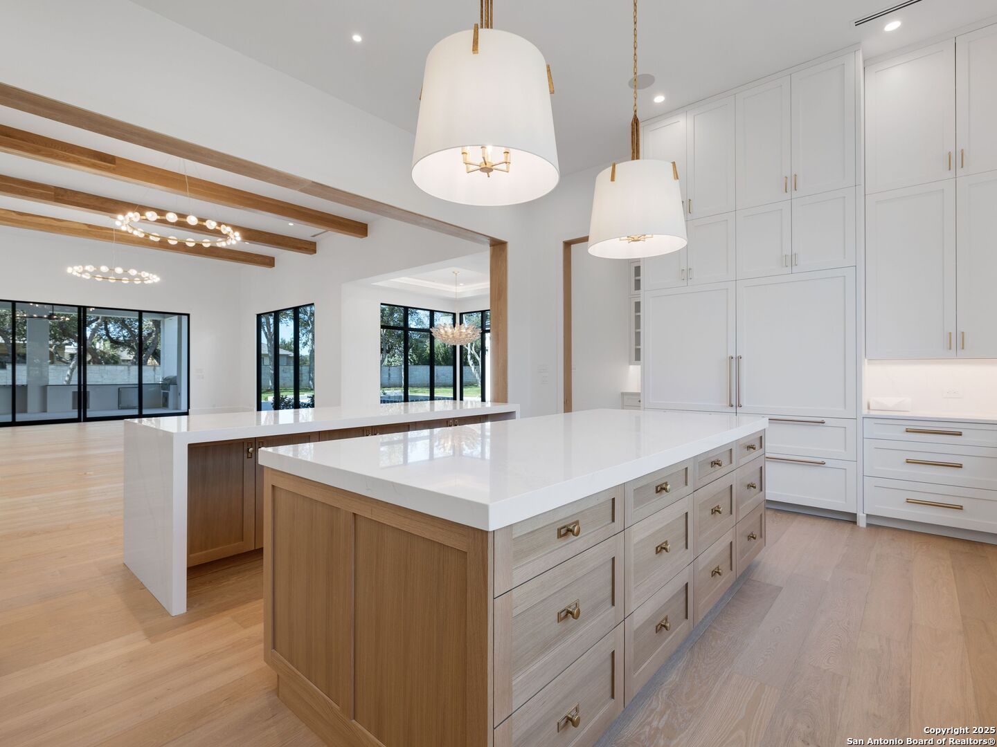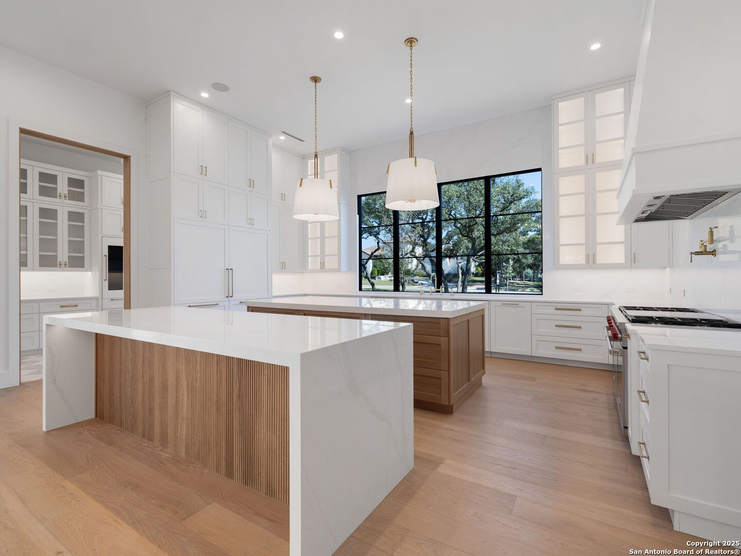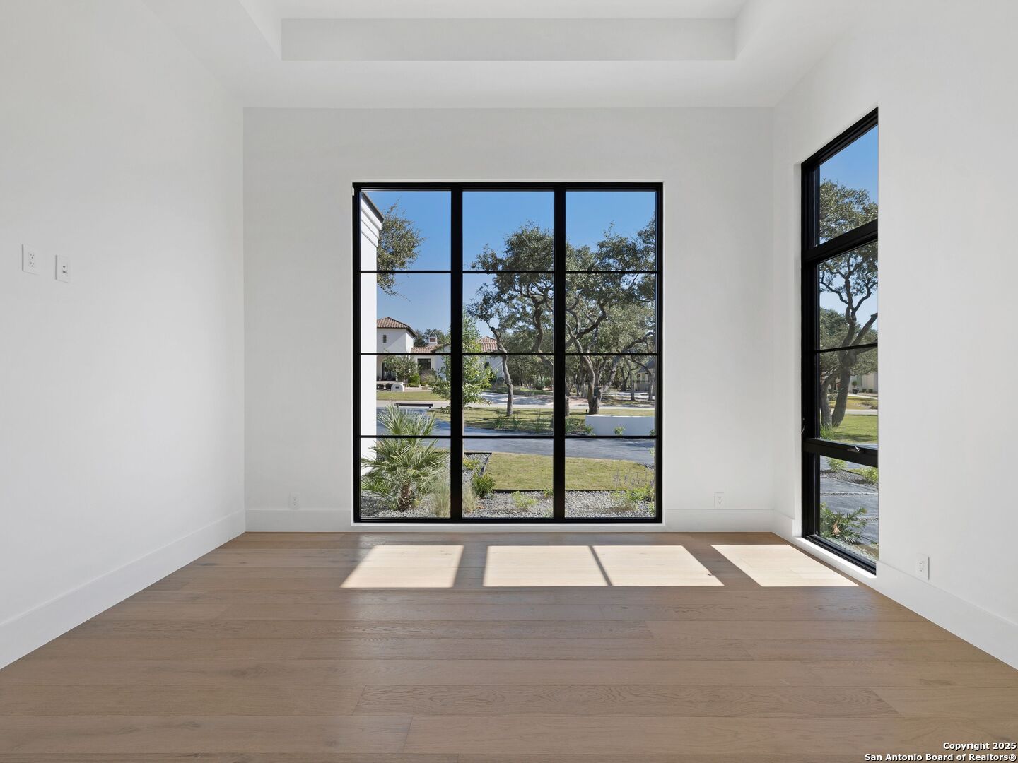 A brand new transitional estate by G Core Construction set within the coveted gates of Huntington. This residence is composed with scale, precision, and refined contemporary detailing throughout. Floor to ceiling glass floods the interiors with natural light, framing lush green views and emphasizing the home's clean architectural lines. Inside, a curated palette of European white oak floors, smooth finish walls, custom millwork, architectural ceiling treatments, designer lighting, and exotic stone selections sets an elevated tone from the moment you enter. The chef's kitchen is anchored by professional grade stainless steel appliances, oversized double islands, and a counter height breakfast bar, opening directly to the family room highlighted by a stone gas fireplace and soaring ceilings. The primary suite is a private retreat with patio access, custom ceiling details, and dual spa inspired baths. Each side features its own design theme with marble accents, mosaic detailing, and expansive boutique style closets with custom cabinetry and glass front displays. Four additional guest suites on the main level each enjoy their own en suite bathroom, providing exceptional comfort and privacy. A dedicated study, a large game room with a full wet bar, and direct outdoor access complete the interior layout. The outdoor setting is resort caliber with a premier pool and spa, a large covered patio, a full outdoor kitchen, and warm ceiling accents designed for year round living and entertaining.