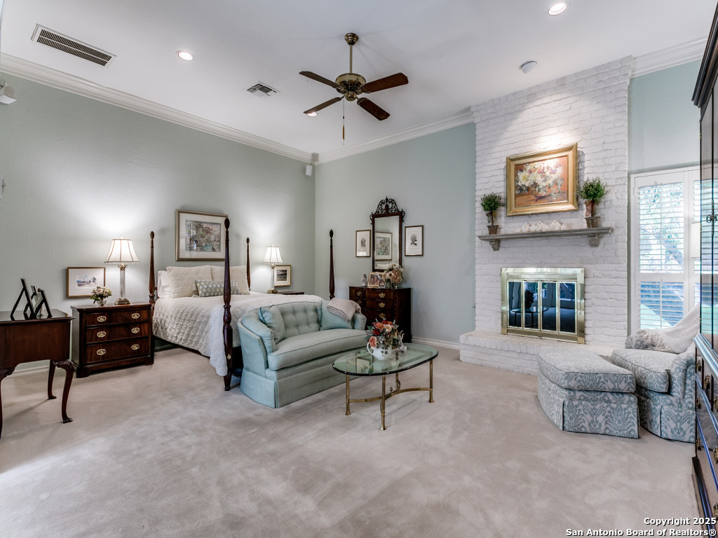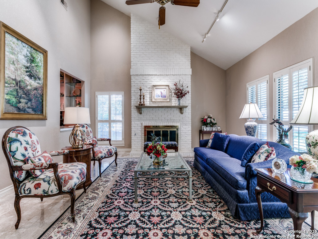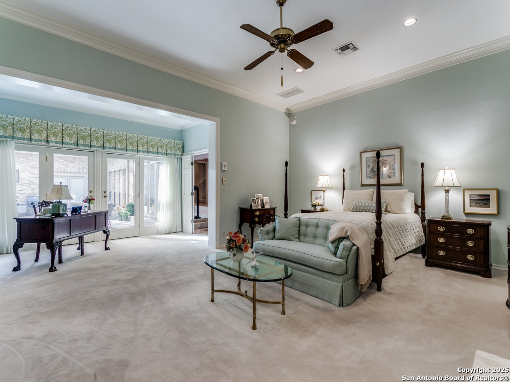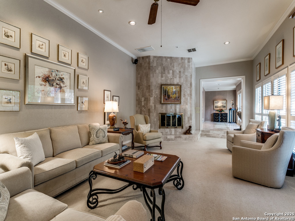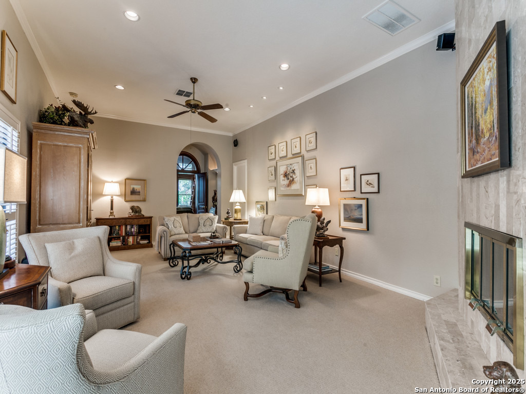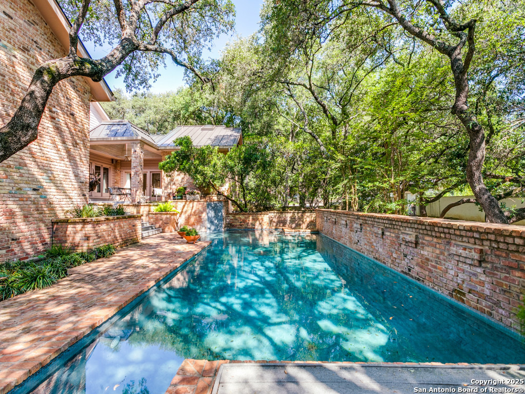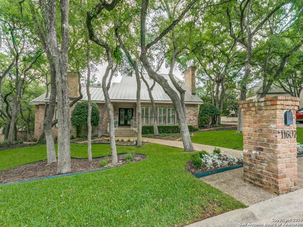 Nestled among lush lawns and mature oaks, this beautifully designed home in the exclusive manned-gated Elm Creek community offers security, privacy and timeless charm. With 5 bedrooms,4 baths, and 2 half baths, the layout includes a spacious primary suite and private guest suite on the main floor. The primary retreat features a fireplace, sitting area, dual walk-in closets, separate vanities, a garden tub and walk-in shower. The guest suite offers private access to the backyard oasis. Perfect for entertaining, the home boasts three fireplaces, a formal living room with a built-in bar, a cozy family room with pool views and a chef's kitchen with granite counter tops, stainless appliances, custom cabinetry, wine and spice drawers. Additional features include an office with built-in desks and bookshelves, an exercise room, three-car garage and a mosquito misting system . The backyard is a private paradise with a pool, spa, water feature and spacious deck for entertaining.