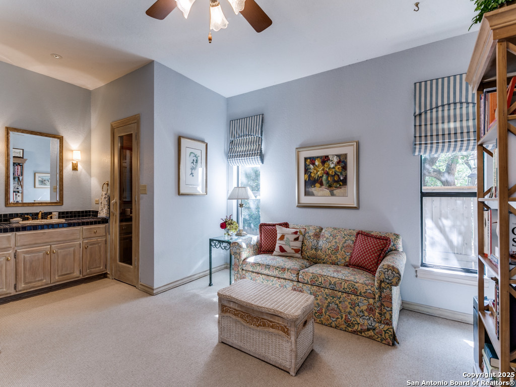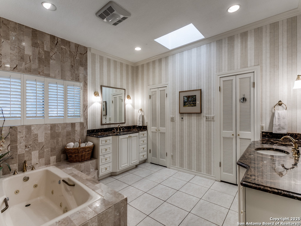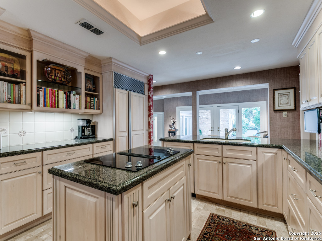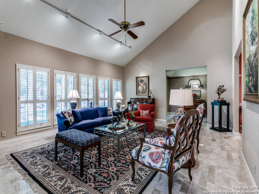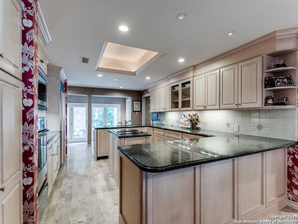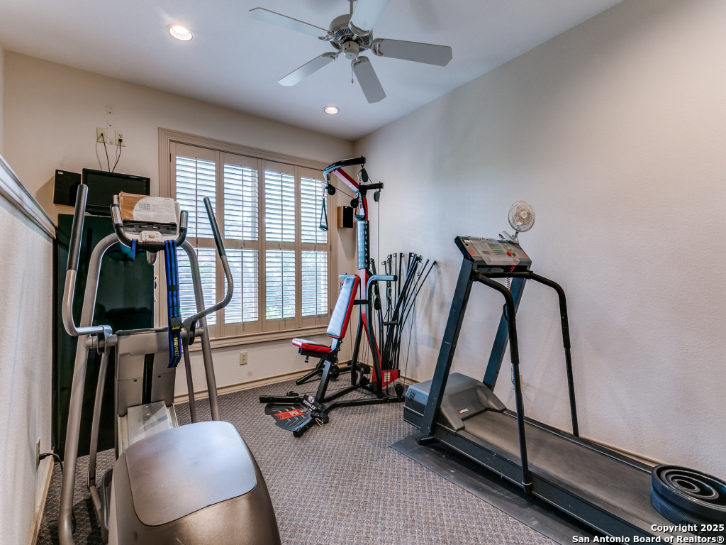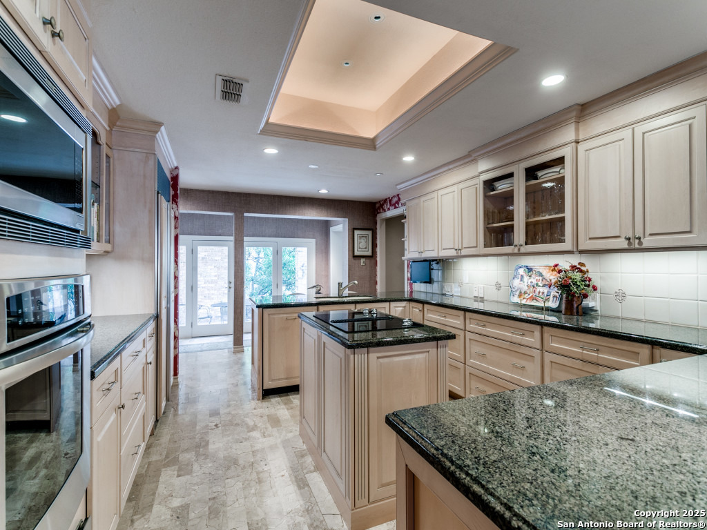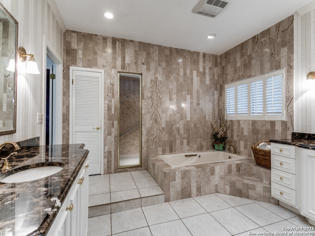Nestled among lush lawns and mature oaks, this beautifully designed home in the exclusive manned-gated Elm Creek community offers security, privacy and timeless charm. With 5 bedrooms,4 baths, and 2 half baths, the layout includes a spacious primary suite and private guest suite on the main floor. The primary retreat features a fireplace, sitting area, dual walk-in closets, separate vanities, a garden tub and walk-in shower. The guest suite offers private access to the backyard oasis. Perfect for entertaining, the home boasts three fireplaces, a formal living room with a built-in bar, a cozy family room with pool views and a chef's kitchen with granite counter tops, stainless appliances, custom cabinetry, wine and spice drawers. Additional features include an office with built-in desks and bookshelves, an exercise room, three-car garage and a mosquito misting system . The backyard is a private paradise with a pool, spa, water feature and spacious deck for entertaining.