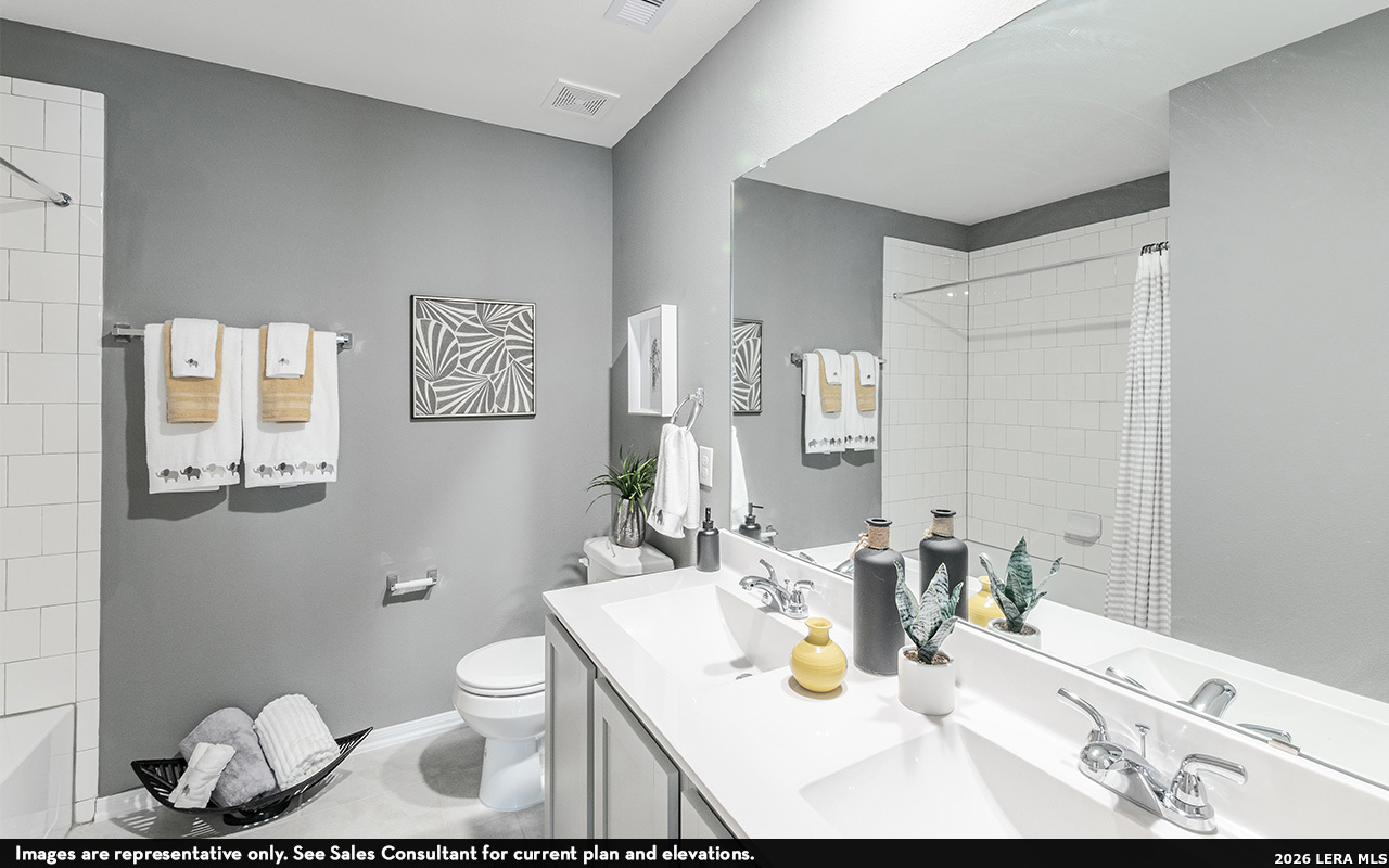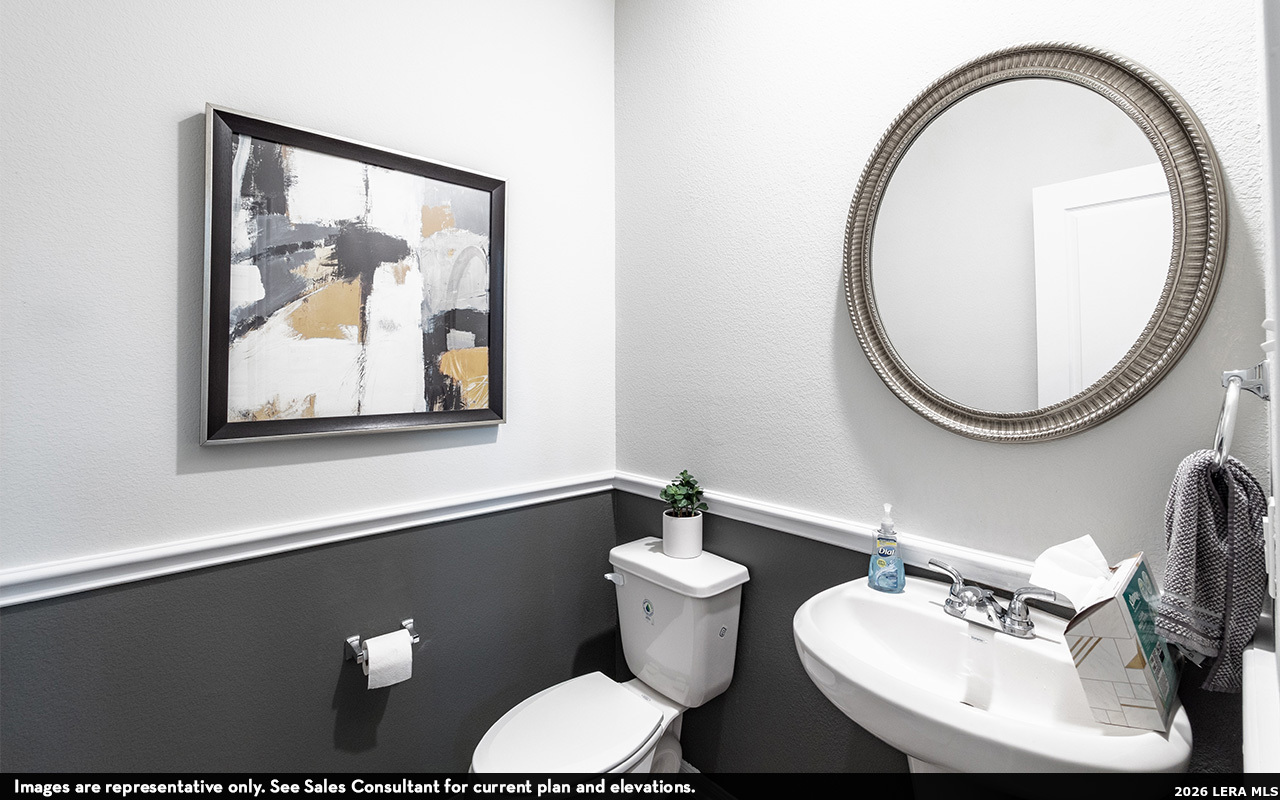 Our grandest home in the Cobalt Series, the Trinity floor plan boasts an impressive two-story floor plan that is sure to suit most any lifestyle. Upon entry, you are first greeted by the private study room that also has the option of transforming into a fifth bedroom if you would rather have the space for more guests to visit. Next, you will find the access to your convenient downstairs powder room, a walk-in utility room, as well as the entry to your two-car garage. Needing more storage for extra tools or supplies? Opt to swap your standard two-car garage for a sizable two-and-a-half-car garage! Down the hall, you will reach the heart of your home - the massive, two-story family room with soaring ceilings and consisting of plenty of natural light. Opening up to the family room is the convenient adjoined kitchen and breakfast area with access to your optional extended covered patio. Your elegant kitchen comes fully equipped with industry-leading appliances, sleek granite countertops with a ceramic tile backsplash, designer light fixtures, and the option to put in an island and extra cabinets if you desire more counterspace. With features like these, you will want to cook every meal! Completing the first floor is your secluded Master suite with your master bathroom containing the cultured marble countertops with option of dual vanities, a shower/bathtub enclosure, and a huge walk- in closet. Upgrade your bathroom space to include a master luxury bath with stand alone shower or a master super shower instead! Both options come with standard dual vanities for your convenience. Finally, up the stairs you will discover a fantastic gameroom perfect for hosting the ultimate game night, as well as the second, third, and fourth remaining bedrooms. The full secondary bathroom also lies upstairs between the second and third bedrooms. The Trinity has the perfect amount of space for the entire family. You won't compromise your comfort and functionality in the Trinity floor plan!