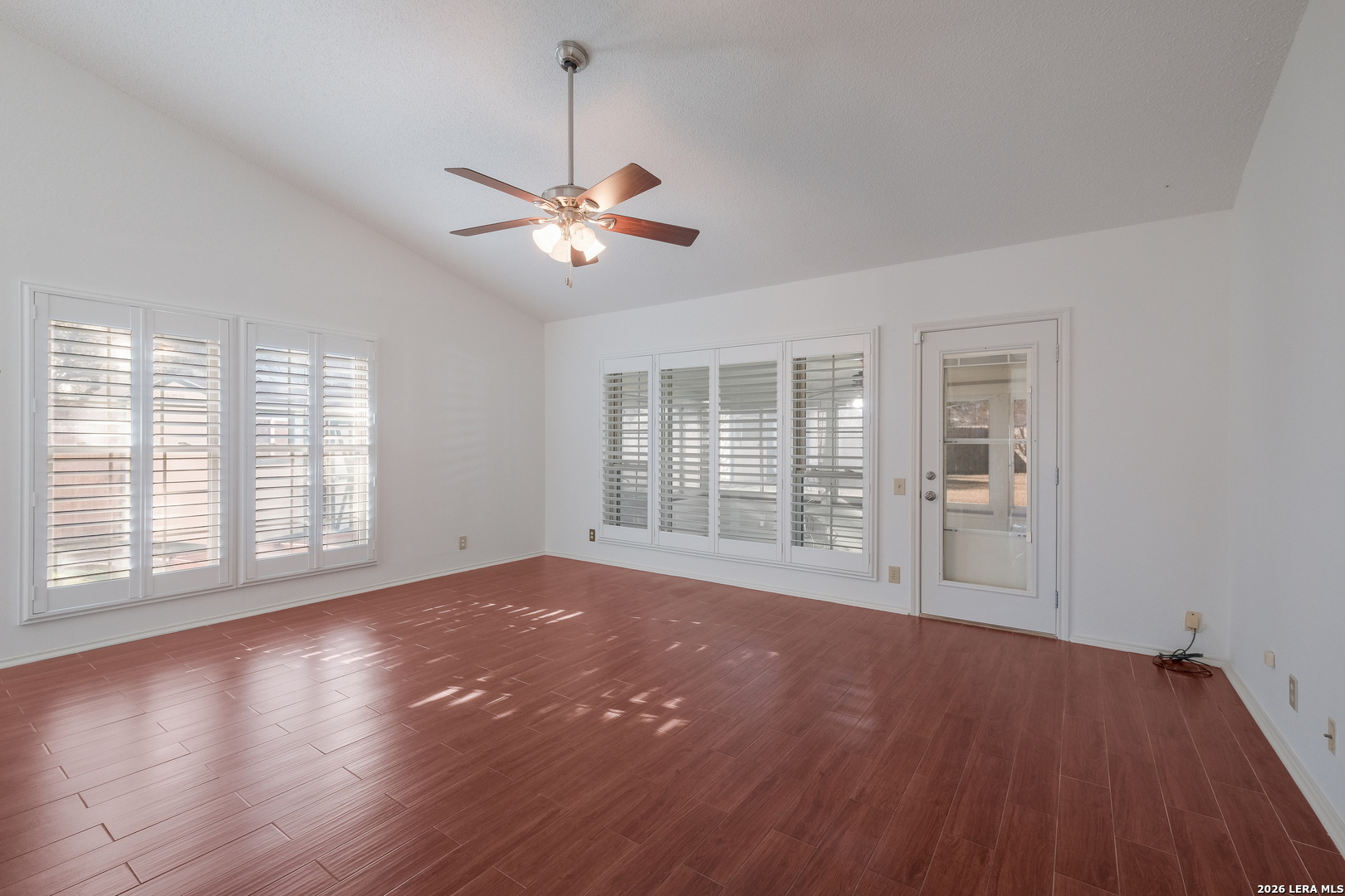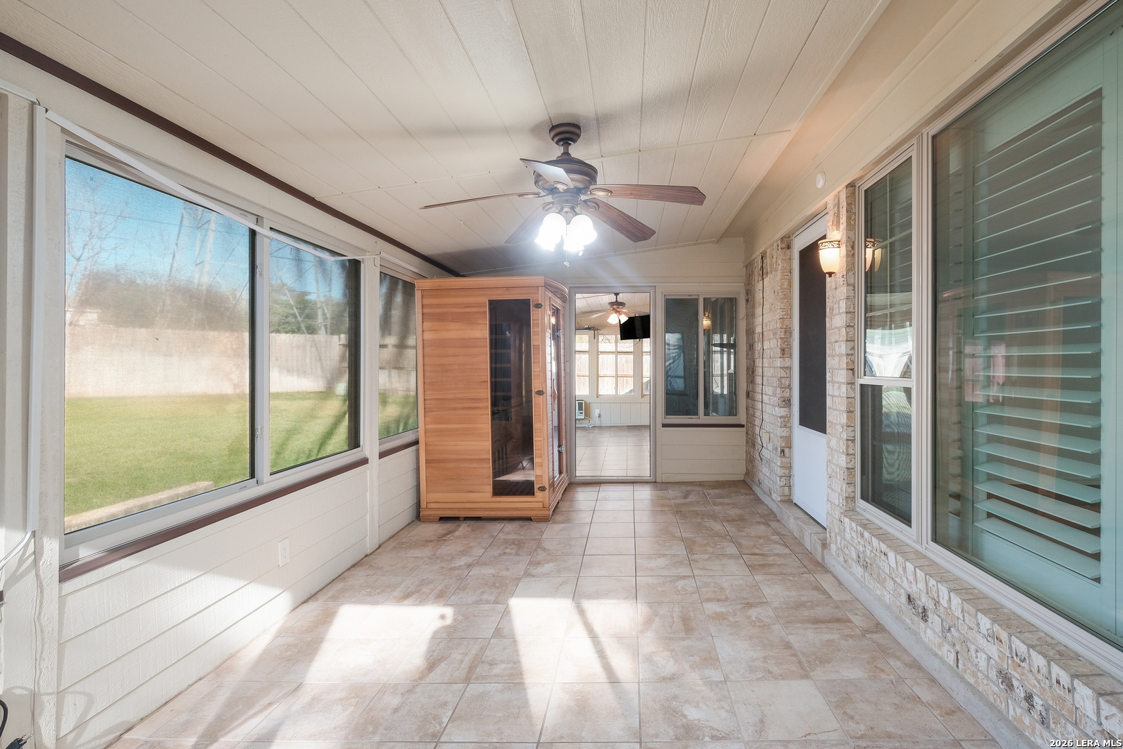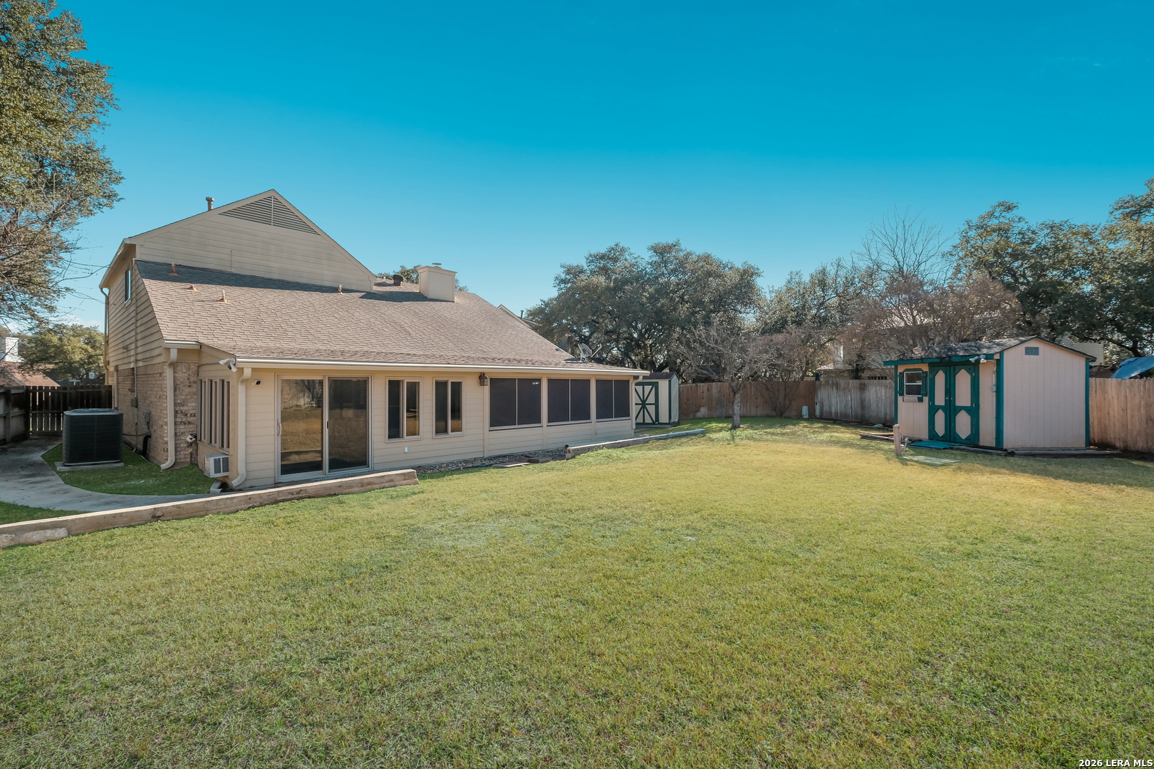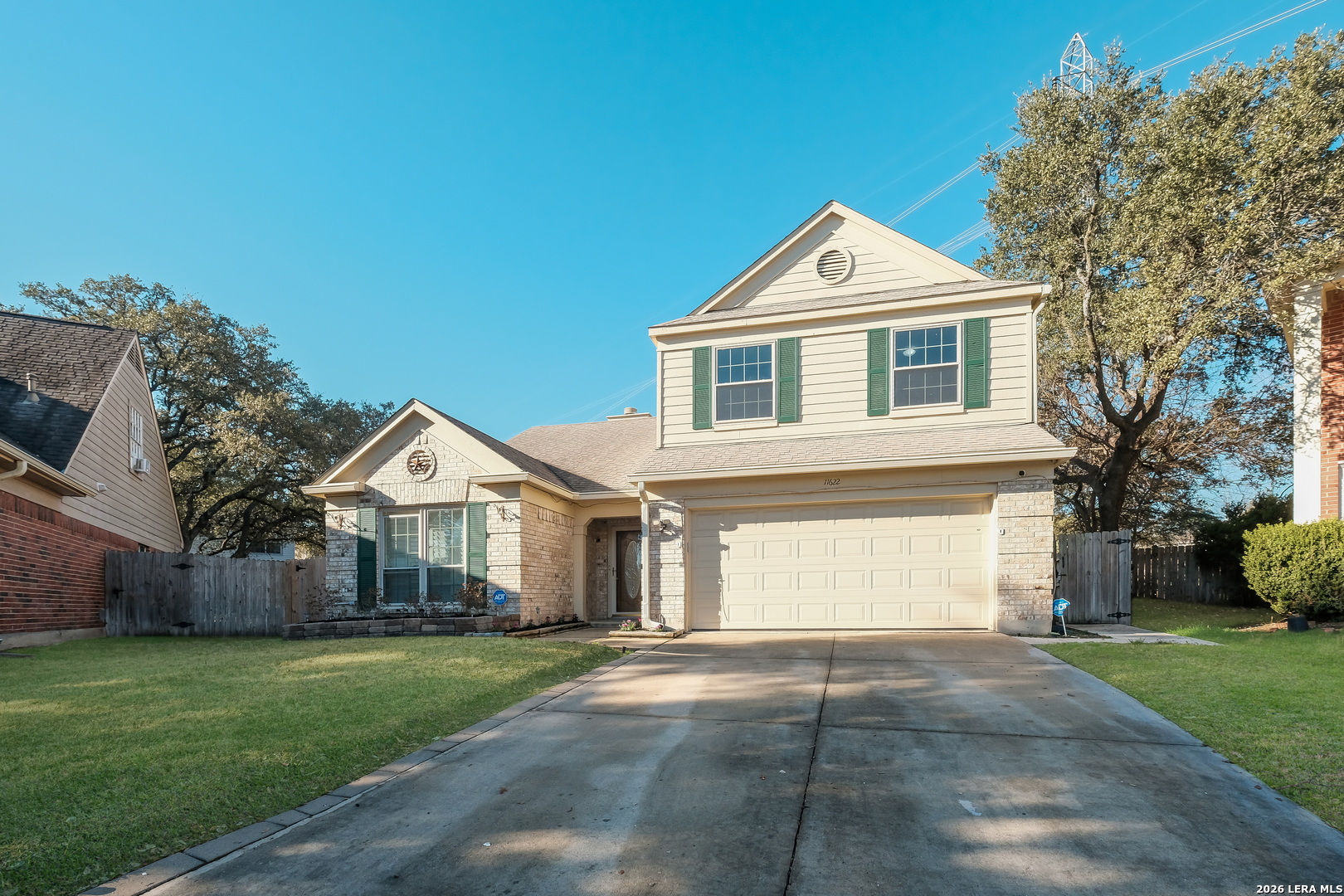 Nestled on nearly a quarter acre in the established Woods of Westcreek community, this well-maintained home offers space, privacy, and a prime Northwest San Antonio location. Inside, an inviting open living and dining area is anchored by a striking fireplace feature wall, creating warmth and definition. Wood-look tile flooring throughout the main level adds modern style and durability. A versatile loft provides flexible space for a home office, media room, or play area, while two attached sunrooms fill the home with natural light and offer space for year-round entertaining, relaxation, or hobbies. The kitchen features solid granite countertops, LG stainless steel appliances, and a vent-a-hood. Upstairs, the remodeled secondary bathroom includes double vanities and elevated countertops. Updates include fresh interior paint throughout (Feb. 2026), new HVAC system (2021), water heater (2024), and double-pane Champion windows (2011). Located on a quiet curve in the street, this home offers reduced through traffic while remaining close to neighborhood amenities including pool, sports courts, parks, and walking areas. Easy access to Loop 1604 makes shopping, dining, and entertainment a breeze. The rare blend of space, upgrades, and privacy makes this home an exceptional find!