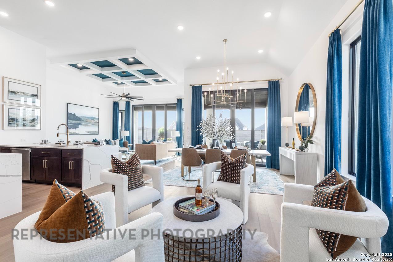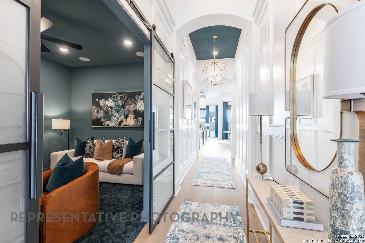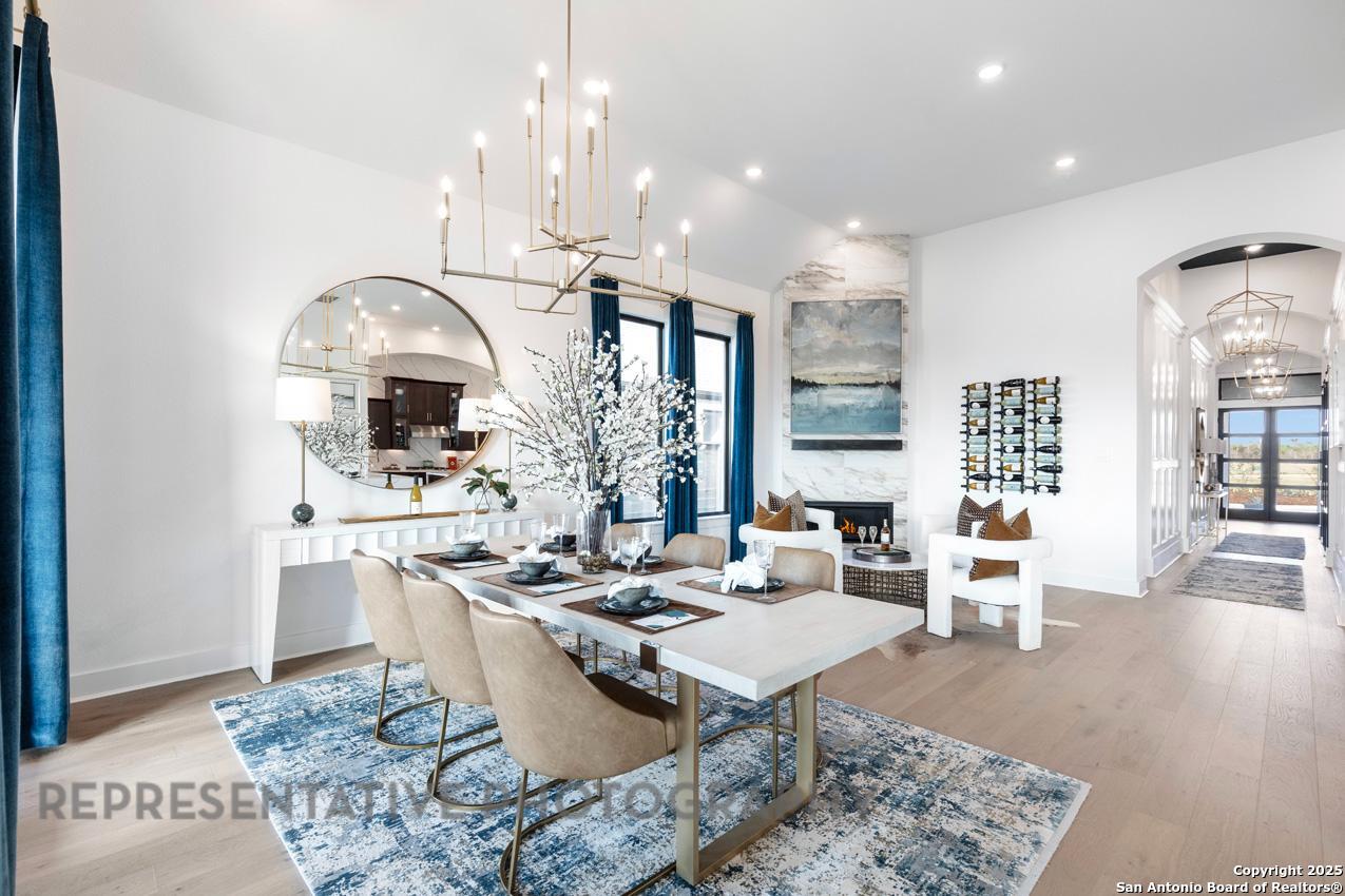 This ONE level home boasts elevated ceiling heights, Entertainment room, Home office, Fireplace, Neutral interior palette with wood floors, Double ovens. Estimate May/June 2026 home completion.