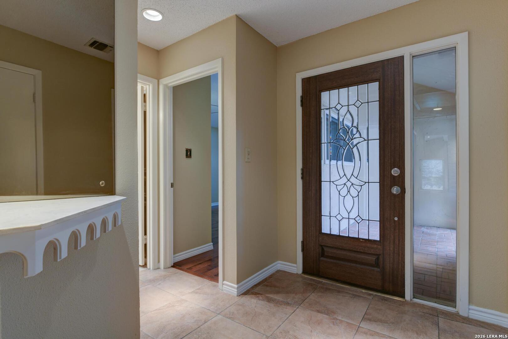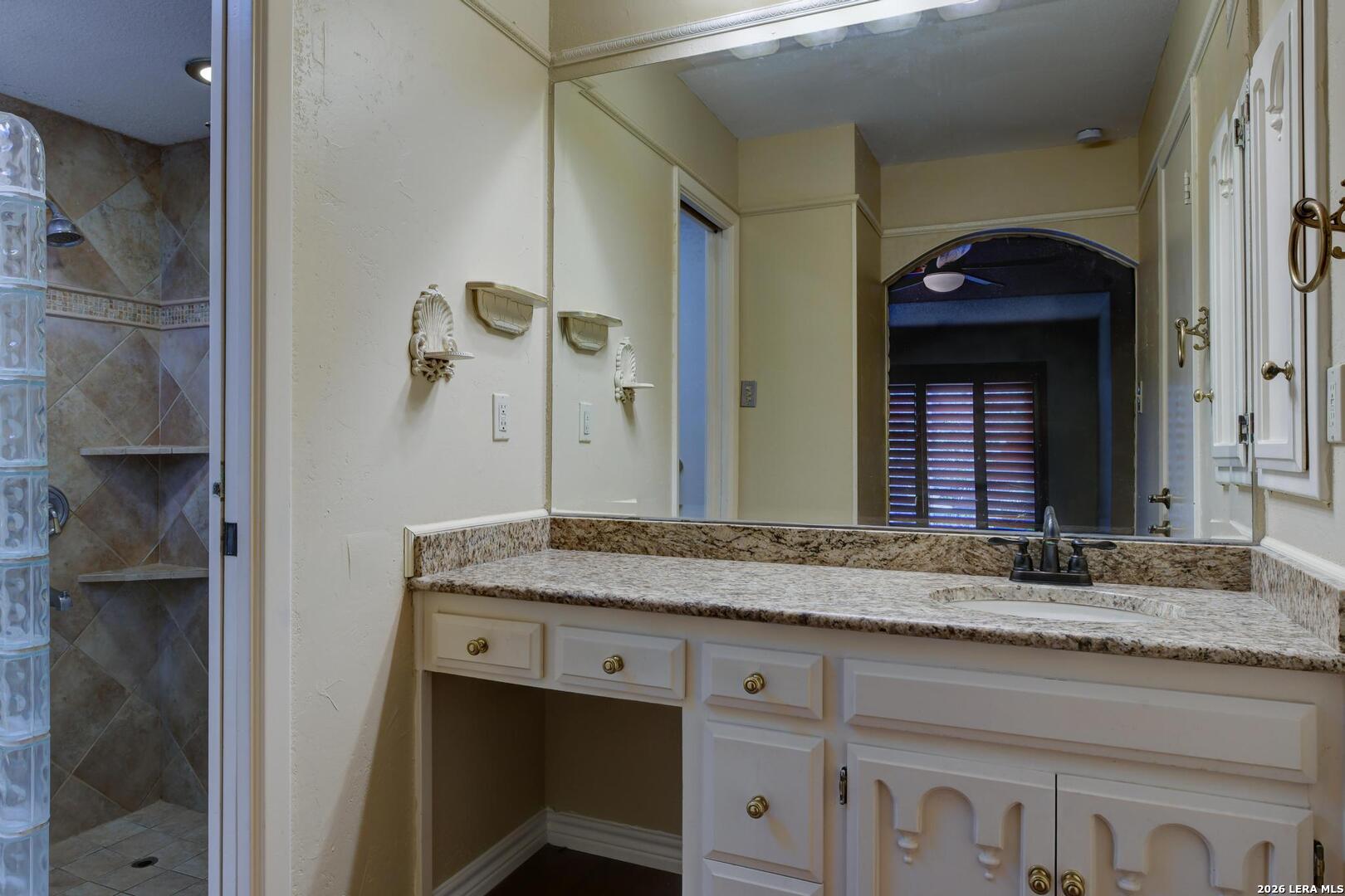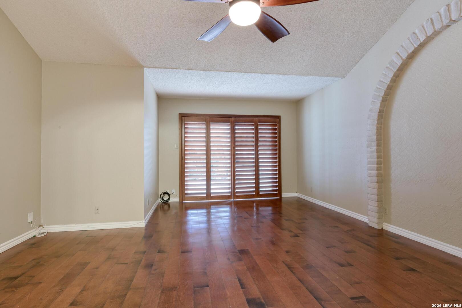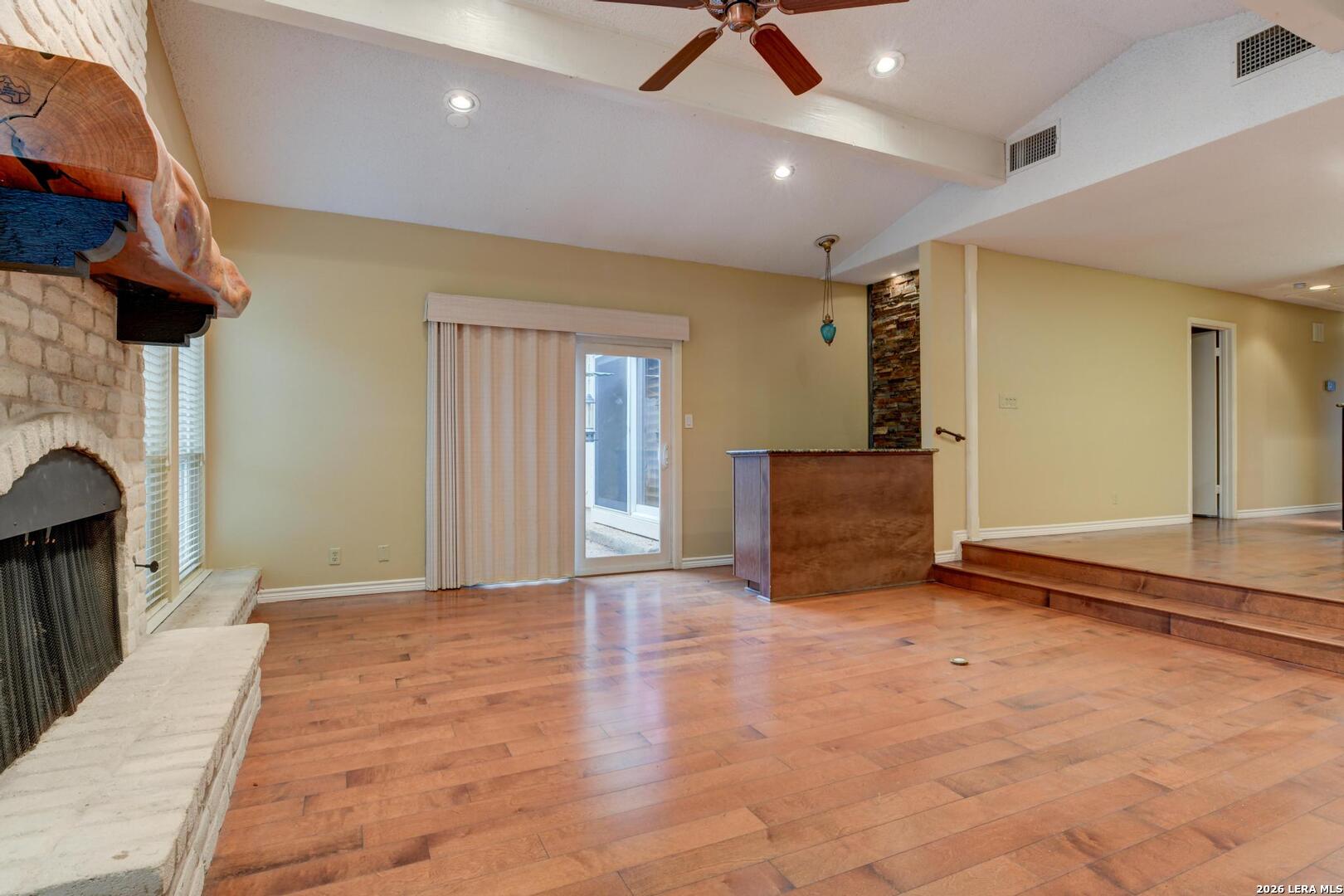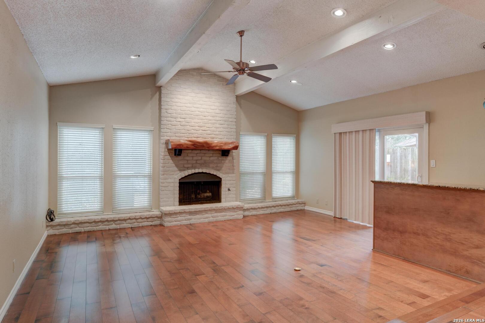 Charming single-story garden home in highly desirable Whispering Oaks backing to a peaceful greenbelt! This well-maintained 2 bedroom, 2 bath home offers an open and versatile floorplan with generous living spaces. The spacious living room (19'5" x 16'4") features a cozy fireplace and flows nicely into the dining area-perfect for entertaining. The kitchen includes granite countertops, stainless steel appliances, microwave, and an inviting breakfast area for casual dining. The large primary suite (18'10" x 15'10") provides plenty of space and comfort with an adjoining private bath, while the second bedroom (12'11" x 13'3") and full bath make an ideal guest room, office, or roommate layout. Beautiful wood floors add warmth and character throughout the home. Enjoy the durability and efficiency of a metal roof and the privacy of a greenbelt lot, offering a quiet natural backdrop rarely found at this price point. Conveniently located near USAA, UTSA, the Medical Center, IH-10, Loop 410, and major shopping and dining. Outstanding value at $300,000 in the established Whispering Oaks neighborhood-perfect for low-maintenance living in a prime San Antonio location.