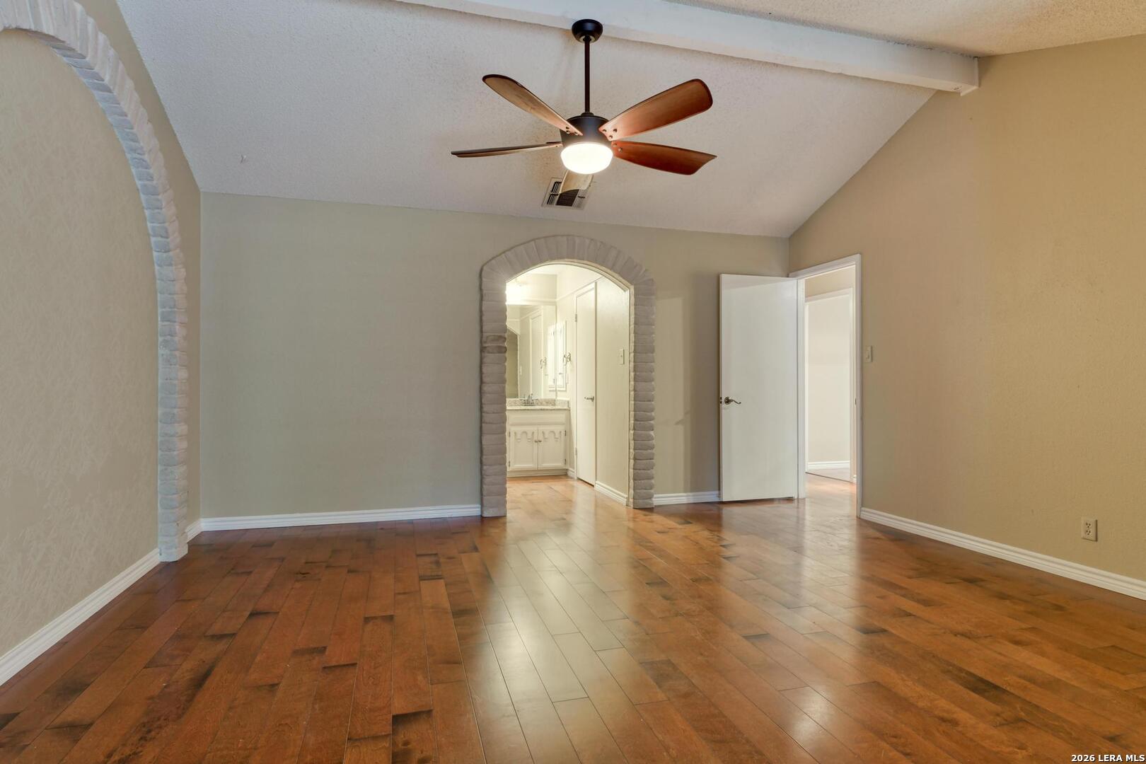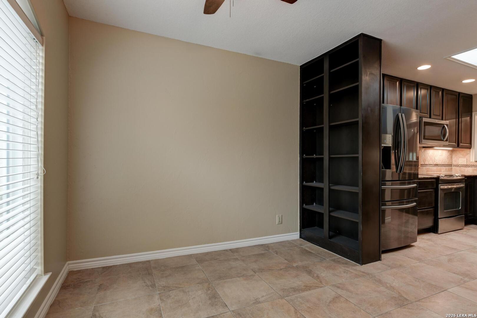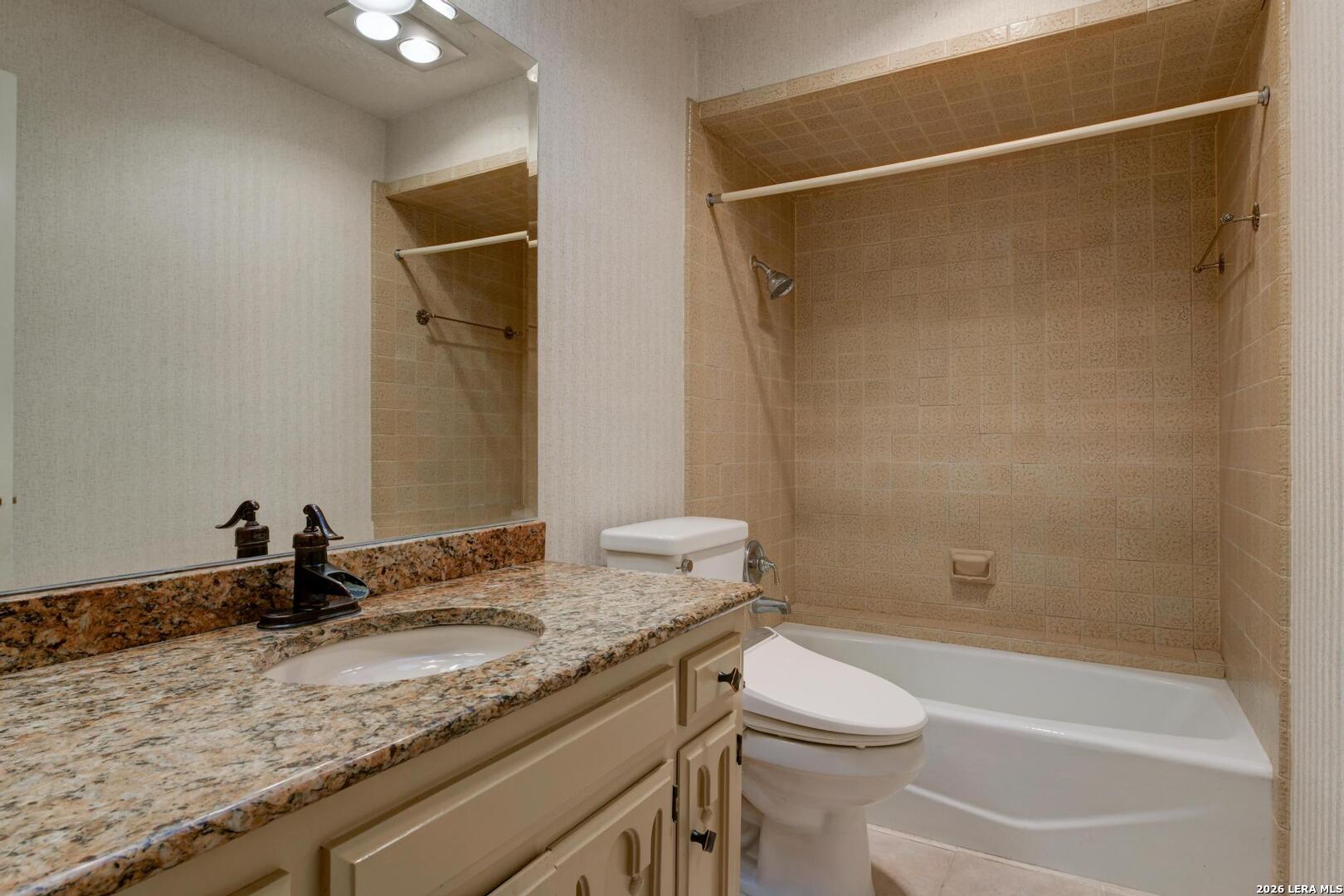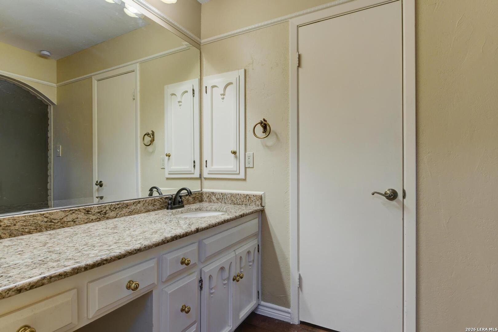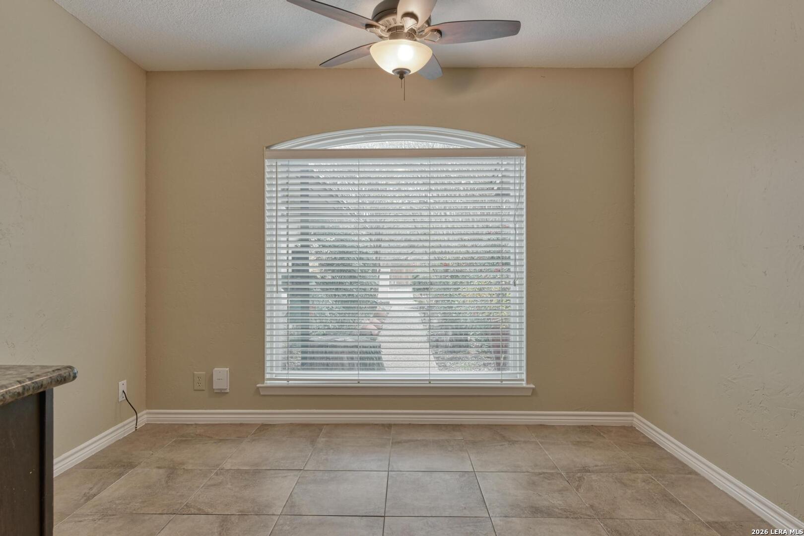 Charming single-story garden home in highly desirable Whispering Oaks backing to a peaceful greenbelt! This well-maintained 2 bedroom, 2 bath home offers an open and versatile floorplan with generous living spaces. The spacious living room (19'5" x 16'4") features a cozy fireplace and flows nicely into the dining area-perfect for entertaining. The kitchen includes granite countertops, stainless steel appliances, microwave, and an inviting breakfast area for casual dining. The large primary suite (18'10" x 15'10") provides plenty of space and comfort with an adjoining private bath, while the second bedroom (12'11" x 13'3") and full bath make an ideal guest room, office, or roommate layout. Beautiful wood floors add warmth and character throughout the home. Enjoy the durability and efficiency of a metal roof and the privacy of a greenbelt lot, offering a quiet natural backdrop rarely found at this price point. Conveniently located near USAA, UTSA, the Medical Center, IH-10, Loop 410, and major shopping and dining. Outstanding value at $300,000 in the established Whispering Oaks neighborhood-perfect for low-maintenance living in a prime San Antonio location.