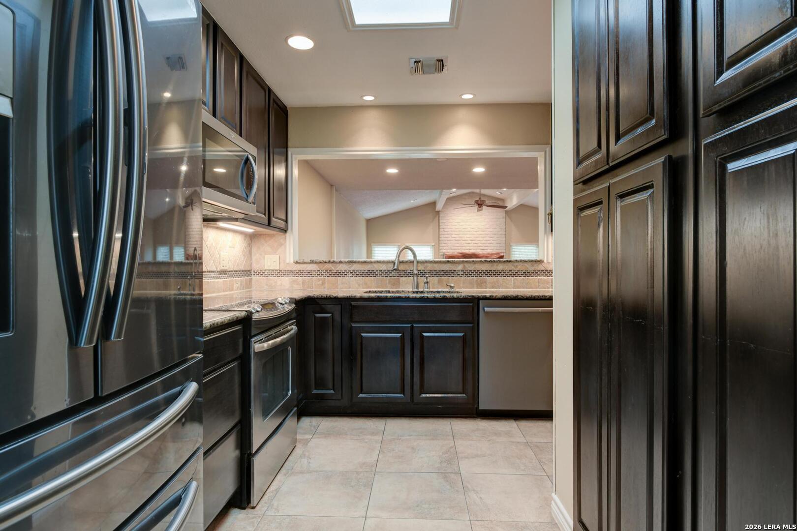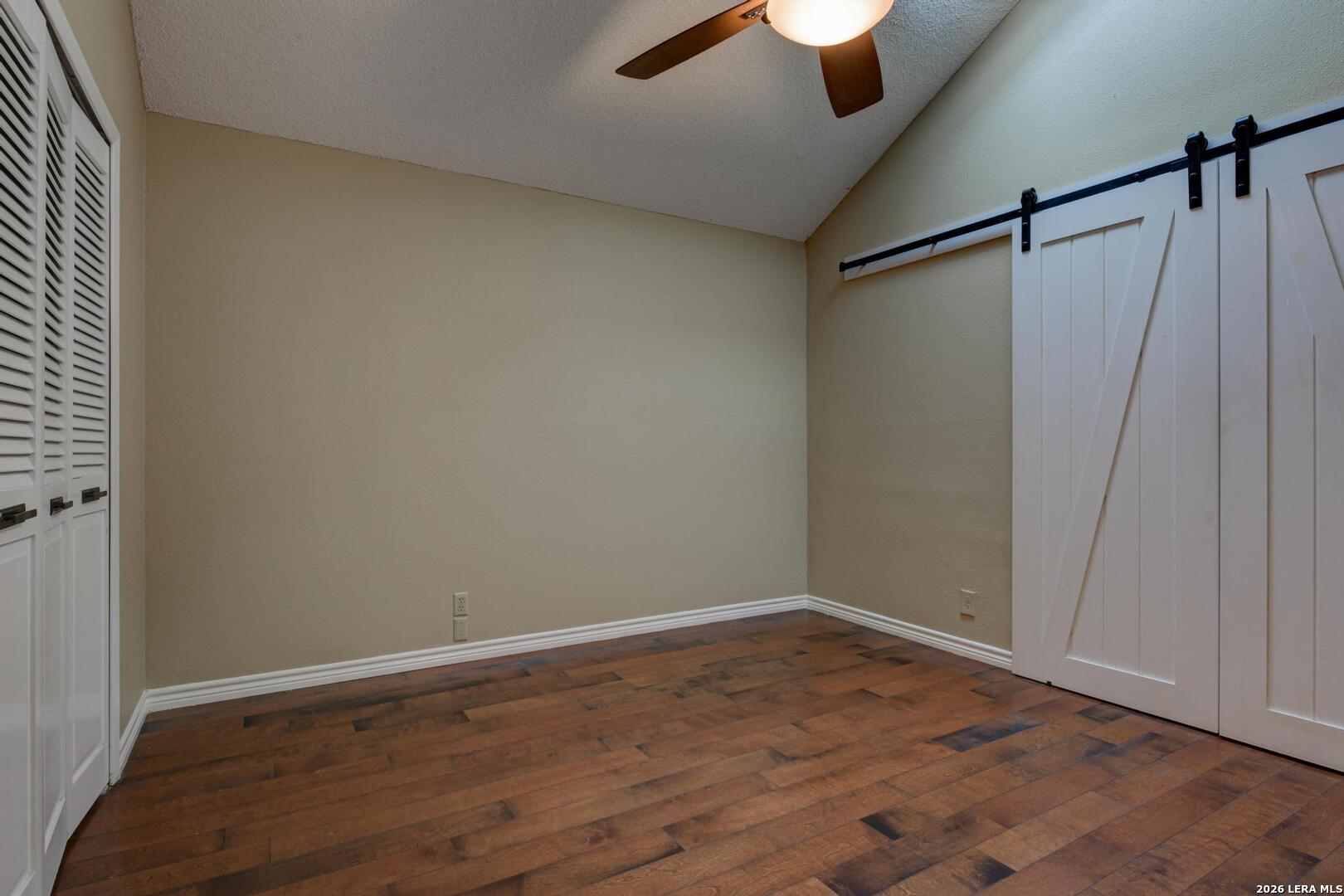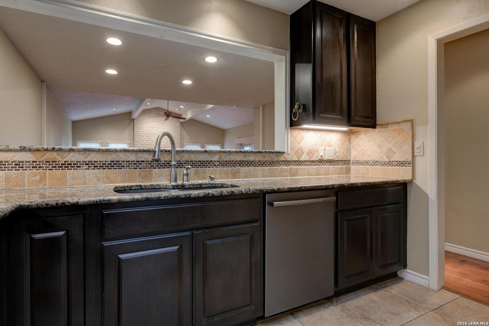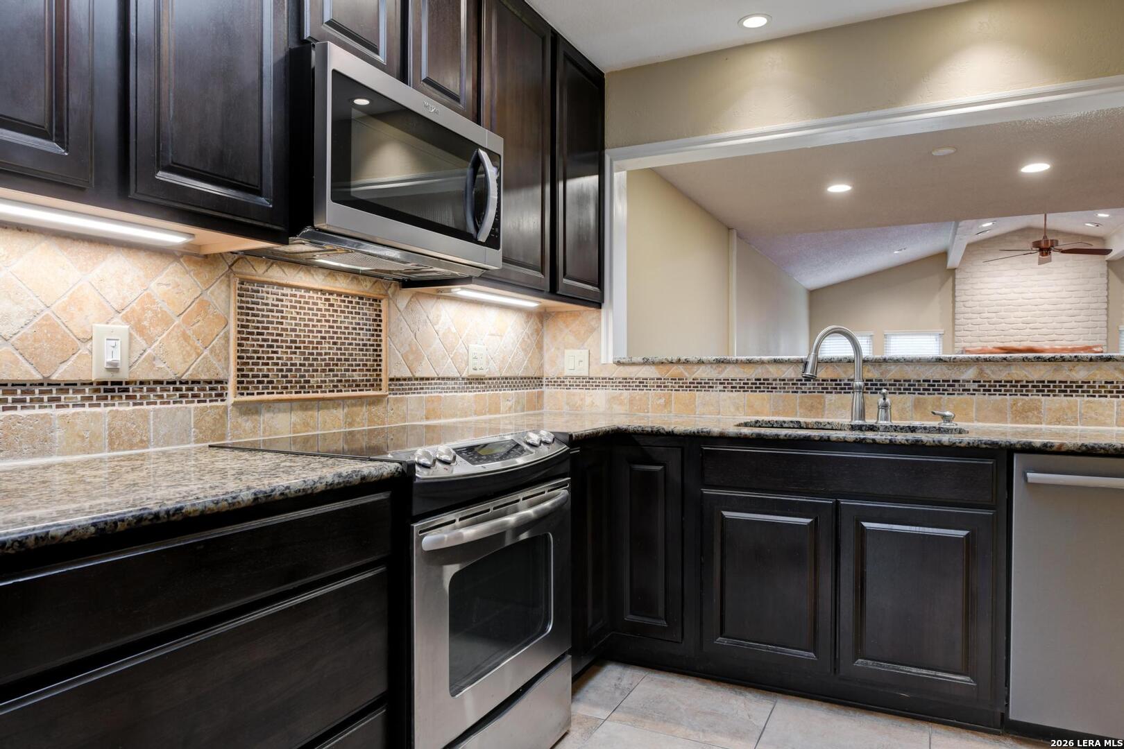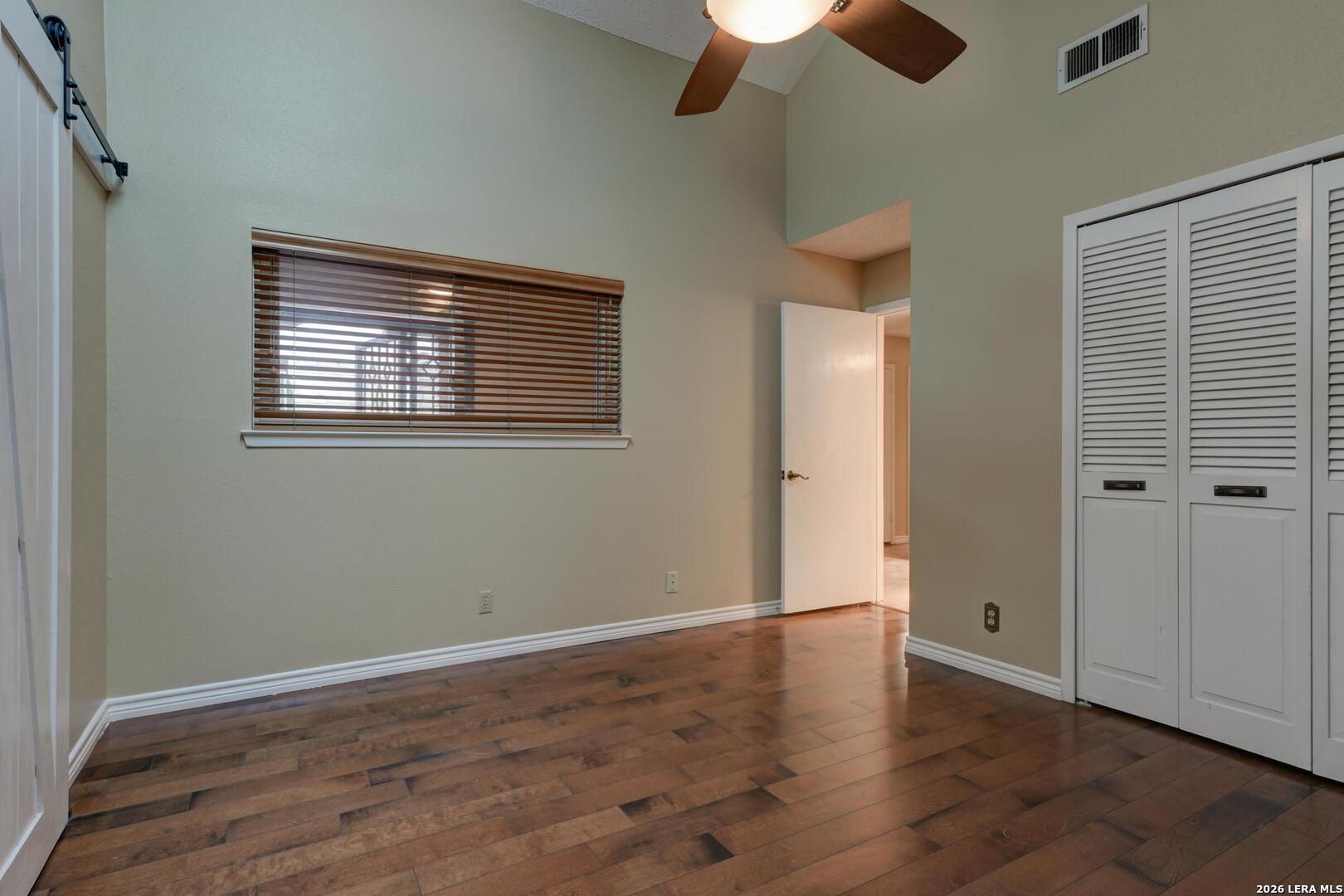 Charming single-story garden home in highly desirable Whispering Oaks backing to a peaceful greenbelt! This well-maintained 2 bedroom, 2 bath home offers an open and versatile floorplan with generous living spaces. The spacious living room (19'5" x 16'4") features a cozy fireplace and flows nicely into the dining area-perfect for entertaining. The kitchen includes granite countertops, stainless steel appliances, microwave, and an inviting breakfast area for casual dining. The large primary suite (18'10" x 15'10") provides plenty of space and comfort with an adjoining private bath, while the second bedroom (12'11" x 13'3") and full bath make an ideal guest room, office, or roommate layout. Beautiful wood floors add warmth and character throughout the home. Enjoy the durability and efficiency of a metal roof and the privacy of a greenbelt lot, offering a quiet natural backdrop rarely found at this price point. Conveniently located near USAA, UTSA, the Medical Center, IH-10, Loop 410, and major shopping and dining. Outstanding value at $300,000 in the established Whispering Oaks neighborhood-perfect for low-maintenance living in a prime San Antonio location.