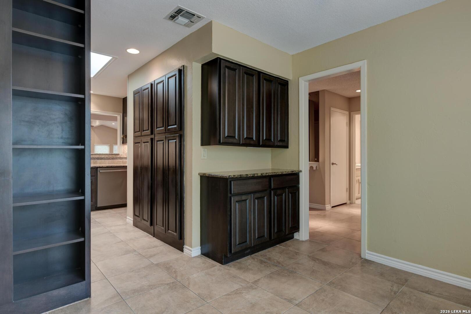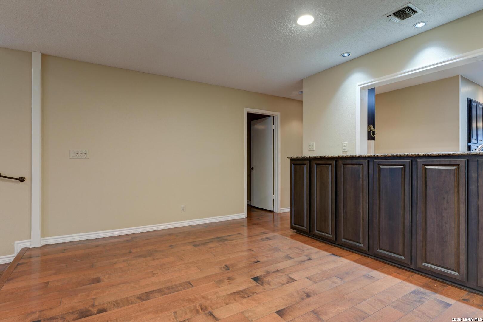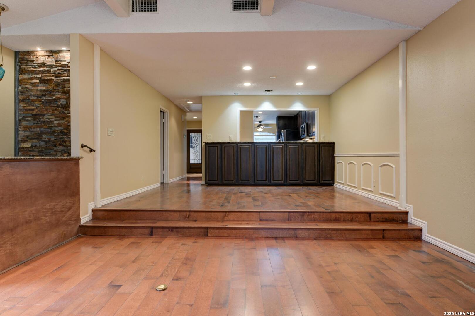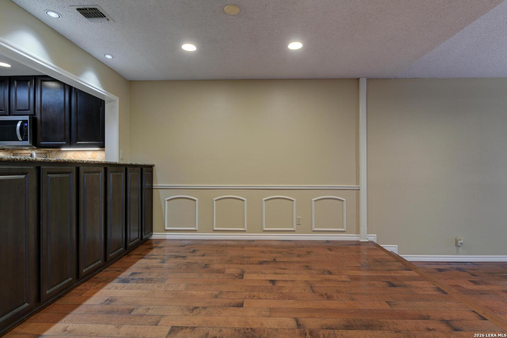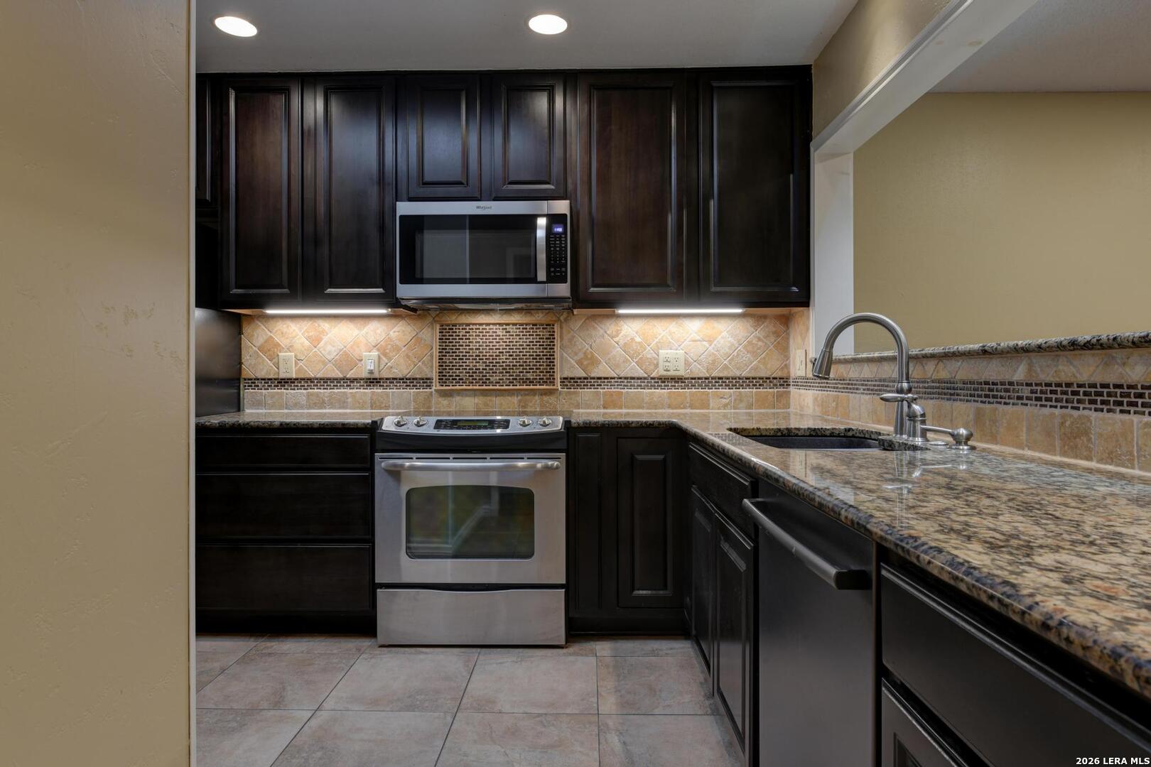 Charming single-story garden home in highly desirable Whispering Oaks backing to a peaceful greenbelt! This well-maintained 2 bedroom, 2 bath home offers an open and versatile floorplan with generous living spaces. The spacious living room (19'5" x 16'4") features a cozy fireplace and flows nicely into the dining area-perfect for entertaining. The kitchen includes granite countertops, stainless steel appliances, microwave, and an inviting breakfast area for casual dining. The large primary suite (18'10" x 15'10") provides plenty of space and comfort with an adjoining private bath, while the second bedroom (12'11" x 13'3") and full bath make an ideal guest room, office, or roommate layout. Beautiful wood floors add warmth and character throughout the home. Enjoy the durability and efficiency of a metal roof and the privacy of a greenbelt lot, offering a quiet natural backdrop rarely found at this price point. Conveniently located near USAA, UTSA, the Medical Center, IH-10, Loop 410, and major shopping and dining. Outstanding value at $300,000 in the established Whispering Oaks neighborhood-perfect for low-maintenance living in a prime San Antonio location.